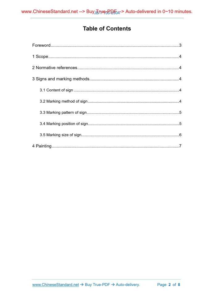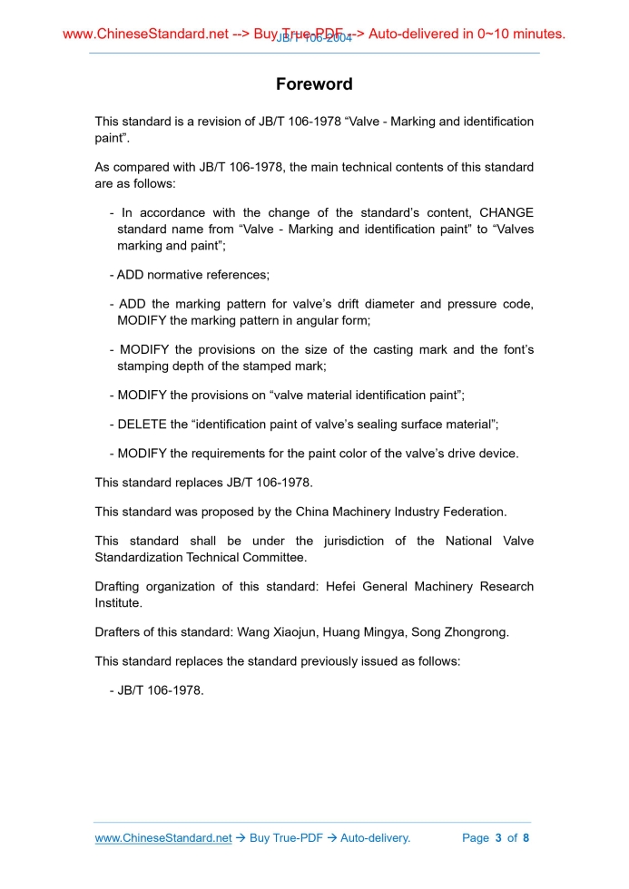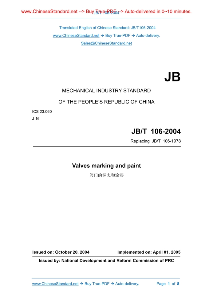 Similar standardsJB/T 106-2004: Valves marking and paint---This is an excerpt. Full copy of true-PDF in English version (including equations, symbols, images, flow-chart, tables, and figures etc.), auto-downloaded/delivered in 9 seconds, can be purchased online: https://www.ChineseStandard.net/PDF.aspx/JBT106-2004JB MECHANICAL INDUSTRY STANDARD ICS 23.060 J 16 Replacing JB/T 106-1978 Valves marking and paint Issued on: OCTOBER 20, 2004 Implemented on: APRIL 01, 2005 Issued by. National Development and Reform Commission of PRC Table of ContentsForeword... 3 1 Scope... 4 2 Normative references... 4 3 Signs and marking methods... 4 3.1 Content of sign... 4 3.2 Marking method of sign... 4 3.3 Marking pattern of sign... 5 3.4 Marking position of sign... 5 3.5 Marking size of sign... 6 4 Painting... 7ForewordThis standard is a revision of JB/T 106-1978 “Valve - Marking and identification paint”. As compared with JB/T 106-1978, the main technical contents of this standard are as follows. - In accordance with the change of the standard’s content, CHANGE standard name from “Valve - Marking and identification paint” to “Valves marking and paint”; - ADD normative references; - ADD the marking pattern for valve’s drift diameter and pressure code, MODIFY the marking pattern in angular form; - MODIFY the provisions on the size of the casting mark and the font’s stamping depth of the stamped mark; - MODIFY the provisions on “valve material identification paint”; - DELETE the “identification paint of valve’s sealing surface material”; - MODIFY the requirements for the paint color of the valve’s drive device. This standard replaces JB/T 106-1978. This standard was proposed by the China Machinery Industry Federation. This standard shall be under the jurisdiction of the National Valve Standardization Technical Committee. Drafting organization of this standard. Hefei General Machinery Research Institute. Drafters of this standard. Wang Xiaojun, Huang Mingya, Song Zhongrong. This standard replaces the standard previously issued as follows. - JB/T 106-1978. Valves marking and paint1 ScopeThis standard specifies the marking content, marking pattern, marking method and size, paint color of valve of various general-purpose valves. This standard applies to all types of general-purpose valves.2 Normative referencesThe provisions in following documents become the provisions of this standard through reference in this standard. For the dated references, the subsequent amendments (excluding corrections) or revisions do not apply to this standard; however, parties who reach an agreement based on this standard are encouraged to study if the latest versions of these documents are applicable. For undated references, the latest edition of the referenced document applies. GB/T 12220 General valve - Signs (GB/T 12220-1989, idt ISO 5209.1977)3 Signs and marking methods3.1 Content of sign The outer surface of the valve’s pressure bearing body shall be marked with a permanent sign in accordance with the provisions of GB/T 12220.The contents of the sign shall include the valve’s drift diameter, pressure code or working pressure code, material grade or code, manufacturer name or trademark, furnace number (casting valve). The valve with flow requirements shall be marked with the arrow of the flow direction of the medium. 3.2 Marking method of sign 3.2.1 When the valve body is formed by casting or die-casting method, its sign shall be casted or die-casted on the valve body together with the valve body. 3.2.2 When the shape of the valve body is formed by the die-forging method, the sign may be marked on the valve body by stamping, in addition to the die- forging or die-casting together with the valve body. When the shape of the valve ......Source: Above contents are excerpted from the full-copy PDF -- translated/reviewed by: www.ChineseStandard.net / Wayne Zheng et al. |