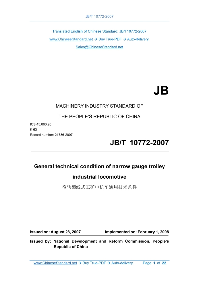 JB/T 10772-2007: General technical condition of narrow gauge trolley industrial locomotive Delivery: 9 seconds. True-PDF full-copy in English & invoice will be downloaded + auto-delivered via email. See step-by-step procedure Status: Valid