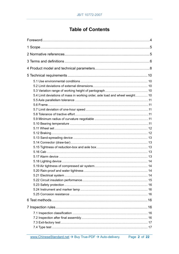 Similar standardsJB/T 10772-2007: General technical condition of narrow gauge trolley industrial locomotive---This is an excerpt. Full copy of true-PDF in English version (including equations, symbols, images, flow-chart, tables, and figures etc.), auto-downloaded/delivered in 9 seconds, can be purchased online: https://www.ChineseStandard.net/PDF.aspx/JBT10772-2007JB MACHINERY INDUSTRY STANDARD OF THE PEOPLE’S REPUBLIC OF CHINA ICS 45.060.20 K 63 Record number: 21736-2007 General technical condition of narrow gauge trolley industrial locomotive ISSUED ON: AUGUST 28, 2007 IMPLEMENTED ON: FEBRUARY 1, 2008 Issued by: National Development and Reform Commission, People’s Republic of China Table of ContentsForeword ... 4 1 Scope ... 5 2 Normative references ... 5 3 Terms and definitions ... 6 4 Product model and technical parameters ... 8 5 Technical requirements ... 10 5.1 Use environmental conditions ... 10 5.2 Limit deviations of external dimensions... 10 5.3 Variation range of working height of pantograph ... 10 5.4 Limit deviations of mass in working order, axle load and wheel weight ... 10 5.5 Axle parallelism tolerance ... 11 5.6 Frame ... 11 5.7 Limit deviation of one-hour speed ... 11 5.8 Tolerance of tractive effort ... 11 5.9 Minimum radius of curvature negotiable ... 11 5.10 Bearing temperature ... 11 5.11 Wheel set ... 12 5.12 Braking ... 12 5.13 Sand-spreading device ... 13 5.14 Connector (draw-bar) ... 13 5.15 Tightness of reduction-box and axle box ... 13 5.16 Cab ... 13 5.17 Alarm device ... 13 5.18 Lighting device ... 14 5.19 Air tightness of compressed air system ... 14 5.20 Rain-proof and water tightness ... 14 5.21 Electrical system ... 14 5.22 Circuit insulation performance ... 15 5.23 Safety protection ... 16 5.24 Instrument and marker lamp ... 16 5.25 Corrosion resistance ... 16 6 Test methods ... 16 7 Inspection rules ... 16 7.1 Inspection classification ... 16 7.2 Inspection after final assembly ... 16 7.3 Exit-factory test ... 17 7.4 Type test ... 17 7.5 Industrial operation test ... 19 7.6 Acceptance test ... 19 7.7 Quality assurance ... 19 7.8 Arbitration test ... 19 8 Marking, packaging, transportation and storage ... 20 8.1 Marking ... 20 8.2 Packaging ... 21 8.3 Transportation ... 22 8.4 Storage ... 22 General technical condition of narrow gauge trolley industrial locomotive1 ScopeThis Standard specifies the terms, technical requirements, test methods, inspection rules, marking, packaging, transportation and storage of narrow- gauge trolley type mine electric locomotive. This Standard applies to the narrow-gauge trolley type mine electric locomotive (hereinafter referred to as electric locomotive) used under non-explosion-proof environmental conditions.2 Normative referencesThe following documents contain provisions which, through reference in this Standard, constitute provisions of this Standard. For the dated references, their subsequent amendments (excluding corrections) or revisions do not apply to this Standard. However, the parties who enter into agreement based on this Standard are encouraged to investigate whether the latest editions of these documents are applicable. For undated reference documents, the latest editions apply to this Standard. GB/T 191 Packaging - Pictorial marking for handling of goods (GB/T 191- 2000, eqv ISO 780:1997) GB/T 999 Voltage ratings of D.C electric traction system (GB/T 999-1988, neq IEC 60038:1983) GB/T 4695 Wheel tread and dimensions for narrow gauge locomotives and vehicles GB/T 10762 Method of mass measurements for industrial and mining electric locomotive GB/T 13384 General specifications for packing of mechanical and electrical product JB/T 2933 Drawing-up and management methods of mine electric locomotive models JB/T 2949 Specification of industrial and mining electric locomotive b) Train speed corresponding to the one-hour rating of the traction motor at the rated voltage and a given excitation (this speed is applicable to a powered vehicle with a half-wear state driving wheel). Unless otherwise specified, the given excitation refers to the rated full field. 3.3 Tractive effort The force of the traction motor acting on the tread of the driving wheel flange when the electric locomotive is in traction. 3.4 Draw-bar pull The tractive effort measured at the draw-bar of the motor vehicle. Unless otherwise specified, it refers to the draw-bar pull on a straight track. 3.5 One-hour tractive effort The tractive effort corresponding to the one-hour power of the traction motor at rated voltage and given excitation (this tractive effort is applicable to a powered vehicle with a half-wear state driving wheel). Unless otherwise specified, this tractive effort is measured under full field. 3.6 Breakaway force The maximum resistance immediately before all the wheels of the train start to turn. 3.7 Axle load The sum of the vertical forces exerted on the horizontal track by each axle of the stationary mine electric locomotive in working order. 3.8 Mass in working order The sum of the mass of empty mine electric locomotive, the mass of the crew,5 Technical requirements5.1 Use environmental conditions 5.1.1 The altitude does not exceed 2000m. 5.1.2 The ambient temperature is -25°C~+40°C. 5.1.3 The average relative humidity of the wettest month is not more than 90%. The average minimum temperature of the same month is not higher than +25°C. 5.1.4 The voltage of the electric locomotive shall meet the requirements of GB/T 999. 5.1.5 When the use environmental conditions of the electric locomotive exceed the above conditions, it shall be determined by the user and the manufacturer through negotiation. 5.2 Limit deviations of external dimensions 5.2.1 The limit deviation of the length dimension is ±1%. 5.2.2 The limit deviation of the width dimension is ±0.5%. 5.2.3 The limit deviation of the height dimension is ±1%. 5.3 Variation range of working height of pantograph 5.3.1 For underground electric locomotives, it shall not be le