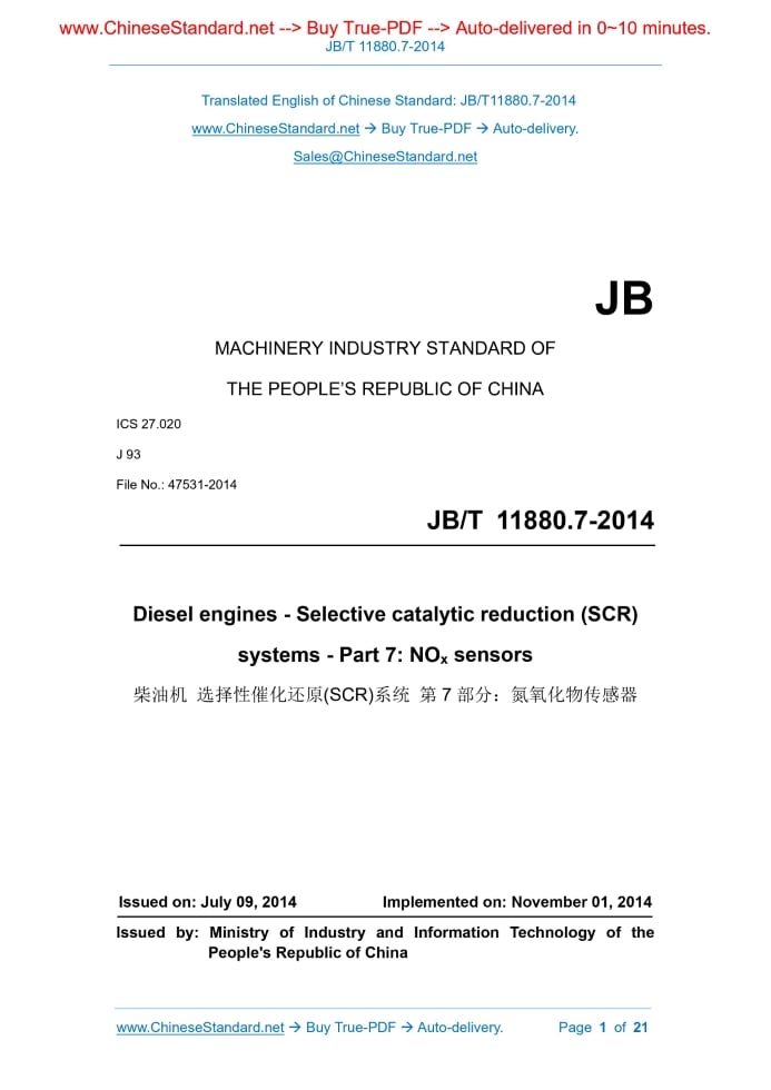 JB/T 11880.7-2014: Diesel engines - Selective catalytic reduction (SCR) systems - Part 7: NOx sensors Delivery: 9 seconds. True-PDF full-copy in English & invoice will be downloaded + auto-delivered via email. See step-by-step procedure Status: Valid