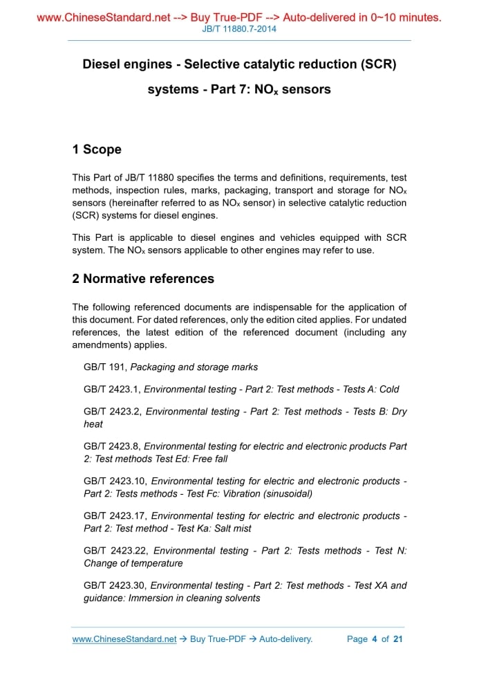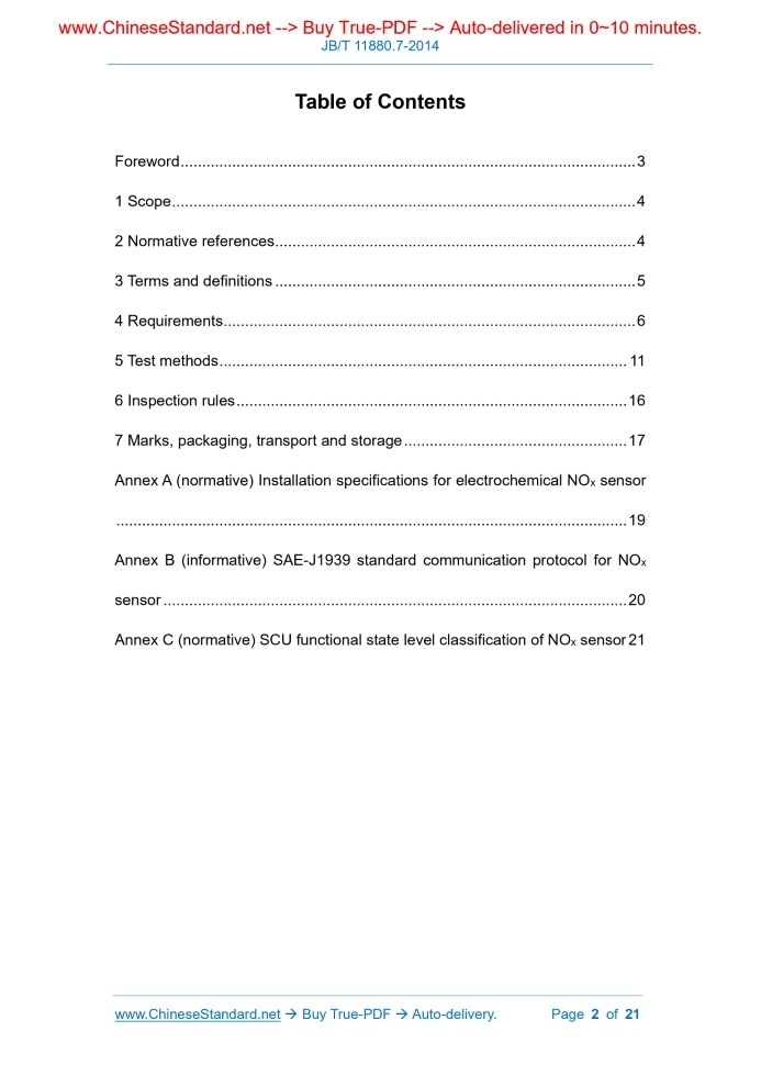 Similar standardsJB/T 11880.7-2014: Diesel engines - Selective catalytic reduction (SCR) systems - Part 7: NOx sensors---This is an excerpt. Full copy of true-PDF in English version (including equations, symbols, images, flow-chart, tables, and figures etc.), auto-downloaded/delivered in 9 seconds, can be purchased online: https://www.ChineseStandard.net/PDF.aspx/JBT11880.7-2014 JB MACHINERY INDUSTRY STANDARD OF THE PEOPLE’S REPUBLIC OF CHINA ICS 27.020 J 93 File No.: 47531-2014 Diesel engines - Selective catalytic reduction (SCR) systems - Part 7: NOx sensors ISSUED ON: JULY 09, 2014 IMPLEMENTED ON: NOVEMBER 01, 2014 Issued by: Ministry of Industry and Information Technology of the People's Republic of China Table of ContentsForeword ... 3 1 Scope ... 4 2 Normative references ... 4 3 Terms and definitions ... 5 4 Requirements ... 6 5 Test methods ... 11 6 Inspection rules ... 16 7 Marks, packaging, transport and storage ... 17 Annex A (normative) Installation specifications for electrochemical NOx sensor ... 19 Annex B (informative) SAE-J1939 standard communication protocol for NOx sensor ... 20 Annex C (normative) SCU functional state level classification of NOx sensor 21 Diesel engines - Selective catalytic reduction (SCR) systems - Part 7: NOx sensors1 ScopeThis Part of JB/T 11880 specifies the terms and definitions, requirements, test methods, inspection rules, marks, packaging, transport and storage for NOx sensors (hereinafter referred to as NOx sensor) in selective catalytic reduction (SCR) systems for diesel engines. This Part is applicable to diesel engines and vehicles equipped with SCR system. The NOx sensors applicable to other engines may refer to use.2 Normative referencesThe following referenced documents are indispensable for the application of this document. For dated references, only the edition cited applies. For undated references, the latest edition of the referenced document (including any amendments) applies. GB/T 191, Packaging and storage marks GB/T 2423.1, Environmental testing - Part 2: Test methods - Tests A: Cold GB/T 2423.2, Environmental testing - Part 2: Test methods - Tests B: Dry heat GB/T 2423.8, Environmental testing for electric and electronic products Part 2: Test methods Test Ed: Free fall GB/T 2423.10, Environmental testing for electric and electronic products - Part 2: Tests methods - Test Fc: Vibration (sinusoidal) GB/T 2423.17, Environmental testing for electric and electronic products - Part 2: Test method - Test Ka: Salt mist GB/T 2423.22, Environmental testing - Part 2: Tests methods - Test N: Change of temperature GB/T 2423.30, Environmental testing - Part 2: Test methods - Test XA and guidance: Immersion in cleaning solvents GB/T 2423.34, Environmental testing - Part 2: Test methods - Test Z/AD: Composite temperature/humidity cyclic test GB/T 2828.1, Sampling procedures for inspection by attributes - Part 1: Sampling schemes indexed by acceptance quality limit (AQL) for lot-by-lot inspection GB 4208, Degrees of protection provided by enclosure (IP code) GB/T 13384-2008, General specifications for packing of mechanical and electrical product GB/T 17619-1998, Limits and methods of testing for immunity of electrical / electronic sub-assemblies in vehicles to electromagnetic radiation GB/T 18655-2010, Vehicles boats and internal combustion engines - Radio disturbance characteristics - Limits and methods of measurement for the protection of on-board receivers GB/T 19951-2005, Road vehicles - Test methods for electrical disturbances from electrostatic discharge GB/T 21437.2-2008, Road vehicles - Electrical disturbances from conduction and coupling - Part 2: Electrical transient conduction along supply lines only HJ 438-2008, Durability of Emission Control Systems of Compression Ignition and Gas Fueled Positive Ignition Engines of Vehicles QC/T 413-2002, Basic Technical Requirements for Automotive Electric Equipment SAEJ1939 (all parts), Recommended Practice for a Serial Control and Communication Vehicle Network3 Terms and definitionsFor the purposes of this document, the following terms and definitions apply. 3.1 NOx sensor The sensor that detects nitrogen oxide (NOx) content such as NO, NO2 in engine exhaust. According to the working principle, it can be divided into electrochemical NOx sensor, optical NOx sensor, optical fluorescent NOx sensor and NOx sensor of other principles. 3.2 electrochemical NOx sensor The sensor that detects the content of nitrogen oxides in engine exhaust by 4.6.1 Low temperature resistance The sensor control unit (SCU) of the NOx sensor is subjected to a low temperature test at -40°C for 48h (24h low temperature storage, 24h low temperature operation). After the test is completed and cooled to room temperature, the functional state shall comply with level A as specified in Annex C. 4.6.2 High temperature resistance The sensor control unit (SCU) of the NOx sensor is subjected to a high temperature test at 85°C for 72h (24h high temperature storage test, 48h high temperature operation test). After the test is completed and cooled to room temperature, the functional state shall comply with level A as specified in Annex C. 4.6.3 Resistance to temperature changes After the NOx sensor has undergone the temperature change test, the functional state shall comply with level A specified in Annex C. The overall appearance of the sensor is free of cracks and other adverse conditions. 4.7 Resistance to temperature/humidity combined cycle change After the NOx sensor is subjected to the temperature/humidity cycle test, the functional state shall be in accordance with level A specified in Annex C. The overall appearance of the sensor is free of rust and other bad conditions. 4.8 Anti-drop performance The NOx sensor is subjected to the anti-drop test. After the test, the shell is allowed to be slightly damaged without affecting the performance of the product. Its functional state shall comply with level A as specified in Annex C.