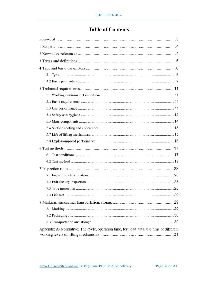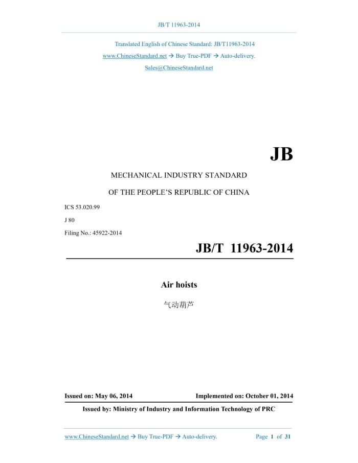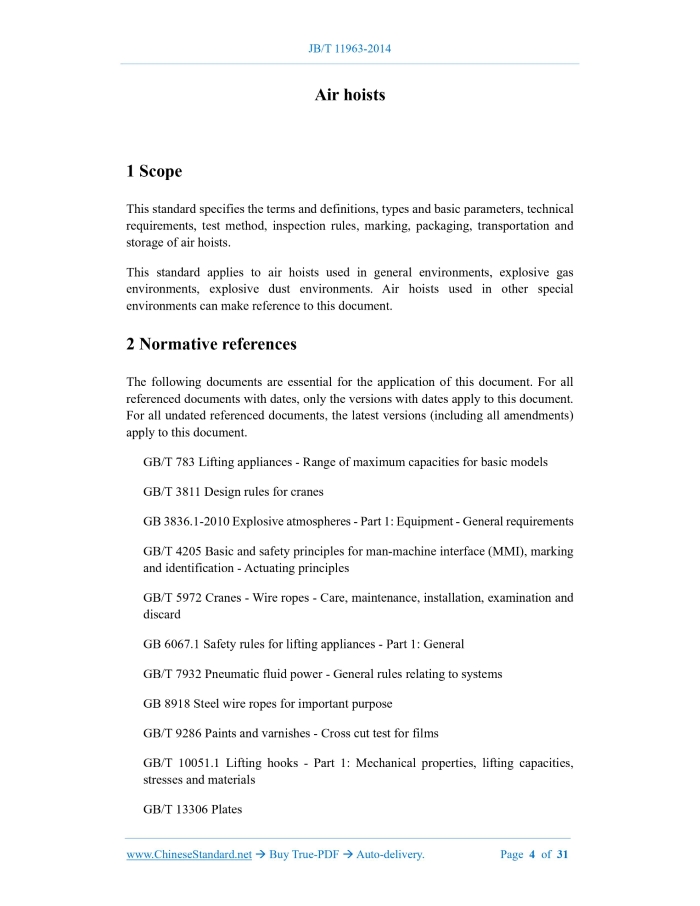Similar standardsJB/T 11963-2014: Air hoists---This is an excerpt. Full copy of true-PDF in English version (including equations, symbols, images, flow-chart, tables, and figures etc.), auto-downloaded/delivered in 9 seconds, can be purchased online: https://www.ChineseStandard.net/PDF.aspx/JBT11963-2014JB MECHANICAL INDUSTRY STANDARD ICS 53.020.99 J 80 Filing No.. 45922-2014 Air hoists Issued on. MAY 06, 2014 Implemented on. OCTOBER 01, 2014 Issued by. Ministry of Industry and Information Technology of PRC Table of ContentsForeword... 3 1 Scope... 4 2 Normative references... 4 3 Terms and definitions... 5 4 Type and basic parameters... 6 4.1 Type... 6 4.2 Basic parameters... 9 5 Technical requirements... 11 5.1 Working environment conditions... 11 5.2 Basic requirements... 11 5.3 Use performance... 11 5.4 Safety and hygiene... 13 5.5 Main components... 14 5.6 Surface coating and appearance... 15 5.7 Life of lifting mechanism... 15 5.8 Explosion-proof performance... 16 6 Test methods... 17 6.1 Test conditions... 17 6.2 Test method... 18 7 Inspection rules... 28 7.1 Inspection classification... 28 7.2 Exit-factory inspection... 28 7.3 Type inspection... 28 7.4 Life test... 29 8 Marking, packaging, transportation, storage... 29 8.1 Marking... 29 8.2 Packaging... 30 8.3 Transportation and storage... 30 Appendix A (Normative) The cycle, operation time, test load, total use time of different working levels of lifting mechanisms... 31ForewordThis standard was drafted in accordance with the rules given in GB/T 1.1-2009. This standard was proposed by the China Machinery Industry Federation. This standard shall be under the jurisdiction of the National Technical Committee for Standardization of Hoisting Machinery (SAC/TC 227). The responsible drafting organizations of this standard. Beijing Hoisting and Conveying Machinery Design Institute, National Hoisting and Conveying Machinery Quality Supervision and Inspection Center. The participating drafting organizations of this standard. Beijing Shuangtai Pneumatic Equipment Co., Ltd., Nanjing Jinming Mechanical Engineering Co., Ltd., Nanjing Special Equipment Safety Supervision and Inspection Institute, Tianjin Ruifen Electromechanical Technology Development Co., Ltd., Huludao Shengdexin Light Hoisting Equipment Co., Ltd. The main drafters of this standard. Dian Shujun, Lin Fukui, Zhao Chunhui, Zhou Wenchuan, Qian Guibao, Wu Xiangsheng, Yu Xiang, Yu Tiecheng. This standard was published for the first time. Air hoists1 ScopeThis standard specifies the terms and definitions, types and basic parameters, technical requirements, test method, inspection rules, marking, packaging, transportation and storage of air hoists. This standard applies to air hoists used in general environments, explosive gas environments, explosive dust environments. Air hoists used in other special environments can make reference to this document.2 Normative referencesThe following documents are essential for the application of this document. For all referenced documents with dates, only the versions with dates apply to this document. For all undated referenced documents, the latest versions (including all amendments) apply to this document. GB/T 783 Lifting appliances - Range of maximum capacities for basic models GB/T 3811 Design rules for cranes GB 3836.1-2010 Explosive atmospheres - Part 1.Equipment - General requirements GB/T 4205 Basic and safety principles for man-machine interface (MMI), marking and identification - Actuating principles GB/T 5972 Cranes - Wire ropes - Care, maintenance, installation, examination and discard GB 6067.1 Safety rules for lifting appliances - Part 1.General GB/T 7932 Pneumatic fluid power - General rules relating to systems GB 8918 Steel wire ropes for important purpose GB/T 9286 Paints and varnishes - Cross cut test for films GB/T 10051.1 Lifting hooks - Part 1.Mechanical properties, lifting capacities, stresses and materials3 Terms and definitionsThe following terms and definitions apply to this document. 3.1 Air hoist A hoist that is composed of an air motor, a reducer, a brake, a winch, etc., which finally winds up the lifting rope through reel or winds up the lifting chain through sprocket, to drive the lifting device up and down. 3.2 Air wire rope hoist Air hoist with wire rope as the reeling flexible part.4 Type and basic parameters4.1 Type 4.1.1 Type classification According to whether the air hoist has an operating mechanism and the type of operating mechanism, it can be divided into fixed air hoist, single-beam trolley air hoist, double-beam trolley air hoist. 4.1.2 Fixed type A fixed air hoist without an operating mechanism. According to the different installation methods, it is divided into two types (see Figure 1 and Figure 2). 4.1.3 Single beam trolley type An air hoist with a running mechanism that runs along a single beam track. The driving type of the running mechanism can be set according to user requirements, such as air motor or sprocket hand pull, hand push drive, etc. (see Figure 3 and Figure 4). 4.2 Basic parameters 4.2.1 Working level The working level of the air hoist lifting mechanism is divided into 8 levels from M1 to M8 according to the provisions of GB/T 3811, based on the load state level and mechanism load spectrum coefficient, use level, and total use time, as shown in Table 1. Unit. meters 4.2.4 Lifting speed The lifting speed shall preferably adopt the values specified in Table 4; the slow speed is recommended to be 1/2 ~ 1/10 of the fast speed. The winding line speed of the explosion-proof air hoist wire rope and drum or chain and sprocket shall not be greater than 25 m/min. 4.2.6 Running speed The running speed shall preferably adopt the value specified in Table 5; the slow speed is recommended to be 1/2 ~ 1/10 of the fast speed. The running speed of the explosion- proof air hoist trolley on the track shall not exceed 25 m/min.5 Technical requirements5.1 Working environment conditions 5.1.1 The air pressure f