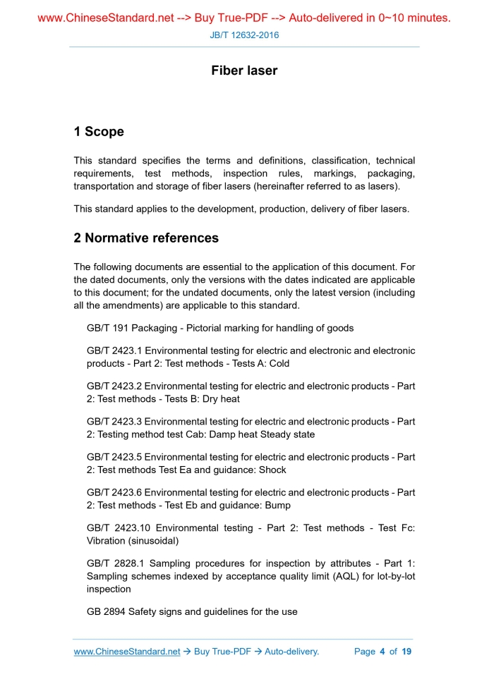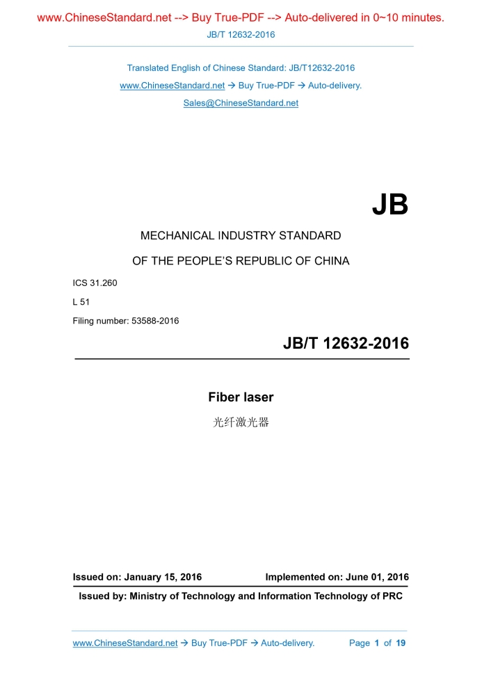 Similar standardsJB/T 12632-2016: Fiber laser---This is an excerpt. Full copy of true-PDF in English version (including equations, symbols, images, flow-chart, tables, and figures etc.), auto-downloaded/delivered in 9 seconds, can be purchased online: https://www.ChineseStandard.net/PDF.aspx/JBT12632-2016JB MECHANICAL INDUSTRY STANDARD ICS 31.260 L 51 Filing number. 53588-2016 Fiber laser Issued on. JANUARY 15, 2016 Implemented on. JUNE 01, 2016 Issued by. Ministry of Technology and Information Technology of PRC Table of ContentsForeword... 3 1 Scope... 4 2 Normative references... 4 3 Terms and definitions... 5 4 Categories... 6 5 Technical requirements... 6 6 Test method... 13 7 Inspection rules... 15 8 Marking, packaging, transportation and storage... 18ForewordThis standard was drafted in accordance with the rules given in GB/T 1.1-2009. This standard was proposed by China Machinery Industry Federation. This standard shall be under the jurisdiction of the National Optical Radiation Safety and Laser Equipment Standardization Technical Committee (SAC/TC 284). Drafting organizations of this standard. Wuhan Ruike Fiber Laser Technology Co., Ltd., Wuhan Huagong Laser Engineering Co., Ltd., Huazhong University of Science and Technology, Tsinghua University, Beijing University of Technology, Shanghai Institute of Optics and Fine Mechanics, Chinese Academy of Sciences Xi'an Institute of Optics and Fine Mechanics, Chinese Academy of Sciences Institute Changchun Institute of Optics and Fine Mechanics, Chinese Academy of Sciences Shenzhen Han's Laser Technology Co., Ltd., the 11th Research Institute of China Electronics Technology Group Corporation. The main drafters of this standard. Yan Dapeng, Lu Feixing, Zhu Xiao, Gong Mali, Wang Pu, Zhou Jun, Wang Yishan, Wang Lijun, Chen Yan, Chen Nianjiang, Li Libo, Liu Xiaoxu, Wang Shibo, Zhu Chao, Wang Min, Liu Gang, Cao Lei, Huang Bao, Wang Jianming, Shi Jianhong, Zhang Xuan, Huang Rong, Gong Junming, Zhang Wenwu, Li Cheng, Yang Hongyuan. This standard was issued for the first time. Fiber laser1 ScopeThis standard specifies the terms and definitions, classification, technical requirements, test methods, inspection rules, markings, packaging, transportation and storage of fiber lasers (hereinafter referred to as lasers). This standard applies to the development, production, delivery of fiber lasers.2 Normative referencesThe following documents are essential to the application of this document. For the dated documents, only the versions with the dates indicated are applicable to this document; for the undated documents, only the latest version (including all the amendments) are applicable to this standard. GB/T 191 Packaging - Pictorial marking for handling of goods GB/T 2423.1 Environmental testing for electric and electronic and electronic products - Part 2.Test methods - Tests A. Cold GB/T 2423.2 Environmental testing for electric and electronic products - Part 2.Test methods - Tests B. Dry heat GB/T 2423.3 Environmental testing for electric and electronic products - Part 2.Testing method test Cab. Damp heat Steady state GB/T 2423.5 Environmental testing for electric and electronic products - Part 2.Test methods Test Ea and guidance. Shock GB/T 2423.6 Environmental testing for electric and electronic products - Part 2.Test methods - Test Eb and guidance. Bump GB/T 2423.10 Environmental testing - Part 2.Test methods - Test Fc. Vibration (sinusoidal) GB/T 2828.1 Sampling procedures for inspection by attributes - Part 1. Sampling schemes indexed by acceptance quality limit (AQL) for lot-by-lot inspection GB 2894 Safety signs and guidelines for the use GB/T 4798.2 Environmental conditions existing in the application of electric and electronic products - Section 2.Transportation3 Terms and definitionsThe terms and definitions as defined in GB/T 14733.12, GB/T 15175-2012, GB/T 15313 as well as the following terms and definitions apply to this document. For ease of use, some terms and definitions in GB/T 15313 are listed repeatedly below. 3.1 Fiber laser A laser that uses a fiber doped with activated particles as the laser medium. [GB/T 15313-2008, definition 2.4.35] 3.2 Laser beam delivery optics Optical cable with fiber protector and connector for transmitting laser energy. 3.3 Beam quality A physical quantity used to describe the spatial transmission characteristics and focusing performance of a laser beam, usually expressed in terms of beam transmission ratio (M2) or beam parameter product (BPP).4 Categories4.1 Classification by wavelength 1 µm band, 1.5 µm band, 2 µm band, 3 µm ~ 5 µm band, etc. 4.2 Classification by doped rare earth elements Ytterbium-doped, erbium-doped, erbium/ytterbium co-doped, thulium-doped, etc.5 Technical requirements5.1 Appearance requirements The appearance of the laser shall meet the following requirements. 5.2 Performance parameter requirements 5.2.1 Performance parameters of continuous fiber laser Unless otherwise specified, the following relevant parameters shall be specified in the detailed specification of continuous fiber lasers. The parameters shall meet the requirements of the detailed specification after being measured by the specified measurement method (see 6.3). 5.2.2 Performance parameters of pulsed fiber laser Unless otherwise specified, the following relevant parameters shall be specified in the detailed specifications of pulsed fiber lasers. Their parameters shall meet the requirements of the detailed specifications after being measured by the specified measurement method (see 6.3). 5.3 Structural requirements Unless otherwise specified, the detailed specifications of the laser shall include the following. 5.4 Requirements for conditions of use Unless otherwise specified, the detailed specifications of the laser shall include the following requirements for conditions of use. 5.5 Environmental adaptability 5.5.3 Low-temperature work 5.5.3.1 Conditions The ambient temperature and continuous working time are