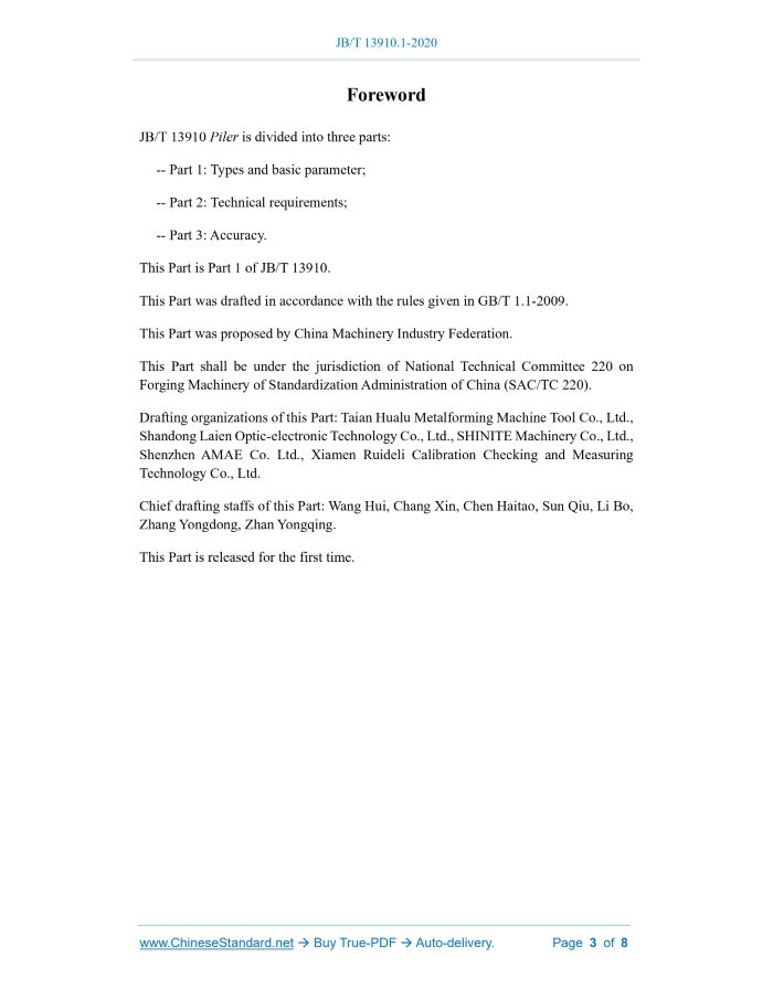 Similar standardsJB/T 13910.1-2020: Piler - Part 1: Types and basic parameter---This is an excerpt. Full copy of true-PDF in English version (including equations, symbols, images, flow-chart, tables, and figures etc.), auto-downloaded/delivered in 9 seconds, can be purchased online: https://www.ChineseStandard.net/PDF.aspx/JBT13910.1-2020JB MACHINERY INDUSTRY STANDARD OF THE PEOPLE’S REPUBLIC OF CHINA ICS 25.120.10 J 62 Piler - Part 1: Types and basic parameter ISSUED ON: APRIL 16, 2020 IMPLEMENTED ON: JANUARY 01, 2021 Issued by: Ministry of Industry and Information Technology of the People's Republic of China Table of ContentsForeword ... 3 1 Scope ... 4 2 Terms and definitions ... 4 3 Types ... 4 4 Basic parameters ... 7 4.1 Main parameters ... 7 4.2 Parameters ... 7ForewordJB/T 13910 Piler is divided into three parts: -- Part 1: Types and basic parameter; -- Part 2: Technical requirements; -- Part 3: Accuracy. This Part is Part 1 of JB/T 13910. This Part was drafted in accordance with the rules given in GB/T 1.1-2009. This Part was proposed by China Machinery Industry Federation. This Part shall be under the jurisdiction of National Technical Committee 220 on Forging Machinery of Standardization Administration of China (SAC/TC 220). Drafting organizations of this Part: Taian Hualu Metalforming Machine Tool Co., Ltd., Shandong Laien Optic-electronic Technology Co., Ltd., SHINITE Machinery Co., Ltd., Shenzhen AMAE Co. Ltd., Xiamen Ruideli Calibration Checking and Measuring Technology Co., Ltd. Chief drafting staffs of this Part: Wang Hui, Chang Xin, Chen Haitao, Sun Qiu, Li Bo, Zhang Yongdong, Zhan Yongqing. This Part is released for the first time. Piler - Part 1: Types and basic parameter1 ScopeThis Part of JB/T 13910 specifies the types and basic parameters of the piler. This Part applies to the piler on the uncoiling, leveling and shearing production line for sheet metal; it also applies, as a reference, to other pilers.2 Terms and definitionsThe following terms and definitions are applicable to this document. 2.1 Piler A facility used for neatly collecting the uncoiled, leveled and sheared sheets. 2.2 Supporting frame A device that prevents scratches on the surface of the sheet during the stacking process. 2.3 Supporting platform A device for placing sheets during sheet stacking. 2.4 Side pushing A device that pushes the sheets in the side direction (the width direction of the sheets) during the stacking process of the sheets. 2.5 Longitudinal pushing A device that pushes the sheets in the longitudinal direction (the length direction of the sheets) during the stacking process of the sheets.3 TypesThe types of pilers are mainly divided into the following seven categories; various types of functions can be combined arbitrarily according to user requirements: a) Supporting frame-free and supporting platform-fixed piler: without supporting frame, side pushing for lateral moving, longitudinal pushing for longitudinal moving, fixed supporting platform. The structure is shown in Figure 1. ......Source: Above contents are excerpted from the full-copy PDF -- translated/reviewed by: www.ChineseStandard.net / Wayne Zheng et al. Tips & Frequently Asked Questions:Question 1: How long will the true-PDF of English version of JB/T 13910.1-2020 be delivered?Answer: The full copy PDF of English version of JB/T 13910.1-2020 can be downloaded in 9 seconds, and it will also be emailed to you in 9 seconds (double mechanisms to ensure the delivery reliably), with PDF-invoice.Question 2: Can I share the purchased PDF of JB/T 13910.1-2020_English with my colleagues?Answer: Yes. The purchased PDF of JB/T 13910.1-2020_English will be deemed to be sold to your employer/organization who actually paid for it, including your colleagues and your employer's intranet.Question 3: Does the price include tax/VAT?Answer: Yes. Our tax invoice, downloaded/delivered in 9 seconds, includes all tax/VAT and complies with 100+ countries' tax regulations (tax exempted in 100+ countries) -- See Avoidance of Double Taxation Agreements (DTAs): List of DTAs signed between Singapore and 100+ countriesQuestion 4: Do you accept my currency other than USD?Answer: Yes. www.ChineseStandard.us -- JB/T 13910.1-2020 -- Click this link and select your country/currency to pay, the exact amount in your currency will be printed on the invoice. Full PDF will also be downloaded/emailed in 9 seconds.How to buy and download a true PDF of English version of JB/T 13910.1-2020?A step-by-step guide to download PDF of JB/T 13910.1-2020_EnglishStep 1: Visit website https://www.ChineseStandard.net (Pay in USD), or https://www.ChineseStandard.us (Pay in any currencies such as Euro, KRW, JPY, AUD).Step 2: Search keyword "JB/T 13910.1-2020". Step 3: Click "Add to Cart". If multiple PDFs are required, repeat steps 2 and 3 to add up to 12 PDFs to cart. Step 4: Select payment option (Via payment agents Stripe or PayPal). Step 5: Customize Tax Invoice -- Fill up your email etc. Step 6: Click "Checkout". Step 7: Make payment by credit card, PayPal, Google Pay etc. After the payment is completed and in 9 seconds, you will receive 2 emails attached with the purchased PDFs and PDF-invoice, respectively. Step 8: Optional -- Go to download PDF. Step 9: Optional -- Click Open/Download PDF to download PDFs and invoice. See screenshots for above steps: Steps 1~3 Steps 4~6 Step 7 Step 8 Step 9 |