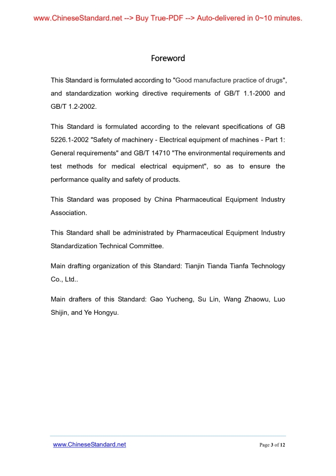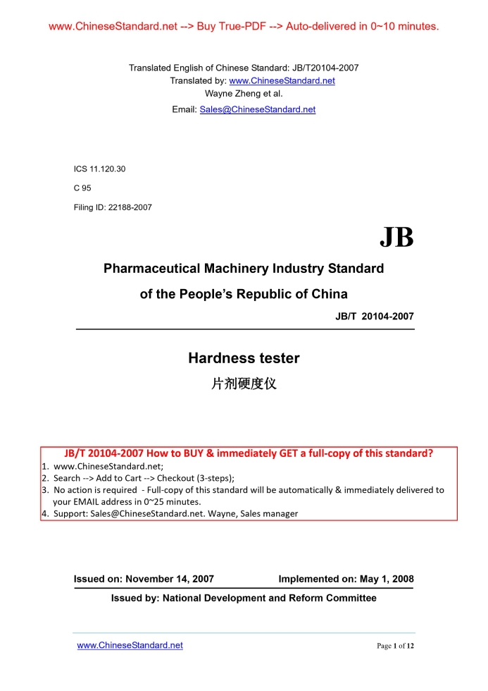 Similar standardsJB/T 20104-2007: Hardness tester---This is an excerpt. Full copy of true-PDF in English version (including equations, symbols, images, flow-chart, tables, and figures etc.), auto-downloaded/delivered in 9 seconds, can be purchased online: https://www.ChineseStandard.net/PDF.aspx/JBT20104-2007ICS 11.120.30 C 95 Filing ID. 22188-2007 JB Pharmaceutical Machinery Industry Standard of the People’s Republic of China Hardness tester Issued on: NOVEMBER 14, 2007 Implemented on: MAY 1, 2008 Issued by. National Development and Reform Committee Table of ContentsForeword... 3 1 Scope... 4 2 Normative references... 4 3 Terms and definitions... 5 4 Marks... 5 5 Requirements... 5 6 Test methods... 7 7 Inspection rules... 9 8 Signs, packaging, transportation and storage... 11ForewordThis Standard is formulated according to "Good manufacture practice of drugs", and standardization working directive requirements of GB/T 1.1-2000 and GB/T 1.2-2002. This Standard is formulated according to the relevant specifications of GB 5226.1-2002 "Safety of machinery - Electrical equipment of machines - Part 1. General requirements" and GB/T 14710 "The environmental requirements and test methods for medical electrical equipment", so as to ensure the performance quality and safety of products. This Standard was proposed by China Pharmaceutical Equipment Industry Association. This Standard shall be administrated by Pharmaceutical Equipment Industry Standardization Technical Committee. Main drafting organization of this Standard. Tianjin Tianda Tianfa Technology Co., Ltd.. Main drafters of this Standard. Gao Yucheng, Su Lin, Wang Zhaowu, Luo Shijin, and Ye Hongyu. Hardness tester1 ScopeThis Standard specifies the terms and definitions, marks, requirements, test methods, inspection rules and signs, packaging, transportation and storage of hardness tester. This Standard applies to the motor-driven digital display instruments used to measure the hardness of pharmaceutical tablets (hereinafter referred to as hardness tester).2 Normative referencesThe provisions in following documents become the provisions of this Standard through reference in this Standard. For dated references, the subsequent amendments (excluding corrections) or revisions do not apply to this Standard, however, parties who reach an agreement based on this Standard are encouraged to study if the latest versions of these documents are applicable. For undated references, the latest edition of the referenced document applies. GB/T 191 Packaging - Pictorial marking for handling of goods GB 5226.1-2002 Safety of machinery - Electrical equipment of machines - Part 1.General requirements GB/T 6388 Transport package shipping mark GB/T 13306 Plates GB/T 13384 General specifications for packing of mechanical and electrical product GB/T 14710 The environmental requirements and test methods for medical electrical equipment YY/T 0216 Editorial nominating method for the model designation of pharmaceutical machinery8 Signs, packaging, transportation and storage8.1 Signs 8.1.1 The plates shall comply with the specifications of GB/T 13306.The contents of plates are as follows. a) Name of manufacturer; b) Product name and model; c) Trademark; d) Production serial number and date; e) Power supply voltage and maximum power; f) Implemented standard ID. 8.1.2 Pictorial signs of packaging, storage and transportation shall comply with the specifications of GB/T 191.There shall be signs such as "Fragile", "Keep-up", "Keep dry", "No rolling". 8.1.3 Signs of transportation and shipping shall comply with the specifications of GB/T 6388. 8.2 Packaging 8.2.1 The packaging of products shall comply with the specifications of GB/T 13384. 8.2.2 The following documents shall be within the package of tester. a) Product certificate; b) Product instructions; c) Packing list; d) Other documents (such as supporting documents to the instrument). 8.3 Transportation Transportation is according to the specifications of order contract. The hardness testers shall be firmly fixed on the transport means during transportation. Tumbling is forbidden. 8.4 Storage After packaged, hardness tester shall be stored in dry, ventilated, no-corrosive-gas indoor place. ......Source: Above contents are excerpted from the full-copy PDF -- translated/reviewed by: www.ChineseStandard.net / Wayne Zheng et al. |
