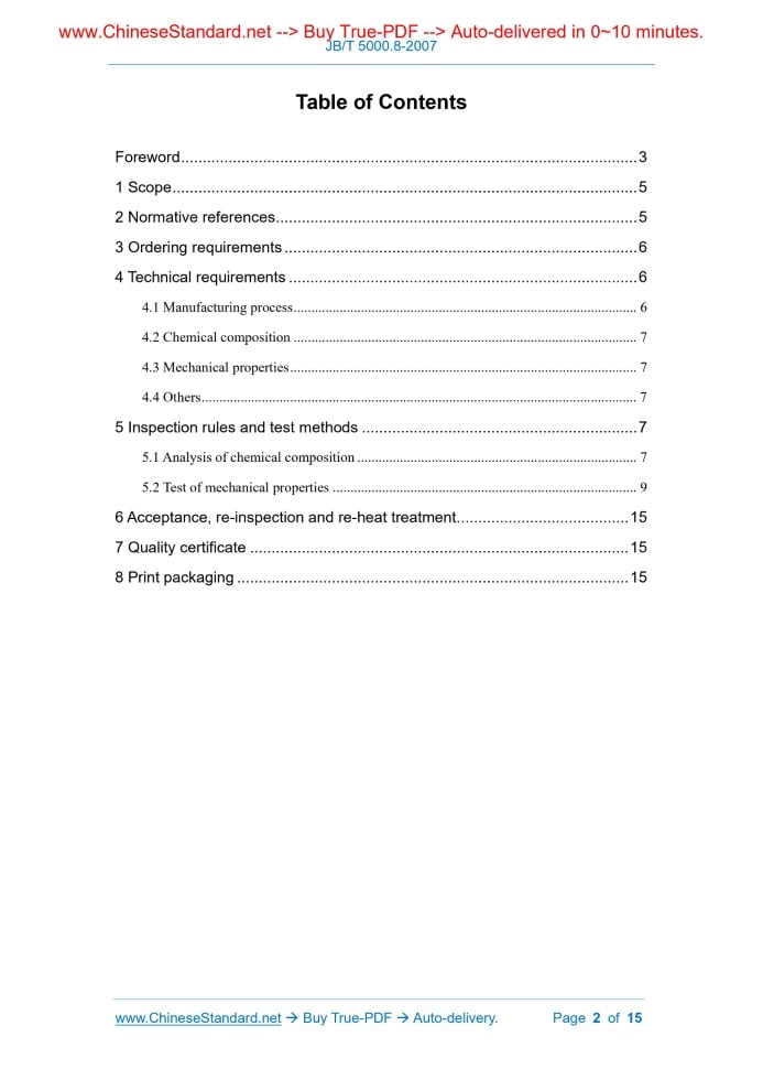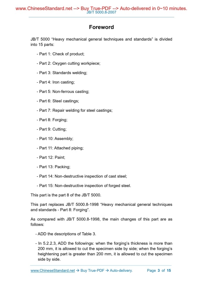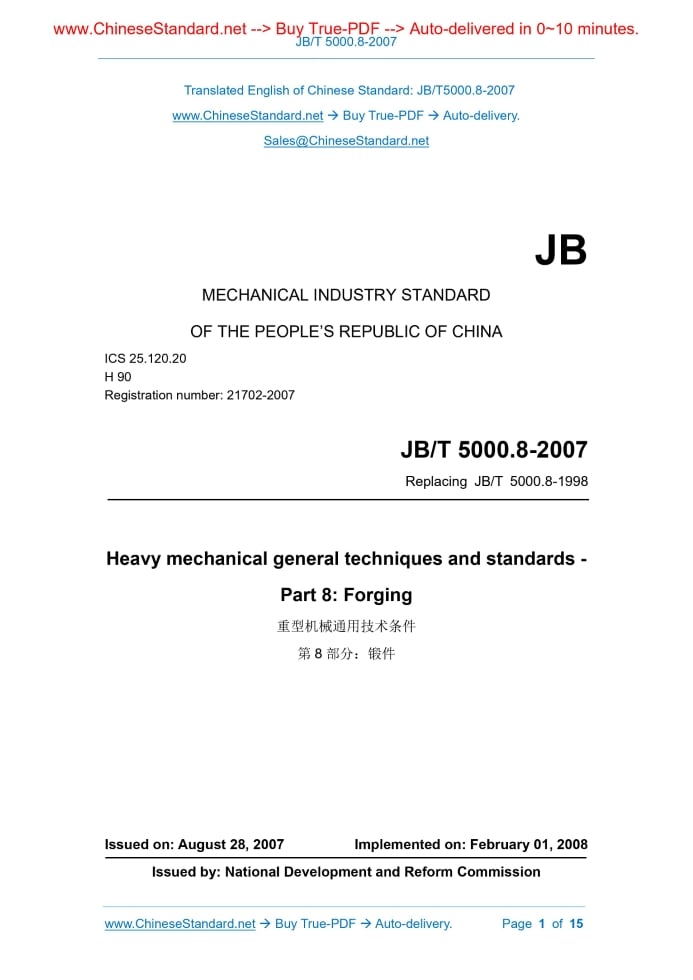 Similar standardsJB/T 5000.8-2007: Heavy mechanical general techniques and standards - Part 15: Non-destructive inspection of forged steel---This is an excerpt. Full copy of true-PDF in English version (including equations, symbols, images, flow-chart, tables, and figures etc.), auto-downloaded/delivered in 9 seconds, can be purchased online: https://www.ChineseStandard.net/PDF.aspx/JBT5000.8-2007 JB MECHANICAL INDUSTRY STANDARD OF THE PEOPLE’S REPUBLIC OF CHINA ICS 25.120.20 H 90 Registration number. 21702-2007 Replacing JB/T 5000.8-1998 Heavy mechanical general techniques and standards - Part 8. Forging Issued on: AUGUST 28, 2007 Implemented on: FEBRUARY 01, 2008 Issued by. National Development and Reform Commission Table of ContentsForeword ... 3 1 Scope ... 5 2 Normative references ... 5 3 Ordering requirements ... 6 4 Technical requirements ... 6 4.1 Manufacturing process ... 6 4.2 Chemical composition ... 7 4.3 Mechanical properties ... 7 4.4 Others ... 7 5 Inspection rules and test methods ... 7 5.1 Analysis of chemical composition ... 7 5.2 Test of mechanical properties ... 9 6 Acceptance, re-inspection and re-heat treatment... 15 7 Quality certificate ... 15 8 Print packaging ... 15ForewordJB/T 5000 “Heavy mechanical general techniques and standards” is divided into 15 parts. - Part 1. Check of product; - Part 2. Oxygen cutting workpiece; - Part 3. Standards welding; - Part 4. Iron casting; - Part 5. Non-ferrous casting; - Part 6. Steel castings; - Part 7. Repair welding for steel castings; - Part 8. Forging; - Part 9. Cutting; - Part 10. Assembly; - Part 11. Attached piping; - Part 12. Paint; - Part 13. Packing; - Part 14. Non-destructive inspection of cast steel; - Part 15. Non-destructive inspection of forged steel. This part is the part 8 of the JB/T 5000. This part replaces JB/T 5000.8-1998 “Heavy mechanical general techniques and standards - Part 8. Forging”. As compared with JB/T 5000.8-1998, the main changes of this part are as follows. - ADD the descriptions of Table 3. - In 5.2.2.3, ADD the followings. when the forging’s thickness is more than 200 mm, it is allowed to cut the specimen side by side; when the forging’s heightening part is greater than 200 mm, it is allowed to cut the specimen side by side. Heavy mechanical general techniques and standards - Part 8. Forging1 ScopeThis part of JB/T 5000 specifies the technical requirements, inspection rules, test methods, quality certificates and markings for general purpose large forgings. This part applies to the ordering, manufacturing, inspection of the large forgings of carbon steel and alloy structural steel which are free-forged by the hydraulic (oil) press and the forging hammer.2 Normative referencesThe provisions in following documents become the provisions of this part through reference in this part of JB/T 5000. For the dated references, the subsequent amendments (excluding corrections) or revisions do not apply to this part; however, parties who reach an agreement based on this part are encouraged to study if the latest versions of these documents are applicable. For undated references, the latest version of the referenced document applies. GB/T 223 (All parts) Methods for chemical analysis of iron, steel and alloy GB/T 226 Etch test for macrostructure and defect of steels (GB/T 226-1991, neq ISO 4969.1980) GB/T 228 Metallic materials - Tensile testing at ambient temperature [GB/T 228-2002, eqv ISO 6892.1998 (E)] GB/T 229 Charpy notch impact test (GB/T 229-1994, eqv ISO 148.1983) GB/T 231.1 Metallic materials - Brinell hardness test - Part 1. Test method [GB/T 231.1-2002, eqv ISO 6506-1.1999 (E)] GB/T 1979 Diagram of a low magnification texture blemish grading of structural steel GB/T 4338 Metallic materials - Tensile testing at elevated temperature (GB/T 4338-1995, eqv ISO 738. 1989) GB/T 6394 Metal - Methods for estimating the average grain size (GB/T 6394-2002, ASTM E 112.1996, MOD) 4.1.2.5 Forgings are heat-treated in a certain way after being forged, to reduce the forging stress and make it have good mechanical processing properties. For forgings which uses the post-forging heat treatment as final heat treatment, it shall meet the technical requirements of the drawings after heat treatment. 4.1.2.6 The shape and dimensions of the forgings shall be in accordance with the requirements of the forging’s drawings and process documents. 4.1.3 Heat treatment The final heat treatment of the forgings shall be carried out in accordance with the delivery status as specified in the order contract or drawings. 4.1.4 Machining The machining of forgings shall be in accordance with the dimensions and surface roughness as specified in the order drawings. 4.2 Chemical composition The chemical composition of the steel shall comply with the requirements of the standards as specified by the ordering contract or the drawings. 4.3 Mechanical properties The mechanical properties of the forgings shall comply with the requirements of the standards as specified by the ordering contract or the drawings. 4.4 Others When the purchaser considers it necessary, it may propose the non-destructive testing, high-temperature strength, low-temperature toughness, grain size, inclusions, metallographic structure, other supplementary requirements. The inspection methods and acceptance criteria shall be determined by both parties through negotiation.5 Inspection rules and test methods5.1 Analysis of chemical composition 5.1.1 Melting analysis 5.1.1.1 It shall carry out sampling analysis at the time of pouring of each furnace6 Acceptance, re-inspection and re-heat treatment.6.1 Forgings are not allowed to have visible cracks, folds or other appearance defects that may affect the use. Local defects may be removed, but the depth of removal shall not exceed 75% of the machining allowance. Defects on the non-machined surface of the forging shall be cleaned and smoothed, the depth of removal shall not exceed the deviation of the forging