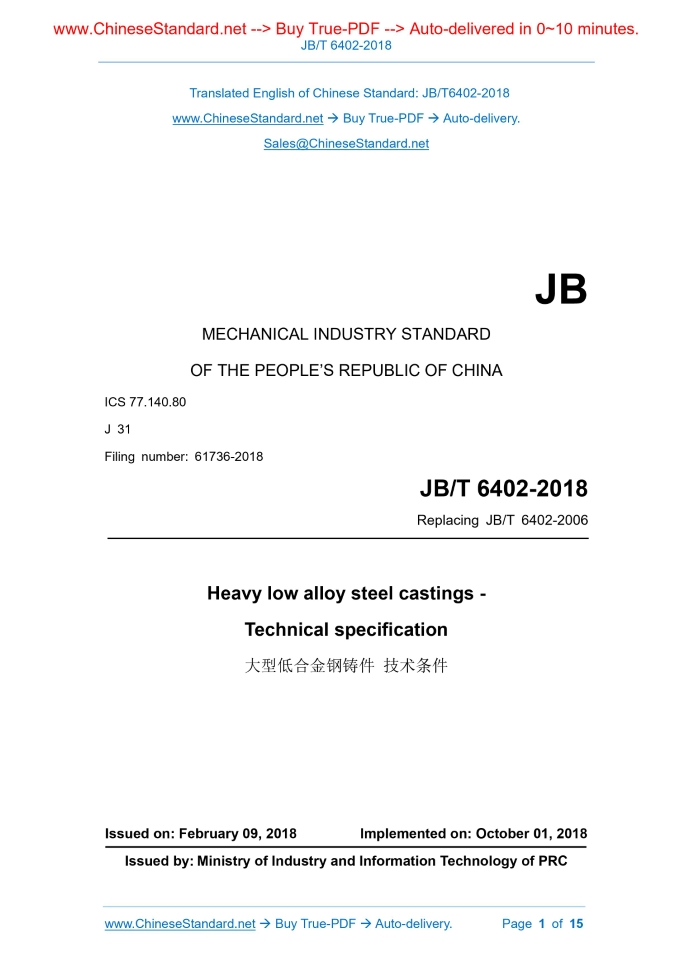 JB/T 6402-2018: Heavy low alloy steel castings - Technical specification Delivery: 9 seconds. True-PDF full-copy in English & invoice will be downloaded + auto-delivered via email. See step-by-step procedure Status: Valid JB/T 6402: Historical versions