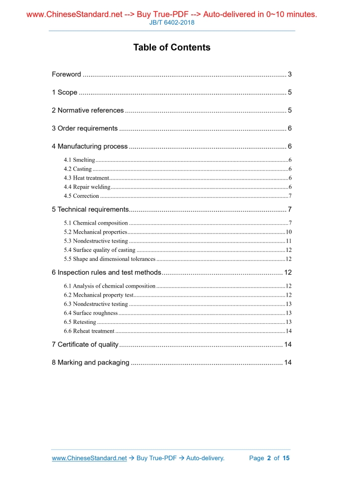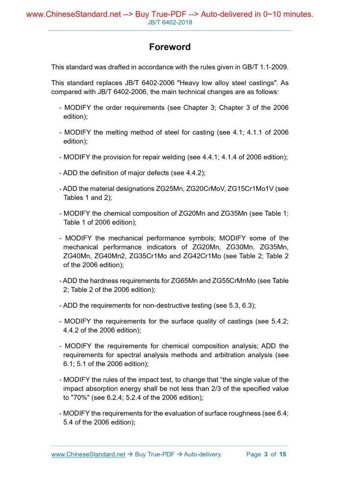 JB/T 6402-2018: Heavy low alloy steel castings - Technical specification---This is an excerpt. Full copy of true-PDF in English version (including equations, symbols, images, flow-chart, tables, and figures etc.), auto-downloaded/delivered in 9 seconds, can be purchased online: https://www.ChineseStandard.net/PDF.aspx/JBT6402-2018MECHANICAL INDUSTRY STANDARD ICS 77.140.80 J 31 Filing number. 61736-2018 Replacing JB/T 6402-2006 Heavy low alloy steel castings - Technical specification Issued on. FEBRUARY 09, 2018 Implemented on. OCTOBER 01, 2018 Issued by. Ministry of Industry and Information Technology of PRC Table of ContentsForeword... 3 1 Scope... 5 2 Normative references... 5 3 Order requirements... 6 4 Manufacturing process... 6 4.1 Smelting... 6 4.2 Casting... 6 4.3 Heat treatment... 6 4.4 Repair welding... 6 4.5 Correction... 7 5 Technical requirements... 7 5.1 Chemical composition... 7 5.2 Mechanical properties... 10 5.3 Nondestructive testing... 11 5.4 Surface quality of casting... 12 5.5 Shape and dimensional tolerances... 12 6 Inspection rules and test methods... 12 6.1 Analysis of chemical composition... 12 6.2 Mechanical property test... 12 6.3 Nondestructive testing... 13 6.4 Surface roughness... 13 6.5 Retesting... 13 6.6 Reheat treatment... 14 7 Certificate of quality... 14 8 Marking and packaging... 14ForewordThis standard was drafted in accordance with the rules given in GB/T 1.1-2009. This standard replaces JB/T 6402-2006 "Heavy low alloy steel castings". As compared with JB/T 6402-2006, the main technical changes are as follows. - MODIFY the order requirements (see Chapter 3; Chapter 3 of the 2006 edition); - MODIFY the melting method of steel for casting (see 4.1; 4.1.1 of 2006 edition); - MODIFY the provision for repair welding (see 4.4.1; 4.1.4 of 2006 edition); - ADD the definition of major defects (see 4.4.2); - ADD the material designations ZG25Mn, ZG20CrMoV, ZG15Cr1Mo1V (see Tables 1 and 2); - MODIFY the chemical composition of ZG20Mn and ZG35Mn (see Table 1; Table 1 of 2006 edition); - MODIFY the mechanical performance symbols; MODIFY some of the mechanical performance indicators of ZG20Mn, ZG30Mn, ZG35Mn, ZG40Mn, ZG40Mn2, ZG35Cr1Mo and ZG42Cr1Mo (see Table 2; Table 2 of the 2006 edition); - ADD the hardness requirements for ZG65Mn and ZG55CrMnMo (see Table 2; Table 2 of the 2006 edition); - ADD the requirements for non-destructive testing (see 5.3, 6.3); - MODIFY the requirements for the surface quality of castings (see 5.4.2; 4.4.2 of the 2006 edition); - MODIFY the requirements for chemical composition analysis; ADD the requirements for spectral analysis methods and arbitration analysis (see 6.1; 5.1 of the 2006 edition); - MODIFY the rules of the impact test, to change that “the single value of the impact absorption energy shall be not less than 2/3 of the specified value to "70%" (see 6.2.4; 5.2.4 of the 2006 edition); - MODIFY the requirements for the evaluation of surface roughness (see 6.4; 5.4 of the 2006 edition); - MODIFY the requirements for retesting and reheating treatment (see 6.5, 6.6; 5.3 of the 2006 edition); - MODIFY the content of the quality certificate (see Chapter 7; Chapter 6 of the 2006 edition). This standard was proposed by China Machinery Industry Federation. This standard shall be under the jurisdiction of the National Large-scale Casting and Forging Standardization Technical Committee (SAC/TC 506). Drafting organizations of this standard. Erzhong Group (Deyang) Heavy Equipment Co., Ltd., CITIC Heavy Industry Machinery Co., Ltd., Harbin Large Electric Machinery Research Institute, Taiyuan Heavy Industry Co., Ltd. The main drafters of this standard. Liu Xianyou, Xiao Zhangyu, Li Bin, Zhao Yongrang, Xu Enxian, Hou Shipu, Wei Xinhong. This standard replaces the standards previously issued as follows. - JB/T 6402-1992, JB/T 6402-2006. Heavy low alloy steel castings - Technical specification1 ScopeThis standard specifies the order requirements, manufacturing processes, technical requirements, inspection rules and test methods, quality certificates, markings and packaging for general heavy low-alloy steel castings (hereinafter referred to as castings). This standard applies to castings as casted in sand molds or molds with similar thermal conductivity to sand molds.2 Normative referencesThe following documents are essential to the application of this document. For the dated documents, only the versions with the dates indicated are applicable to this document; for the undated documents, only the latest version (including all the amendments) are applicable to this standard. GB/T 222 Permissible tolerances for chemical composition of steel products GB/T 223 (All parts) Methods for chemical analysis of steel and alloys GB/T 228.1 Metallic materials - Tensile testing - Part 1.Method of test at room temperature GB/T 229 Metallic materials - Charpy pendulum impact test method GB/T 231.1 Metallic materials - Brinell hardness test - Part 1.Test method GB/T 4336 Carbon and low-alloy steel - Determination of multi-element contents - Spark discharge atomic emission spectrometric method (routine method) GB/T 11352 Carbon steel castings for general engineering purpose GB/T 15056 Casting surface roughness - Appraising method GB/T 20066 Steel and iron - Sampling and preparation of samples for the determination of chemical composition JB/T 5000.6 Heavy mechanical general techniques and standards - Part 6. Steel castings JB/T 5000.7 Heavy mechanical general techniques and standards - Part 7. Repair welding for steel castings JB/T 6397-2006 Specification for the heavy carbon structural steel forgings3 Order requirements3.1 The purchaser shall specify the name of the casting, material designations, technical requirements, inspection items, delivery status and quantity of supply in the order contract.4 Manufacturing process4.1 Smelting Steel for castings shall be smelted by induction furnace, electric arc furnace, electric furnace and refined outside the fu