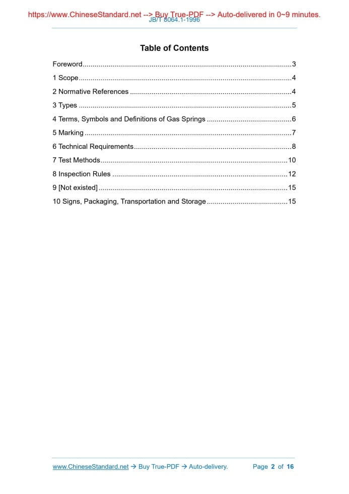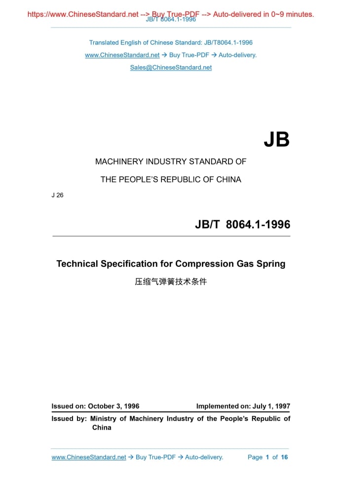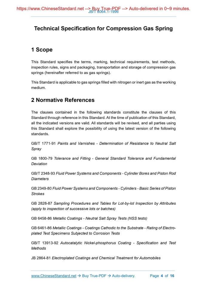 Similar standardsJB/T 8064.1-1996: Technical specification for compression gas spring---This is an excerpt. Full copy of true-PDF in English version (including equations, symbols, images, flow-chart, tables, and figures etc.), auto-downloaded/delivered in 9 seconds, can be purchased online: https://www.ChineseStandard.net/PDF.aspx/JBT8064.1-1996JB MACHINERY INDUSTRY STANDARD OF THE PEOPLE’S REPUBLIC OF CHINA J 26 Technical Specification for Compression Gas Spring ISSUED ON: OCTOBER 3, 1996 IMPLEMENTED ON: JULY 1, 1997 Issued by: Ministry of Machinery Industry of the People’s Republic of China Table of ContentsForeword ... 3 1 Scope ... 4 2 Normative References ... 4 3 Types ... 5 4 Terms, Symbols and Definitions of Gas Springs ... 6 5 Marking ... 7 6 Technical Requirements ... 8 7 Test Methods ... 10 8 Inspection Rules ... 12 9 [Not existed] ... 15 10 Signs, Packaging, Transportation and Storage ... 15 Technical Specification for Compression Gas Spring1 ScopeThis Standard specifies the terms, marking, technical requirements, test methods, inspection rules, signs and packaging, transportation and storage of compression gas springs (hereinafter referred to as gas springs). This Standard is applicable to gas springs filled with nitrogen or inert gas as the working medium.2 Normative ReferencesThe clauses contained in the following standards constitute the clauses of this Standard through reference in this Standard. At the time of publication of this Standard, all the indicated versions are valid. All standards will be revised, and all parties using this Standard shall explore the possibility of using the latest version of the following standards. GB/T 1771-91 Paints and Varnishes - Determination of Resistance to Neutral Salt Spray GB 1800-79 Tolerance and Fitting - General Standard Tolerance and Fundamental Deviation GB/T 2348-93 Fluid Power Systems and Components - Cylinder Bores and Piston Rod Diameters GB 2349-80 Fluid Power Systems and Components - Cylinders - Basic Series of Piston Strokes GB 2828-87 Sampling Procedures and Tables for Lot-by-lot Inspection by Attributes (apply to inspection of successive lots or batches) GB 6458-86 Metallic Coatings - Neutral Salt Spray Tests (NSS tests) GB 6461-86 Metallic Coatings - Coatings Cathodic to the Substrate - Rating of Electro- plated Test Specimens Subjected to Corrosion Tests GB/T 13913-92 Autocatalytic Nickel-phosphorus Coating - Specification and Test Methods JB 2864-81 Electroplated Coatings and Chemical Treatment for Automobiles Gas springs with severe operating environment shall be repeatedly subjected to 12 times of thermal and cold shock resistance test. After the test, the nominal force attenuation of the gas spring shall not exceed 8%; Gas springs with general operating environment shall be subjected to 2 times of thermal and cold shock resistance test. After the test, the nominal force attenuation of the gas spring shall not exceed 5%. 6.3.7 Cycle life Gas springs that have gone through the thermal and cold shock resistance test shall also be able to withstand 20,000 times of cycle life test. After the test, the total attenuation of the nominal force shall be less than 13%; the dynamic friction shall comply with the stipulations of Table 2. 6.3.8 Tensile strength The gas spring is stretched at 4 times the nominal force and maintained for 5 min; the force performance of the gas spring shall remain unchanged. The gas spring is stretched at 8 times the nominal force and maintained for 5 min; the gas spring is allowed to fail, but not dismembered.7 Test Methods7.1 Size and Appearance Inspection 7.1.1 Use special or general-purpose measuring instruments with a division value less than or equal to 0.02 mm for size inspection. 7.1.2 Adopt visual inspection or 4 times magnifying glass for the inspection of the appearance quality. The electroplated coating, chemical treatment layer and paint coating shall respectively be inspected in accordance with the relevant regulations of GB/T 13913, JB/Z 111 and JB 2864; the inspection results shall comply with the stipulations of 6.2.3 ~ 6.2.5. 7.2 Force Performance Inspection 7.2.1 Test conditions The inspection shall be carried out at 20 °C ± 2 °C. Before the inspection, the gas spring shall be in an environment of 20 °C ± 2 °C, and always be maintained in the stretched state; the piston rod must not be pressed; place it for above 2 h. The measuring speed of the testing machine is: 200 mm/min; the force measurement accuracy of the testing machine is not lower than 1%; the displacement measurement accuracy is not lower than 1%. it out, install it on the testing machine; make the piston rod vertically downward; within 2 min, control the gas spring to complete 5 cycles. Then, place the gas spring in an environment of 80 °C ± 2 °C for 6 h. Within 10 s after taking it out, install it on the testing machine; make the piston rod vertically downward; within 2 min, control the gas spring to complete 5 cycles. The above is one thermal and cold shock. After the test, place the gas spring in an environment of 20 °C ± 2 °C for 4 h, and its nominal force attenuation shall comply with the stipulations of 6.3.6. 7.6 Life Test On the testing machine, install the gas spring that has been subjected to the thermal and cold shock resistance test. The piston rod is placed downward; control the gas spring to complete cycles; the frequency of the cycles is 4 ~ 10 times/min. During the test, the temperature of the gas spring cylinder shall be lower than 50 °C. After every 5,000 cycles, in accordance with the inspection method in 7.2, determine the force performance once. After 20,000 cycles, the determination results shall comply with the stipulations of 6.3.7. 7.7 Tensile Strength Test Fix the gas spring on the testing machine; at a speed of 2 mm/min, load it. Then, in accordance with the stipulations of 6.3.8, conduct the test.8 Inspection Rules8.1 Inspection Classification Product inspection is divid