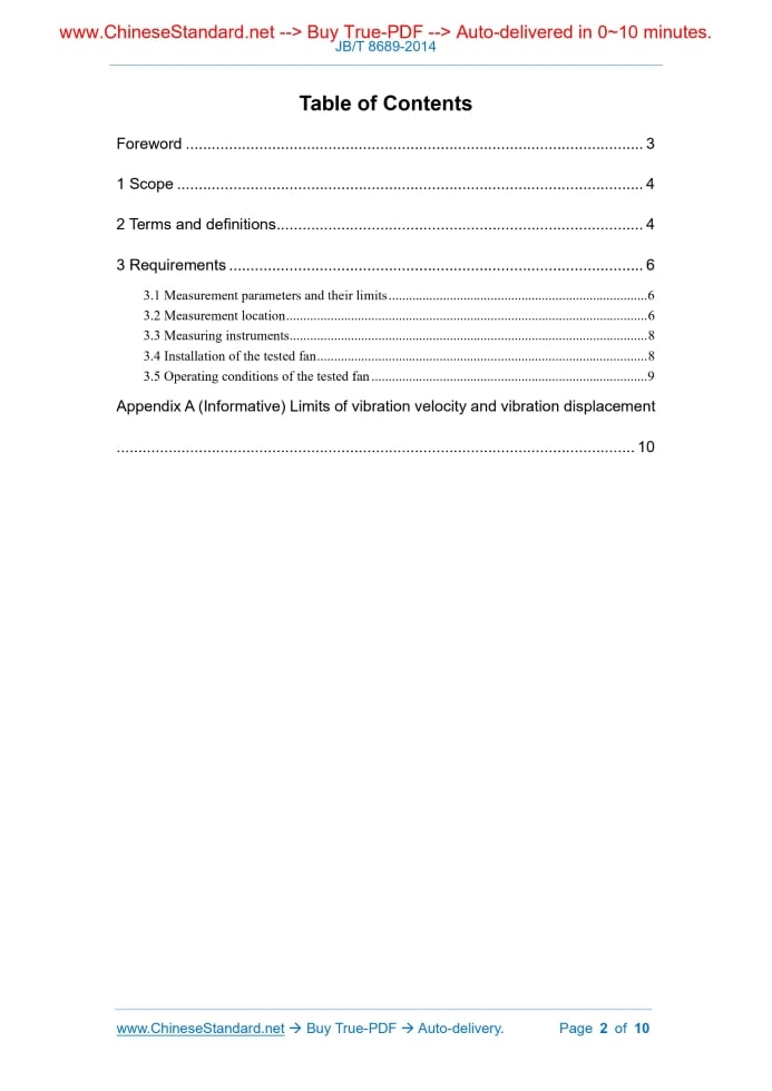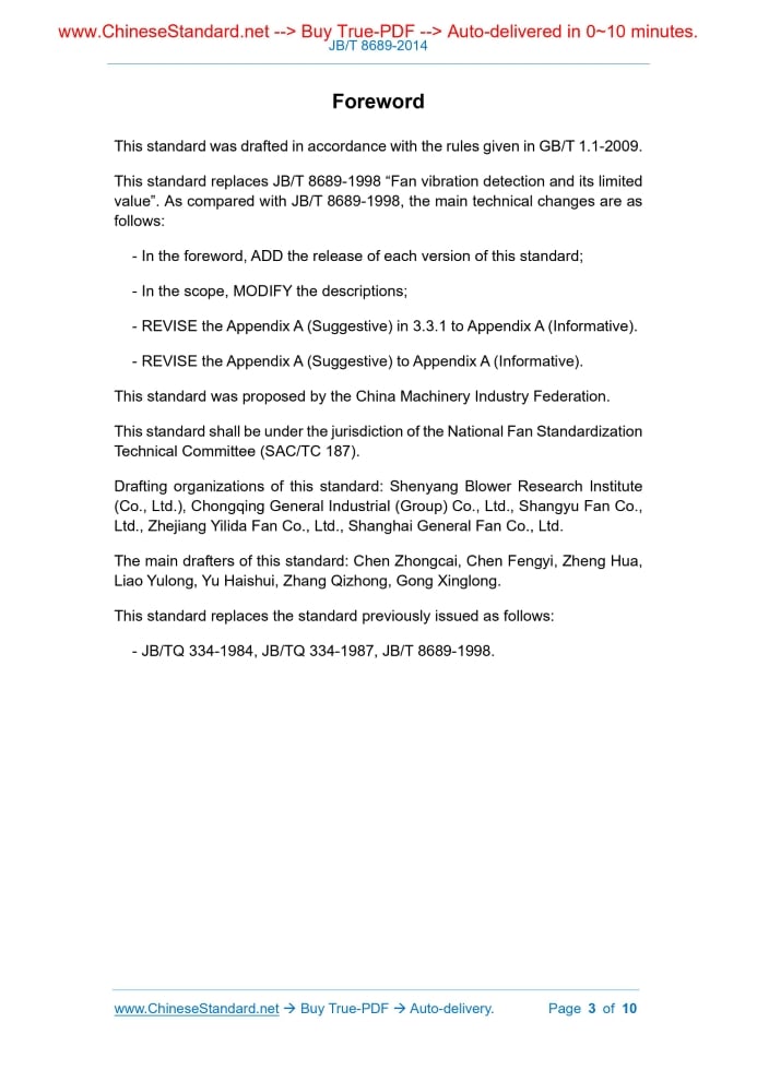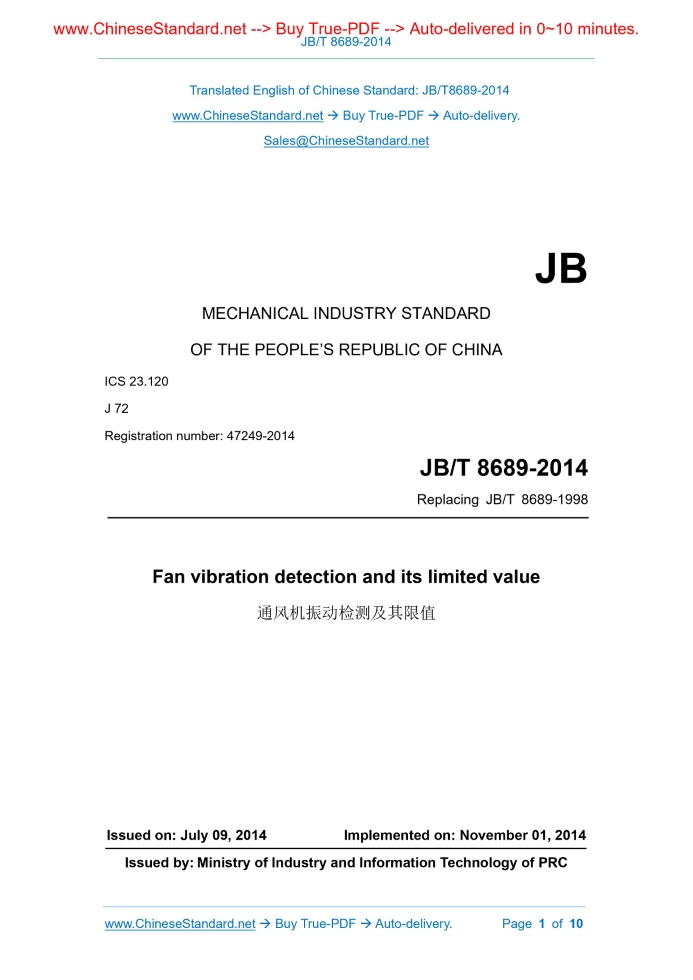 Similar standardsJB/T 8689-2014: Fan vibration detection and its limited value---This is an excerpt. Full copy of true-PDF in English version (including equations, symbols, images, flow-chart, tables, and figures etc.), auto-downloaded/delivered in 9 seconds, can be purchased online: https://www.ChineseStandard.net/PDF.aspx/JBT8689-2014MECHANICAL INDUSTRY STANDARD OF THE PEOPLE’S REPUBLIC OF CHINA ICS 23.120 J 72 Registration number: 47249-2014 Replacing JB/T 8689-1998 Fan vibration detection and its limited value ISSUED ON: JULY 09, 2014 IMPLEMENTED ON: NOVEMBER 01, 2014 Issued by: Ministry of Industry and Information Technology of PRC Table of ContentsForeword ... 3 1 Scope ... 4 2 Terms and definitions ... 4 3 Requirements ... 6 3.1 Measurement parameters and their limits ... 6 3.2 Measurement location ... 6 3.3 Measuring instruments ... 8 3.4 Installation of the tested fan ... 8 3.5 Operating conditions of the tested fan ... 9 Appendix A (Informative) Limits of vibration velocity and vibration displacement ... 10ForewordThis standard was drafted in accordance with the rules given in GB/T 1.1-2009. This standard replaces JB/T 8689-1998 “Fan vibration detection and its limited value”. As compared with JB/T 8689-1998, the main technical changes are as follows: - In the foreword, ADD the release of each version of this standard; - In the scope, MODIFY the descriptions; - REVISE the Appendix A (Suggestive) in 3.3.1 to Appendix A (Informative). - REVISE the Appendix A (Suggestive) to Appendix A (Informative). This standard was proposed by the China Machinery Industry Federation. This standard shall be under the jurisdiction of the National Fan Standardization Technical Committee (SAC/TC 187). Drafting organizations of this standard: Shenyang Blower Research Institute (Co., Ltd.), Chongqing General Industrial (Group) Co., Ltd., Shangyu Fan Co., Ltd., Zhejiang Yilida Fan Co., Ltd., Shanghai General Fan Co., Ltd. The main drafters of this standard: Chen Zhongcai, Chen Fengyi, Zheng Hua, Liao Yulong, Yu Haishui, Zhang Qizhong, Gong Xinglong. This standard replaces the standard previously issued as follows: - JB/TQ 334-1984, JB/TQ 334-1987, JB/T 8689-1998. Fan vibration detection and its limited value1 ScopeThis standard specifies the vibration limit of the operation of the fan, the measurement part of the vibration of the fan, the requirements of measuring instrument, the installation of the tested product, the operating conditions during the measurement. This standard is applicable to the exit-factory inspection and type test of the centrifugal, axial and mixed flow fans as well as the acceptance of on-site vibration indicators.2 Terms and definitionsThe following terms and definitions apply to this document. 2.1 Root-mean-square value of vibration velocity The rms value of the vibration velocity, which is also called the effective value of the vibration velocity. For periodic vibration, it refers to the square root of the average value of the instantaneous value of the vibration velocity in a vibration period. Its mathematical expression is as follows: Where: vrms - The rms value of vibration velocity (effective value), in millimeters per second (mm/s); T - The vibration period, in seconds (s); v(t) - The function of the vibration velocity as a function of time t, in millimeters per second (mm/s); t - The independent variable of time, in seconds (s). For sinusoidal vibration at a single frequency, v(t) = vcoswt, the rms value of the vibration velocity as obtained by the above formula is: Where: v - Single peak of vibration velocity, in millimeters per second (mm/s). Where: X - The single peak value of vibration displacement, in millimeters (mm); w - The angular frequency, in radians per second (rad/s). 2.2 Periodic vibration The vibration whose vibration waveform repeats once per a time period P. 2.3 Rigid support After the fan is installed, when the basic natural frequency of the “fan-support system” is higher than the main working frequency of the fan, it is called rigid support. Note: Generally, fan is directly fixed and connected to the rigid foundation. 2.4 Flexible support After the fan is installed, when the basic natural frequency of the “fan-support system” is lower than the main working frequency of the fan, it is called flexible support. Note: Under special conditions, the fan is connected to the foundation through the vibration isolator. 3.5 Operating conditions of the tested fan 3.5.1 The fan shall be operated at a stable rated speed and rated conditions. If the fan has multiple rated speeds and rated conditions, it shall respectively measure the vibrations under various rated conditions. Take the maximum measured value to represent the vibration value of this fan. Meanwhile indicate the operating conditions at the time of measurement. 3.5.2 Due to the objective conditions, if the rated speed and the rated condition of the fan cannot be achieved at the same time during the test, it shall be as close as possible to the rated conditions at the rated speed, measure the vibration value and record the operating conditions during the measurement. 3.5.3 If the fan adopts the variable speed regulator to regulate the range of use, it shall, within the speed regulating range as specified for the fan, respectively measure the vibration value at 3 speeds: high, medium, low. At each speed, it shall be as close as possible to the working conditions. Take the maximum measured value to represent the vibration value of the fan. Meanwhile indicate the operating conditions at the time of measurement. 3.5.4 If the fan cannot meet the actual hot-state running conditions during test, it may, under the cold-state, use the conditions as close to the rated working conditions as possible as allowed for the motor. Meanwhile indicate the operating conditions at the time of measurement. 3.5.5 The difference between the vibration value of the fan when it is running and when it is not running sh