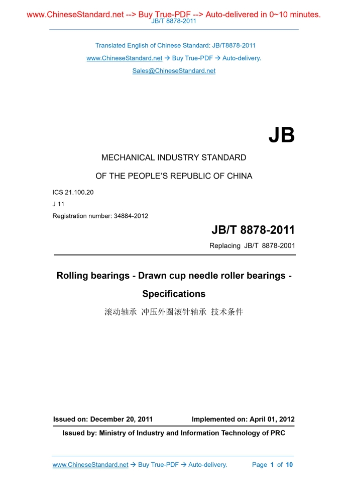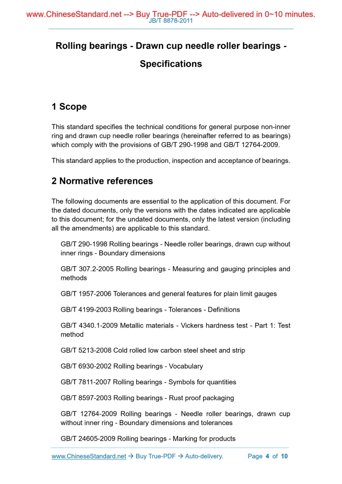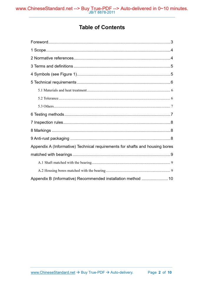 Similar standardsJB/T 8878-2011: Rolling bearings - Drawn cup needle roller bearings - Specifications---This is an excerpt. Full copy of true-PDF in English version (including equations, symbols, images, flow-chart, tables, and figures etc.), auto-downloaded/delivered in 9 seconds, can be purchased online: https://www.ChineseStandard.net/PDF.aspx/JBT8878-2011JB MECHANICAL INDUSTRY STANDARD OF THE PEOPLE’S REPUBLIC OF CHINA ICS 21.100.20 J 11 Registration number. 34884-2012 Replacing JB/T 8878-2001 Rolling bearings - Drawn cup needle roller bearings - Specifications Issued on: DECEMBER 20, 2011 Implemented on: APRIL 01, 2012 Issued by. Ministry of Industry and Information Technology of PRC Table of ContentsForeword ... 3 1 Scope ... 4 2 Normative references ... 4 3 Terms and definitions ... 5 4 Symbols (see Figure 1) ... 5 5 Technical requirements ... 6 5.1 Materials and heat treatment ... 6 5.2 Tolerance ... 6 5.3 Others ... 7 6 Testing methods ... 7 7 Inspection rules ... 8 8 Markings ... 8 9 Anti-rust packaging ... 8 Appendix A (Informative) Technical requirements for shafts and housing bores matched with bearings ... 9 A.1 Shaft matched with the bearing ... 9 A.2 Housing bores matched with the bearing ... 9 Appendix B (Informative) Recommended installation method ... 10 Rolling bearings - Drawn cup needle roller bearings - Specifications1 ScopeThis standard specifies the technical conditions for general purpose non-inner ring and drawn cup needle roller bearings (hereinafter referred to as bearings) which comply with the provisions of GB/T 290-1998 and GB/T 12764-2009. This standard applies to the production, inspection and acceptance of bearings.2 Normative referencesThe following documents are essential to the application of this document. For the dated documents, only the versions with the dates indicated are applicable to this document; for the undated documents, only the latest version (including all the amendments) are applicable to this standard. GB/T 290-1998 Rolling bearings - Needle roller bearings, drawn cup without inner rings - Boundary dimensions GB/T 307.2-2005 Rolling bearings - Measuring and gauging principles and methods GB/T 1957-2006 Tolerances and general features for plain limit gauges GB/T 4199-2003 Rolling bearings - Tolerances - Definitions GB/T 4340.1-2009 Metallic materials - Vickers hardness test - Part 1. Test method GB/T 5213-2008 Cold rolled low carbon steel sheet and strip GB/T 6930-2002 Rolling bearings - Vocabulary GB/T 7811-2007 Rolling bearings - Symbols for quantities GB/T 8597-2003 Rolling bearings - Rust proof packaging GB/T 12764-2009 Rolling bearings - Needle roller bearings, drawn cup without inner ring - Boundary dimensions and tolerances GB/T 24605-2009 Rolling bearings - Marking for productsAppendix A(Informative) Technical requirements for shafts and housing bores matched with bearings A.1 Shaft matched with the bearing A.1.1 The hardness of the journal’s fit surface is not less than 58 HRC. A.1.2 The maximum surface roughness of the journal’s fit surface is Ra0.2 μm. A.1.3 The journal has a dimensional tolerance of h5 (h6). A.1.4 The cylindricity of the journal’s fit surface shall not exceed 50% of the dimensional tolerance of the shaft. A.2 Housing bores matched with the bearing A.2.1 The maximum surface roughness of the fit surface of the housing bore is Ra0.8 μm. A.2.2 Dimensional tolerance of the housing bore is selected according to the material of the seat based on Table A.1. Table A.1 Materials of bearing seat Dimensional tolerance of bearing seat’s bore Steel or cast iron Light alloy or wall thickness less than 6 mm N6 (N7) R6 (R7) A.2.3 The cylindricality of the fit surface of the housing bore shall not exceed 50% of the dimensional tolerance of the housing bore. ......Source: Above contents are excerpted from the full-copy PDF -- translated/reviewed by: www.ChineseStandard.net / Wayne Zheng et al. Tips & Frequently Asked Questions:Question 1: How long will the true-PDF of English version of JB/T 8878-2011 be delivered?Answer: The full copy PDF of English version of JB/T 8878-2011 can be downloaded in 9 seconds, and it will also be emailed to you in 9 seconds (double mechanisms to ensure the delivery reliably), with PDF-invoice.Question 2: Can I share the purchased PDF of JB/T 8878-2011_English with my colleagues?Answer: Yes. The purchased PDF of JB/T 8878-2011_English will be deemed to be sold to your employer/organization who actually paid for it, including your colleagues and your employer's intranet.Question 3: Does the price include tax/VAT?Answer: Yes. Our tax invoice, downloaded/delivered in 9 seconds, includes all tax/VAT and complies with 100+ countries' tax regulations (tax exempted in 100+ countries) -- See Avoidance of Double Taxation Agreements (DTAs): List of DTAs signed between Singapore and 100+ countriesQuestion 4: Do you accept my currency other than USD?Answer: Yes. www.ChineseStandard.us -- JB/T 8878-2011 -- Click this link and select your country/currency to pay, the exact amount in your currency will be printed on the invoice. Full PDF will also be downloaded/emailed in 9 seconds.Question 5: Should I purchase the latest version JB/T 8878-2011?Answer: Yes. Unless special scenarios such as technical constraints or academic study, you should always prioritize to purchase the latest version JB/T 8878-2011 even if the enforcement date is in future. Complying with the latest version means that, by default, it also complies with all the earlier versions, technically.How to buy and download a true PDF of English version of JB/T 8878-2011?A step-by-step guide to download PDF of JB/T 8878-2011_EnglishStep 1: Visit website https://www.ChineseStandard.net (Pay in USD), or https://www.ChineseStandard.us (Pay in any currencies such as Euro, KRW, JPY, AUD).Step 2: Search keyword "JB/T 8878-2011". Step 3: Click "Add to Cart". If multiple PDFs are required, repeat steps 2 and 3 to add up to 12 PDFs to cart. Step 