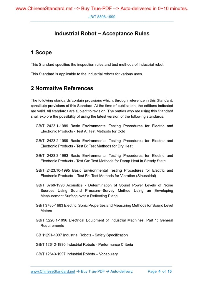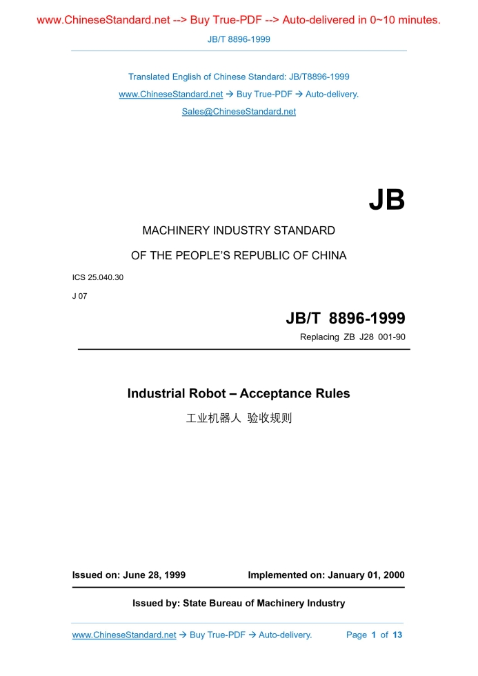 JB/T 8896-1999: Industrial robot. Acceptance rules Delivery: 9 seconds. True-PDF full-copy in English & invoice will be downloaded + auto-delivered via email. See step-by-step procedure