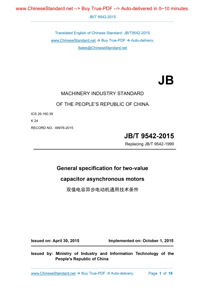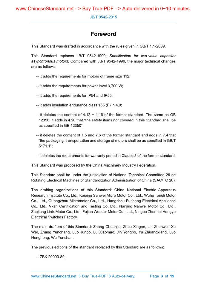 Similar standardsJB/T 9542-2015: General specification for two-value capacitor asynchronous motors---This is an excerpt. Full copy of true-PDF in English version (including equations, symbols, images, flow-chart, tables, and figures etc.), auto-downloaded/delivered in 9 seconds, can be purchased online: https://www.ChineseStandard.net/PDF.aspx/JBT9542-2015JB MACHINERY INDUSTRY STANDARD ICS 29.160.39 K 24 RECORD NO.. 49976-2015 Replacing JB/T 9542-1999 General specification for two-value capacitor asynchronous motors Issued on. APRIL 30, 2015 Implemented on. OCTOBER 1, 2015 Issued by. Ministry of Industry and Information Technology of the People's Republic of China Table of ContentsForeword... 3 1 Scope... 5 2 Normative references... 5 3 Types, basic parameters and dimensions... 6 4 Technical requirements... 12 5 Test methods... 16 6 Inspection rules... 16 7 Marking, packaging, storage and transportation... 19ForewordThis Standard was drafted in accordance with the rules given in GB/T 1.1-2009. This Standard replaces JB/T 9542-1999, Specification for two-value capacitor asynchronous motors. Compared with JB/T 9542-1999, the major technical changes are as follows. -- it adds the requirements for motors of frame size 112; -- it adds the requirements for power level 3,700 W; -- it adds the requirements for IP54 and IP55; -- it adds insulation endurance class 155 (F) in 4.9; -- it deletes the content of 4.12 ~ 4.16 of the former standard. The same as GB 12350, it adds in 4.20 that “the safety items nor covered in this Standard shall be as specified in GB 12350”; -- it deletes the content of 7.5 and 7.6 of the former standard and adds in 7.4 that “the packaging, transportation and storage of motors shall be as specified in GB/T 5171.1”; -- it deletes the requirements for warranty period in Clause 8 of the former standard. This Standard was proposed by the China Machinery Industry Federation. This Standard shall be under the jurisdiction of National Technical Committee 26 on Rotating Electrical Machines of Standardization Administration of China (SAC/TC 26). The drafting organizations of this Standard. China National Electric Apparatus Research Institute Co., Ltd., Kaiping Sanwei Micro Motor Co., Ltd., Wuhu Tongli Motor Co., Ltd., Guangzhou Micromotor Co., Ltd., Hangzhou Fusheng Electrical Appliance Co., Ltd., Vkan Certification and Testing Co. Ltd., Nanjing Nanwei Motor Co., Ltd., Zhejiang Linix Motor Co., Ltd., Fujian Wonder Motor Co., Ltd., Ningbo Zhenhai Hongye Electrical Switches Factory. The main drafters of this Standard. Zhang Chuanjia, Zhou Xingen, Lin Zhenwei, Xu Wei, Zhang Yunchang, Luo Junbo, Lu Xiaomao, Jin Yongbo, Yu Zhuangxiang, Luo Honghong, Wu Yunshan. The previous editions of the standard replaced by this Standard are as follows. -- ZBK 20003-89; -- JB/T 9542-1999. General specification for two-value capacitor asynchronous motors1 ScopeThis Standard specifies the types, basic parameters and dimensions, technical requirements, test methods, inspection rules, marking, packaging, storage and transportation for two-value capacitor asynchronous motors. This Standard applies to two-value capacitor asynchronous motors (frame size 71 ~ 112) (hereinafter referred to as motors); for all kinds of motors derived from this series of motors, this Standard can be referred to.2 Normative referencesThe following referenced documents are indispensable for the application of this document. For dated references, only the edition dated applies to this document. For undated references, the latest edition of the referenced documents (including all amendments) applies to this document. GB 755, Rotating electrical machines – Rating and performance GB/T 4942.1, Degrees of protection provided by the integral design of rotating electrical machined (IP code) – Classification GB/T 5171.1, Small power motors – Part 1.General technical requirements GB/T 9651, Test procedures for single-phase induction motor3 Types, basic parameters and dimensions3.1 Degrees of protection provided by enclosure of motors are IP44, IP54 and IP55. 3.2 Cooling method for motors is IC41. 3.3 Types of construction and mounting of motors shall be manufactured as specified in Table 1. 3.4 Ratings of motors are continuous ratings based on the continuous load duty (S1). 3.5 Rated power of motors is 50 Hz; rated voltage is 220 V. 3.8 Dimensions and tolerances of motors.4 Technical requirements4.1 Under the following environmental conditions, motors shall be capable of operating in the rated state. 4.6 Under rated voltages and rated frequencies, the guarantee values of the ratio of motors’ maximum torques to rated torques is 1.7. 4.7 Under rated voltages and rated frequencies, the guarantee values of motors’ locked-rotor currents shall be as specified in Table 16. 4.12 The noise limits on A-weighted acoustic power levels during no-load operation of motors shall not exceed the values specified in Table 18; the tolerance of noise value at level N is + 3 dB. 4.16 When motors are wired as shown in Figure 6, seeing from the shaft extension ends, motors rotates clockwise. 4.19 Manufacturers shall guarantee that within one year of use, motors are capable of operating normally in not exceeding two years’ time after the manufacturing date of manufacturers, provided that users use and store motors correctly as specified in instructions for use and maintenance of manufacturers. If damages occur because of ill manufacturing within the time specified or motors are not able to operate normally, manufacturers shall repair or replace parts and even motors free of charge. 4.20 The safety items nor covered in this Standard shall be as specified in GB 12350.5 Test methods5.1 Electrical property test of motors shall be carried out as specified in this Standard and GB/T 9651. 5.2 Testing of vibration shall be carried out as specified in JB/T 10490. 5.3 Testing of noise shall be carried out as specified in GB/T 10069.1. 5.5 Test of enclosu