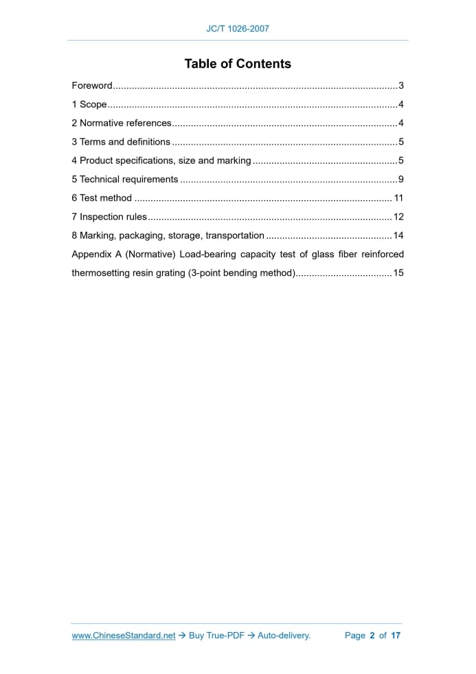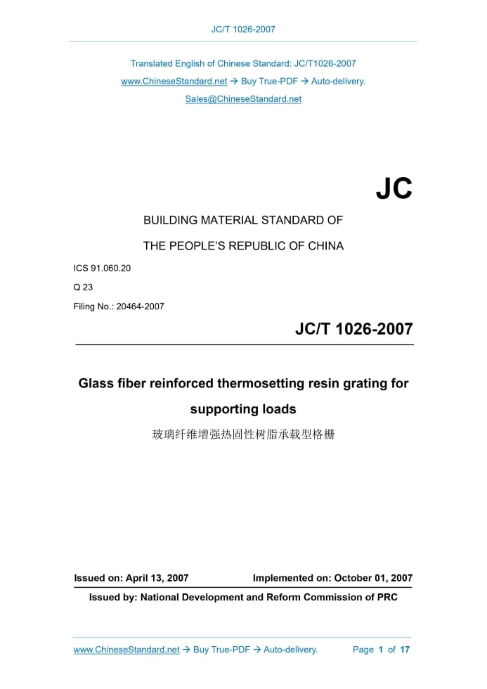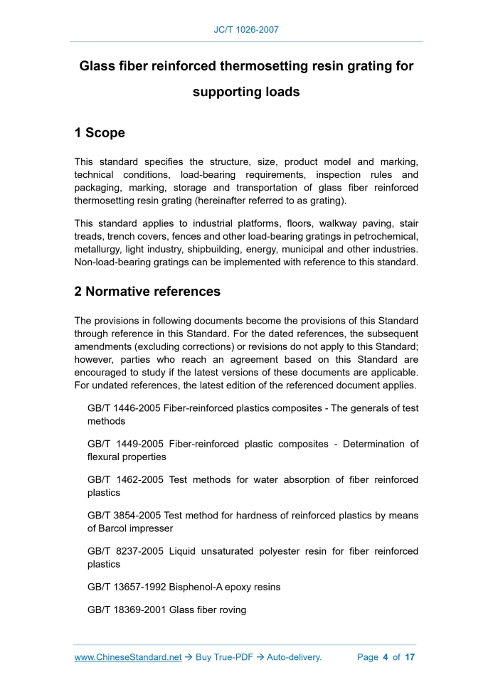 JC/T 1026-2007: Glass fiber reinforced thermosetting resin grating for supporting loads Delivery: 9 seconds. True-PDF full-copy in English & invoice will be downloaded + auto-delivered via email. See step-by-step procedure