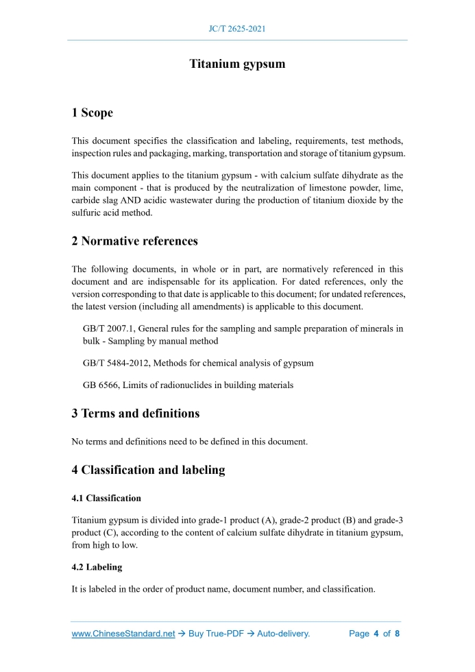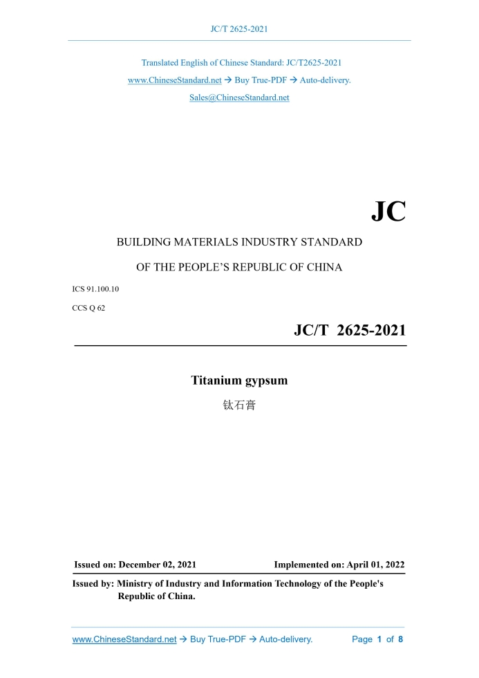 JC/T 2625-2021: Titanium gypsum Delivery: 9 seconds. True-PDF full-copy in English & invoice will be downloaded + auto-delivered via email. See step-by-step procedure Status: Valid