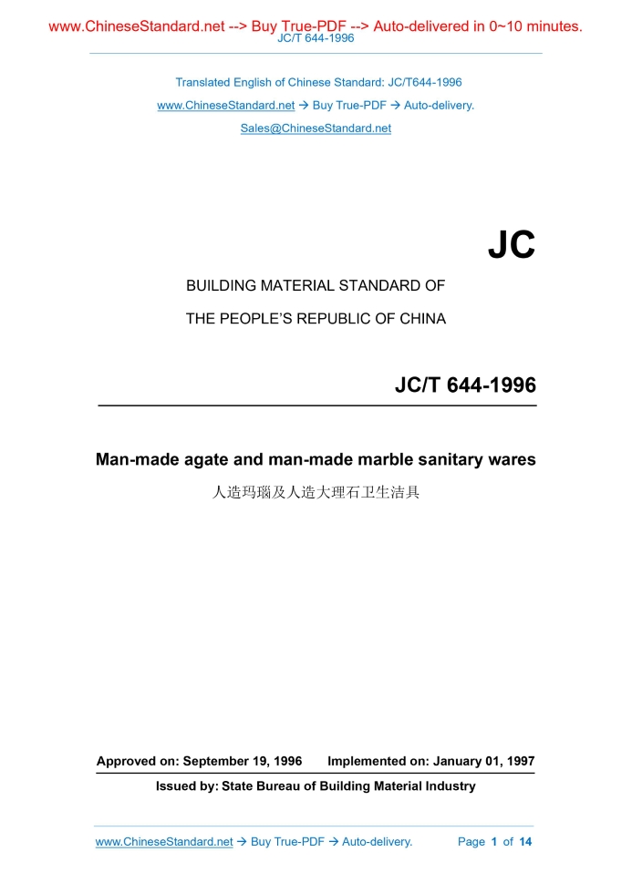 JC/T 644-1996: Man-made agate and man-made marble sanitary wares Delivery: 9 seconds. True-PDF full-copy in English & invoice will be downloaded + auto-delivered via email. See step-by-step procedure Status: Obsolete