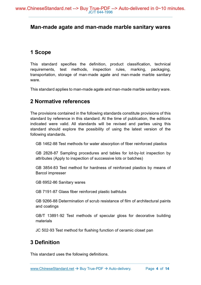 JC/T 644-1996: Man-made agate and man-made marble sanitary wares---This is an excerpt. Full copy of true-PDF in English version (including equations, symbols, images, flow-chart, tables, and figures etc.), auto-downloaded/delivered in 9 seconds, can be purchased online: https://www.ChineseStandard.net/PDF.aspx/JCT644-1996BUILDING MATERIAL STANDARD OF THE PEOPLE’S REPUBLIC OF CHINA Man-made agate and man-made marble sanitary wares 人造玛瑙及人造大理石卫生洁具 APPROVED ON: SEPTEMBER 19, 1996 IMPLEMENTED ON: JANUARY 01, 1997 Issued by: State Bureau of Building Material Industry Table of ContentsForeword ... 3 1 Scope ... 4 2 Normative references ... 4 3 Definition ... 4 4 Product classification ... 7 5 Technical requirements ... 8 6 Test methods ... 9 7 Inspection rules ... 12 8 Marking, packaging, transportation and storage ... 13 Man-made agate and man-made marble sanitary wares1 ScopeThis standard specifies the definition, product classification, technical requirements, test methods, inspection rules, marking, packaging, transportation, storage of man-made agate and man-made marble sanitary ware. This standard applies to man-made agate and man-made marble sanitary ware.2 Normative referencesThe provisions contained in the following standards constitute provisions of this standard by reference in this standard. At the time of publication, the editions indicated were valid. All standards will be revised and parties using this standard should explore the possibility of using the latest version of the following standards. GB 1462-88 Test methods for water absorption of fiber reinforced plastics GB 2828-87 Sampling procedures and tables for lot-by-lot inspection by attributes (Apply to inspection of successive lots or batches) GB 3854-83 Test method for hardness of reinforced plastics by means of Barcol impresser GB 6952-86 Sanitary wares GB 7191-87 Glass fiber reinforced plastic bathtubs GB 9266-88 Determination of scrub resistance of film of architectural paints and coatings GB/T 13891-92 Test methods of specular gloss for decorative building materials JC 502-93 Test method for flushing function of ceramic closet pan3 DefinitionThis standard uses the following definitions. The number of pitting within the range of Φ200 mm does not exceed 2. 3.7 Scratches The damage on the surface due to friction or the like. 3.7.1 Non-obvious scratches In the range of 1 m2 with the length × width not exceeding 50 mm x 0.1 mm, the number of scratches with a slight depth does not exceed 1. 3.8 Repair traces The traces left on the surface due to repair. 3.8.1 Non-obvious repair traces The surface repair is basically matched with the surroundings, with non- obvious difference in color. 3.9 Depression The local sinking of the surface of the product. 3.9.1 Non-obvious depression The number of depressions of not more than 1 mm2 within the range of 1 mm2 does not exceed 5. 3.10 Color difference The difference of color of the same product or the same set of products. 3.11 Impurities 6.4.2.1 Measuring tool Steel ruler with a length of 500 mm or 1000 mm; a feeler gauge with a precision of grade 2. 6.4.2.2 Measurement method Place the steel ruler vertically on a flat surface in different directions of the product. Insert the feeler gauge into the gap between the steel ruler and the surface of the product. Record the thickness of the feeler gauge. Each product is measured 3 times. 6.4.2.3 Calculation of results Where: F - Unevenness, %; L - Measured length, mm; D - Thickness measured by feeler gauge, mm. Take the average of 3 data and record the maximum value, accurate to 0.01%. 6.4.3 Determination of Barcol hardness According to GB 3854, the hardness tester's model is 934-1, which is carried out on the flat part of the cleaned face or the visible face of the product. 6.4.4 Test of load-bearing capacity It is carried according to 3.4 of GB 7191-87. 6.4.5 Test of impact resistance Take 3 points at the flat position at the bottom of the bathtub. The distance between each point is not less than 150 mm. Allow a steel ball which has a diameter of 30 mm (about 110 g) to freely fall from the height of 750 mm. If there is no crack at the point of impact, it is qualified. 6.4.6 Determination of water absorption It is carried out according to GB 1462. 6.4.7 Determination of gel-coating thickness 6.4.7.1 Instrument Reading microscope, which has a minimum division value of 0.02 mm. 6.4.7.2 Test methods From each specimen, cut a test strip of about 50 mm x 4 mm perpendicular to the gel-coating layer. Put the test strip on the specimen platform of the microscope with the cutting surface upwards. Read the thickness of the gel- coating. Make two measurements for each test strip. The thickness of the gel- coating is expressed by the average of five specimens, accurate to 0.01 mm. 6.4.8 Determination of cleanability It is carried out according to GB 9266. Remove the test plate after 10000 times of cleaning. Check the surface wear. 6.4.9 Test of hot water resistance 6.4.9.1 Instruments Super constant temperature bath or constant temperature water bath with an accuracy of ±2 °C. 6.4.9.2 Test methods Put the specimen in a thermostatic bath at a water temperature of 80 °C ± 2 °C. After 100 h, take it out, to check whether the surface is cracked or bubbled. 6.4.10 Pollution resistance test 6.4.10.1 Reagent Ethanol 3% hydrogen peroxide Acetone Tea 2% red mercury solution Vinegar 2% iodine solution Black liquid shoe polish Gentian violet Lipstick 6.4.10.2 Test method Use the absorbent cotton to dip the substances as listed in 6.4.10.1, respectively. Place it on the specimen. After 24h, wipe off the pollutant. Use detergent to wash it clean and wipe it dry. Check whether the surface of the specimen has color change. 6.4.11 Test of flushing function It is carried out according to JC 502. 7.3.2 Type inspection shall be sampled and judged according to Table 6. Table 6 -- Sampling inspection requirements of type inspection Sam