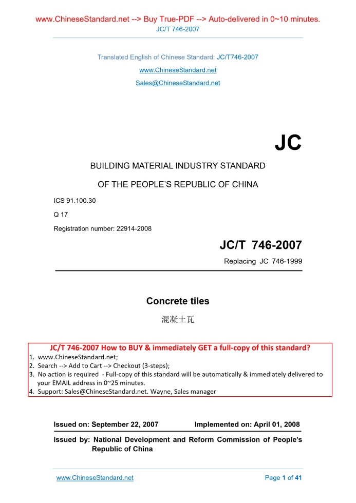 JC/T 746-2007: Concrete tiles Delivery: 9 seconds. True-PDF full-copy in English & invoice will be downloaded + auto-delivered via email. See step-by-step procedure Status: Obsolete JC/T 746: Historical versions