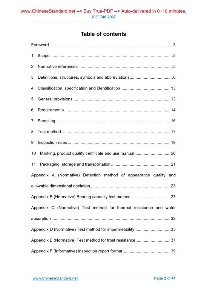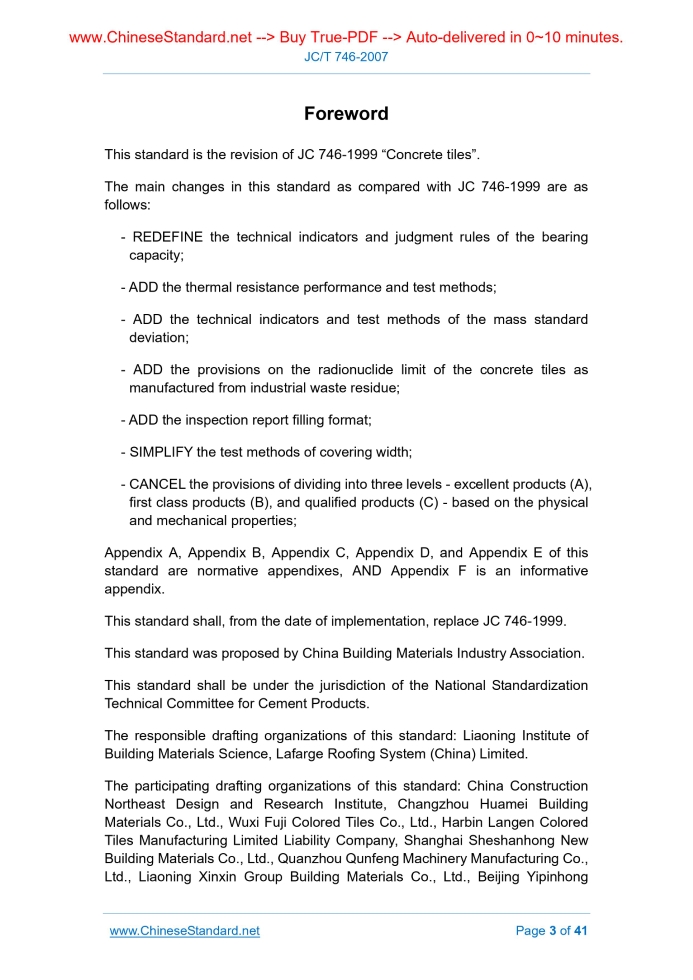 Similar standardsJC/T 746-2007: Concrete tiles---This is an excerpt. Full copy of true-PDF in English version (including equations, symbols, images, flow-chart, tables, and figures etc.), auto-downloaded/delivered in 9 seconds, can be purchased online: https://www.ChineseStandard.net/PDF.aspx/JCT746-2007JC BUILDING MATERIAL INDUSTRY STANDARD ICS 91.100.30 Q 17 Registration number. 22914-2008 Replacing JC 746-1999 Concrete tiles 混凝土瓦 Issued on: SEPTEMBER 22, 2007 Implemented on: APRIL 01, 2008 Issued by. National Development and Reform Commission of People’s Republic of China Table of ContentsForeword... 3 1 Scope... 5 2 Normative references... 5 3 Definitions, structures, symbols and abbreviations... 6 4 Classification, specification and identification... 13 5 General provisions... 13 6 Requirements... 14 7 Sampling... 16 8 Test method... 17 9 Inspection rules... 19 10 Marking, product quality certificate and use manual... 20 11 Packaging, storage and transportation... 21 Appendix A (Normative) Detection method of appearance quality and allowable dimensional deviation... 23 Appendix B (Normative) Bearing capacity test method... 27 Appendix C (Normative) Test method for thermal resistance and water absorption... 32 Appendix D (Normative) Test method for impermeability... 35 Appendix E (Normative) Test method for frost resistance... 37 Appendix F (Informative) Inspection report format... 39ForewordThis standard is the revision of JC 746-1999 “Concrete tiles”. The main changes in this standard as compared with JC 746-1999 are as follows. - REDEFINE the technical indicators and judgment rules of the bearing capacity; - ADD the thermal resistance performance and test methods; - ADD the technical indicators and test methods of the mass standard deviation; - ADD the provisions on the radionuclide limit of the concrete tiles as manufactured from industrial waste residue; - ADD the inspection report filling format; - SIMPLIFY the test methods of covering width; - CANCEL the provisions of dividing into three levels - excellent products (A), first class products (B), and qualified products (C) - based on the physical and mechanical properties; Appendix A, Appendix B, Appendix C, Appendix D, and Appendix E of this standard are normative appendixes, AND Appendix F is an informative appendix. This standard shall, from the date of implementation, replace JC 746-1999. This standard was proposed by China Building Materials Industry Association. This standard shall be under the jurisdiction of the National Standardization Technical Committee for Cement Products. The responsible drafting organizations of this standard. Liaoning Institute of Building Materials Science, Lafarge Roofing System (China) Limited. The participating drafting organizations of this standard. China Construction Northeast Design and Research Institute, Changzhou Huamei Building Materials Co., Ltd., Wuxi Fuji Colored Tiles Co., Ltd., Harbin Langen Colored Tiles Manufacturing Limited Liability Company, Shanghai Sheshanhong New Building Materials Co., Ltd., Quanzhou Qunfeng Machinery Manufacturing Co., Ltd., Liaoning Xinxin Group Building Materials Co., Ltd., Beijing Yipinhong Concrete tiles1 ScopeThis standard specifies the definition, structure, symbol, abbreviation, classification, specification, identification, general rules, requirements, sampling, test methods, inspection rules, marking, product quality certificate, instruction manual, packaging, storage and transportation of concrete tiles. This standard is applicable to concrete sloping roof tiles made of cement, fine aggregate, water, and other main raw materials through mixing, extrusion, hydrostatic molding, or other molding methods AND their matching concrete fitting tiles. The concrete tiles may be native tiles, colored tiles or surface treated tiles.2 Normative referencesThe provisions in following documents become the provisions of this Standard through reference in this Standard. For the dated references, the subsequent amendments (excluding corrections) or revisions do not apply to this Standard; however, parties who reach an agreement based on this Standard are encouraged to study if the latest versions of these documents are applicable. For undated references, the latest edition of the referenced document applies. GB 175 Portland cement and ordinary portland cement GB 1344 Portland blast furnace slag cement, Portland pozzolana cement, and Portland flay-ash cement GB/T 1596 Fly ash used for cement and concrete GB/T 2015 White portland cement GB 6566 Limit for radionuclides in building materials GB 8076 Concrete admixtures GB 12958 Composite portland cement GB/T 14684 Sand for construction JC/T 539 Pigments used in concrete and mortar and their test method JC/T 870 Colored portland cement JGJ 63 Standard of water for concrete YBJ 205-1984 Technical requirements for blast furnace heavy crushed slag for concrete use3 Definitions, structures, symbols and abbreviationsThe following terms and definitions apply to this standard. 3.1 Definition 3.1.1 Concrete tiles It is a general term of roofage tiles and fitting tiles made of concrete. 3.2.2 Concrete roofage tiles It refers to the building product made of concrete AND paved on the sloping roof to function as tiled roof together with the fitting tiles (shortly referred to as the roofage tiles). 3.1.2.1 Concrete roofage wavy tiles It refers to the tiles paved on the sloping roof, for which the cross section is in wave shape (shortly referred to as wavy tiles). 3.2.2.2 Concrete roofage flat tiles It refers to the tiles paved on the sloping roof, for which the cross section edge is in straight line shape (shortly referred to as flat tiles). 3.1.3 Concrete fittings tiles It refers to the building products made of concrete AND paved on the specific location of the sloping roof to satisfy the special functional Bx - Lower base width of the roofage tile for which the front projection is right angle trapezoidal, in milli