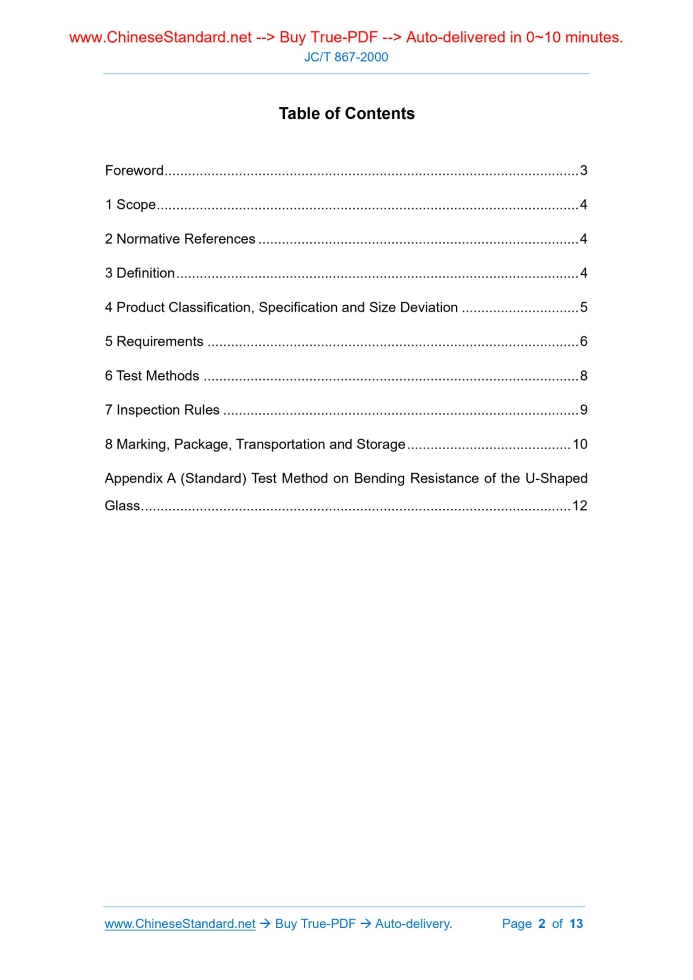Similar standardsJC/T 867-2000: Construction U shape glass---This is an excerpt. Full copy of true-PDF in English version (including equations, symbols, images, flow-chart, tables, and figures etc.), auto-downloaded/delivered in 9 seconds, can be purchased online: https://www.ChineseStandard.net/PDF.aspx/JCT867-2000JC NATIONAL BUILDING MATERIALS INDUSTRY STANDARD OF THE PEOPLE’S REPUBLIC OF CHINA Construction U Shape Glass Issued on: SEPTEMBER 13, 2000 Implemented on: JANUARY 01, 2001 Issued / Approved by. State Construction Materials Industry Administration Table of ContentsForeword ... 3 1 Scope ... 4 2 Normative References ... 4 3 Definition ... 4 4 Product Classification, Specification and Size Deviation ... 5 5 Requirements ... 6 6 Test Methods ... 8 7 Inspection Rules ... 9 8 Marking, Package, Transportation and Storage ... 10 Appendix A (Standard) Test Method on Bending Resistance of the U-Shaped Glass ... 12ForewordAll the technical contents of this Standard are mandatory. This Standard was formulated by referring to FOCT 21992-1983 Specifications of the Special-Shaped Glass for Construction and EN 57207-1994 Wired and Non-Wired U- Profile Glass. The appearance quality indicator and size specification are formulated by referring to FOCT 21992-1983; while other indicators and inspection methods are formulated by referring to EN 57207-1994. Meanwhile, the bending strength indicator and the inspection method are determined according to the characteristics of U- shaped glass and the domestic product condition. The Appendix A of this Standard is the standard appendix. This Standard was drafted and under the jurisdiction of Qinhuangdao Glass Research and Design Institute of State Construction Materials Industry Administration. Participating drafting organization of this Standard. Yunnan Kunming Chuangan U- Shaped Glass Co., Ltd. Chief drafting staffs of this Standard. Wang Yongheng, Lai Jiahua, and Yang Helu. Construction U Shape Glass1 ScopeThis Standard specifies the classification, size specification, requirements, inspection methods, inspection rules, package, transportation and storage of U-shaped glass. This Standard is applicable to the U-shaped glass for construction and the like.2 Normative ReferencesThe following standards contain provisions which, through reference in this Standard, constitute provisions of this Standard. At the time of publication, the editions indicated are valid. All standards are subject to revision. The parties who are using this Standard shall explore the possibility of using the latest version of the following standards. GB/T 707-1988 Hot-Rolled Channel Steel -- Dimensions, Shape, Weight and Tolerances GB/T 2680-1994 Determination of Light Transmittance, Solar Direct Transmittance, Total Solar Energy Transmittance and Ultraviolet Transmittance for Glass in Building and Related Glazing Factors (neq ISO 9050.1990) GB/T 6092-1985 Squares GB/T 9056-1988 Steel rulers (neq ISO 5466.1980)3 DefinitionThis Standard adopts the following definition. Construction U shape glass. glass produced mainly by continuous melting, calendaring, forming and annealing glass batch materials. than or equal to the number of allowable disqualified glass, then such batch of glass is qualified. If the number of the disqualified glass is greater than or equal to the number of disqualified glass for reference, then such batch of glass is disqualified; and the secondary sample is not necessary. If the number of disqualified glass in each sampling is greater than the number of allowable disqualified glass, but less than the number of disqualified glass for reference, then the secondary sampling is necessary. 7.3.2 If the number of disqualified glass in the accumulated quantity of the two samples is less than or equal to the allowable disqualified glass, then such batch of glass if qualified. If the number of disqualified glass in the accumulated quantity of the two samples is greater than or equal to the number of disqualified glass for reference, then such batch of glass is disqualified. 7.3.3 The metallic wire deviation, wing skewness, visible light transmittance, and bending resistance of the U-shaped glass shall also conform to the provisions of 5.5, 5.6, 5.8, 5.9. Otherwise, such item is considered unqualified. 7.3.4 If one of the above items is unqualified, then such batch of glass is disqualified.8 Marking, Package, Transportation and Storage8.1 The U-shaped or double U-shaped glass of the same type, the same specification, and the same grade can be in pairs with wing-to-wing; several pairs form a group; then use a tape or plastic strip to bundle; and place them into the wooden box; the box can be filled with foam and other materials for fixing and buffering effect. The outside of the package box shall be marked with the word “fragile”. 8.2 Each package box shall be accompanied with a packing list, the content of which shall include. a) Manufacturer name and product trademark; b) Glass model and color; c) The number of glass (m2); d) Packer No. and date of package. 8.3 The U-shaped glass can be transported by any means of transport. When transporting, the end of the glass shall be oriented toward the movement direction of the transporting tool. 8.4 The U-shaped glass shall be placed in a well-ventilated place with its front vertically ......Source: Above contents are excerpted from the full-copy PDF -- translated/reviewed by: www.ChineseStandard.net / Wayne Zheng et al. Tips & Frequently Asked Questions:Question 1: How long will the true-PDF of English version of JC/T 867-2000 be delivered?Answer: The full copy PDF of English version of JC/T 867-2000 can be downloaded in 9 seconds, and it will also be emailed to you in 9 seconds (double mechanisms to ensure the delivery reliably), with PDF-invoice.Question 2: Can I share the purchased PDF of JC/T 867-2000_English with my colleagues?Answer: Yes. The purchased PDF of JC/T 867-2000_English will be deemed to be sold to your e