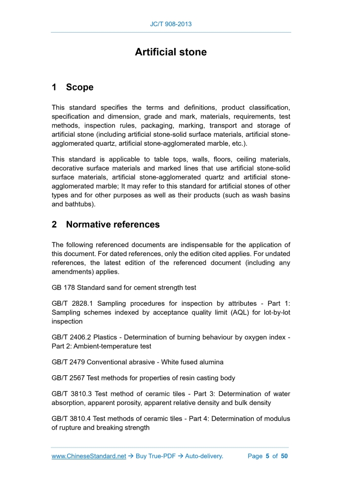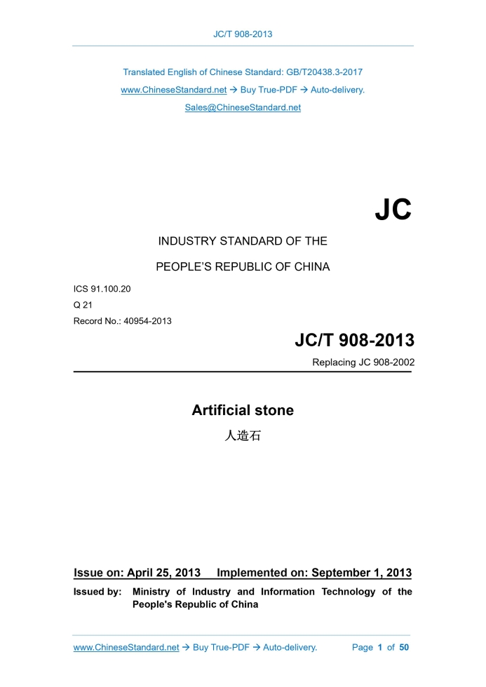 JC/T 908-2013: Artificial stone Delivery: 9 seconds. True-PDF full-copy in English & invoice will be downloaded + auto-delivered via email. See step-by-step procedure Status: Valid JC/T 908: Historical versions