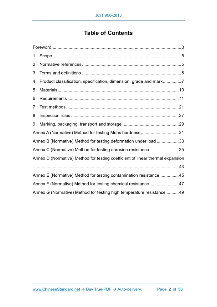 Similar standardsJC/T 908-2013: Artificial stone---This is an excerpt. Full copy of true-PDF in English version (including equations, symbols, images, flow-chart, tables, and figures etc.), auto-downloaded/delivered in 9 seconds, can be purchased online: https://www.ChineseStandard.net/PDF.aspx/JCT908-2013JC INDUSTRY STANDARD OF THE PEOPLE’S REPUBLIC OF CHINA ICS 91.100.20 Q 21 Record No.. 40954-2013 Replacing JC 908-2002 Artificial stone ISSUE ON. APRIL 25, 2013 Implemented on. SEPTEMBER 1, 2013 Issued by. Ministry of Industry and Information Technology of the People's Republic of China Table of ContentsForeword... 3 1 Scope... 5 2 Normative references... 5 3 Terms and definitions... 6 4 Product classification, specification, dimension, grade and mark... 7 5 Materials... 10 6 Requirements... 11 7 Test methods... 21 8 Inspection rules... 27 9 Marking, packaging, transport and storage... 29 Annex A (Normative) Method for testing Mohs hardness... 31 Annex B (Normative) Method for testing deformation under load... 33 Annex C (Normative) Method for testing abrasion resistance... 35 Annex D (Normative) Method for testing coefficient of linear thermal expansion ... 43 Annex E (Normative) Method for testing contamination resistance... 45 Annex F (Normative) Method for testing chemical resistance... 47 Annex G (Normative) Method for testing high temperature resistance... 491 ScopeThis standard specifies the terms and definitions, product classification, specification and dimension, grade and mark, materials, requirements, test methods, inspection rules, packaging, marking, transport and storage of artificial stone (including artificial stone-solid surface materials, artificial stone- agglomerated quartz, artificial stone-agglomerated marble, etc.). This standard is applicable to table tops, walls, floors, ceiling materials, decorative surface materials and marked lines that use artificial stone-solid surface materials, artificial stone-agglomerated quartz and artificial stone- agglomerated marble; It may refer to this standard for artificial stones of other types and for other purposes as well as their products (such as wash basins and bathtubs).2 Normative referencesThe following referenced documents are indispensable for the application of this document. For dated references, only the edition cited applies. For undated references, the latest edition of the referenced document (including any amendments) applies. GB 178 Standard sand for cement strength test GB/T 2828.1 Sampling procedures for inspection by attributes - Part 1. Sampling schemes indexed by acceptance quality limit (AQL) for lot-by-lot inspection GB/T 2406.2 Plastics - Determination of burning behaviour by oxygen index - Part 2.Ambient-temperature test GB/T 2479 Conventional abrasive - White fused alumina GB/T 2567 Test methods for properties of resin casting body GB/T 3810.3 Test method of ceramic tiles - Part 3.Determination of water absorption, apparent porosity, apparent relative density and bulk density GB/T 3810.4 Test methods of ceramic tiles - Part 4.Determination of modulus of rupture and breaking strength GB/T 3854 Test method for hardness of reinforced plastics by means of a Barcol impresser3 Terms and definitionsFor the purposes of this document, the following terms and definitions apply. 3.1 artificial stone The material that is made by mixing, coagulating and curing processes, etc. with high molecular polymer or cement or mixture of both as adhesive material and natural stone crushed (powder) material and/or natural quartzite (sand, powder) or aluminum hydroxide powder as main raw materials, and with pigment and other additives added, which mainly includes artificial stone-solid surface materials, artificial stone-agglomerated quartz and artificial stone- agglomerated marble. 3.2 artificial stone-solid surface materials (solid surface materials) The artificial stone that is formed by casting or vacuum molding or compression molding, with methyl methacrylate (MMA; commonly known as acrylic) or unsaturated polyester resin (UPR) as the matrix and aluminum hydroxide mainly as filling material, and with pigments and other adhesive materials added, whose scientific name is mineral-filled polymer composite which is referred to as solid surface material for short. Note. the composite material is non-porous and homogeneous. the composition throughout the whole thickness is uniform; they may be made into a continuous surface where seams are difficult to detect, with the surface of products capable of being restored by maintenance and renovation.4 Product classification, specification, dimension, grade and mark4.1 Classification Products are classified into three types by main raw materials. 4.2 Specification and dimension 4.2.1 Artificial stone-solid surface materials The plate is classified by side length (length × width) × thickness into three standard types of specifications and dimensions (in millimeters). 4.2.2 Agglomerated quartz The common specifications and dimensions for rectangular products are specified in Table 1; other specifications and dimensions shall be agreed by the supplier and the demander. 4.2.3 Agglomerated marble The common specifications and dimensions for rectangular products are specified in Table 2; other specifications and dimensions shall be agreed by the supplier and the demander. 4.3 Grade 4.3.1 Solid surface materials The products are classified into Excellent Grade A and Qualified Grade B according to Barcol hardness and falling ball impact. 4.4 Mark 4.4.1 Solid surface materials The solid surface materials shall be marked in the order of product Chinese name, English abbreviation of matrix resin, specification and dimension code, nominal thickness, grade and this standard number. Example. Type I Grade A solid surface material meeting the requirements of this standard, with polymethyl methacrylate as matrix and a thickness of 12.0 mm shall be marked as. 4.4.3 Agglomerated marble The agglome
