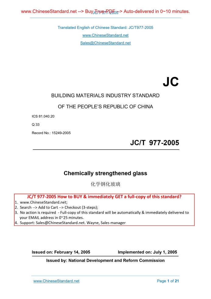 JC/T 977-2005: Chemically strengthened glass Delivery: 9 seconds. True-PDF full-copy in English & invoice will be downloaded + auto-delivered via email. See step-by-step procedure Status: Valid