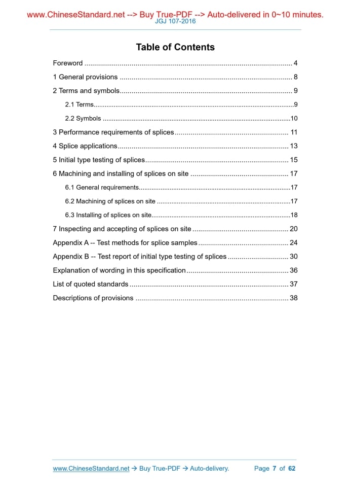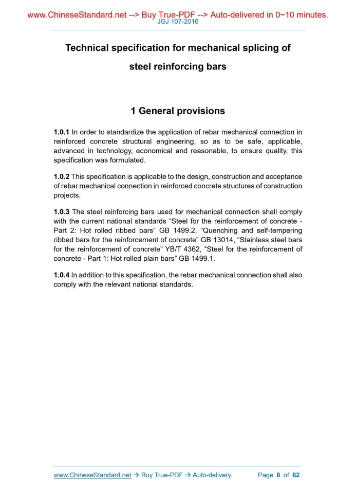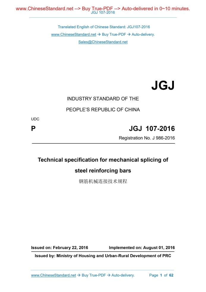 Similar standardsJGJ 107-2016: Technical specification for mechanical splicing of steel reinforcing bars---This is an excerpt. Full copy of true-PDF in English version (including equations, symbols, images, flow-chart, tables, and figures etc.), auto-downloaded/delivered in 9 seconds, can be purchased online: https://www.ChineseStandard.net/PDF.aspx/JGJ107-2016INDUSTRY STANDARD OF THE PEOPLE��S REPUBLIC OF CHINA UDC P JGJ 107-2016 Registration No. J 986-2016 Technical specification for mechanical splicing of steel reinforcing bars Issued on. FEBRUARY 22, 2016 Implemented on. AUGUST 01, 2016 Issued by. Ministry of Housing and Urban-Rural Development of PRC INDUSTRY STANDARD OF THE PEOPLE��S REPUBLIC OF CHINA Technical specification for mechanical splicing of steel reinforcing bars Approved by. Ministry of Housing and Urban-Rural Development of PRC Date of implementation. August 1, 2016 2016 Beijing Announcement of Ministry of Housing and Urban- Rural Development of PRC No.1049 Table of ContentsForeword... 4 1 General provisions... 8 2 Terms and symbols... 9 2.1 Terms... 9 2.2 Symbols... 10 3 Performance requirements of splices... 11 4 Splice applications... 13 5 Initial type testing of splices... 15 6 Machining and installing of splices on site... 17 6.1 General requirements... 17 6.2 Machining of splices on site... 17 6.3 Installing of splices on site... 18 7 Inspecting and accepting of splices on site... 20 Appendix A -- Test methods for splice samples... 24 Appendix B -- Test report of initial type testing of splices... 30 Explanation of wording in this specification... 36 List of quoted standards... 37 Descriptions of provisions... 38 Technical specification for mechanical splicing of steel reinforcing bars1 General provisions1.0.1 In order to standardize the application of rebar mechanical connection in reinforced concrete structural engineering, so as to be safe, applicable, advanced in technology, economical and reasonable, to ensure quality, this specification was formulated. 1.0.2 This specification is applicable to the design, construction and acceptance of rebar mechanical connection in reinforced concrete structures of construction projects. 1.0.3 The steel reinforcing bars used for mechanical connection shall comply with the current national standards ��Steel for the reinforcement of concrete - Part 2.Hot rolled ribbed bars�� GB 1499.2, ��Quenching and self-tempering ribbed bars for the reinforcement of concrete�� GB 13014, ��Stainless steel bars for the reinforcement of concrete�� YB/T 4362, ��Steel for the reinforcement of concrete - Part 1.Hot rolled plain bars�� GB 1499.1. 1.0.4 In addition to this specification, the rebar mechanical connection shall also comply with the relevant national standards.2 Terms and symbols2.1 Terms 2.1.1 Rebar mechanical splicing A connection method for transmitting a force in one reinforcing bar to another reinforcing bar through mechanical occlusion of a reinforcing bar with a connecting member or other intervening material or pressure bearing effect on a reinforcing bar��s end face. 2.1.2 Splice In a complete set of devices of rebar mechanical connection, a shorted name of rebar mechanical connections. 2.2 Symbols Asgt - Total elongation of splice sample under maximum force; d - Nominal diameter of the steel reinforcing bar; fyk - Standard value of the yield strength of the steel reinforcing bar; fstk - Standard value of ultimate tensile strength of steel reinforcing bars; - The measured ultimate tensile strength of the splice sample; P - The pitch of thread; u0 - Residual deformation of the splice sample within the specified gauge after loading it to 0.6fyk and then unloading it;3 Performance requirements of splices3.0.1 The splice design shall meet the requirements of strength and deformation performance. 3.0.2 The sleeve for connection of steel reinforcing bar shall comply with the relevant specifications of the current industry standard ��Couplers for rebar mechanical splicing�� JG/T 163; when the sleeve��s raw material is a No.45 cold- drawn or cold-rolling precision seamless steel tube, the steel tube shall be annealed and meet the requirements of the requirements current industry standard ��Couplers for rebar mechanical splicing�� JG/T 163 for the strength limit and elongation at break of steel tubes. The raw material of the stainless steel rebar sleeve should use the bar or seamless steel tube of the same materials as the base material of steel reinforcing bar; its appearance and mechanical properties shall comply with the provisions of the current national standard ��Stainless steel bars�� GB/T 1220, ��Seamless stainless steel tubes for structure�� GB/T 14975. 3.0.3 Splice performance shall include unidirectional tensile, high-stress repeated tension-compression, large-deformation repeated tension- compression, fatigue performance. It shall, based on the performance grade and application of the splice, choose the corresponding inspection items. 3.0.4 Splices shall be divided into three grades. I, II, III, based on ultimate tensile strength, residual deformation, total elongation at maximum force, repeated tension-compression under high-stress and large-deformation conditions. The performances shall comply with the provisions of clauses 3.0.5 ~ 3.0.7 of this specification, respectively.4 Splice applications4.0.1 The selection of splice grades shall meet the following requirements. 4.0.2 The thickness of the concrete protective layer of the connector of mechanical splicing should comply with the provisions of the current national standard ��Code for design of concrete structures�� GB 50010, meanwhile it shall not be less than 0.75 times the minimum protective layer thickness of steel reinforcing bars and 15 mm, whichever is larger. If necessary, it may take anti- rust measures for the connector of mechanical splicing. 4.0.3 The splices of longitud