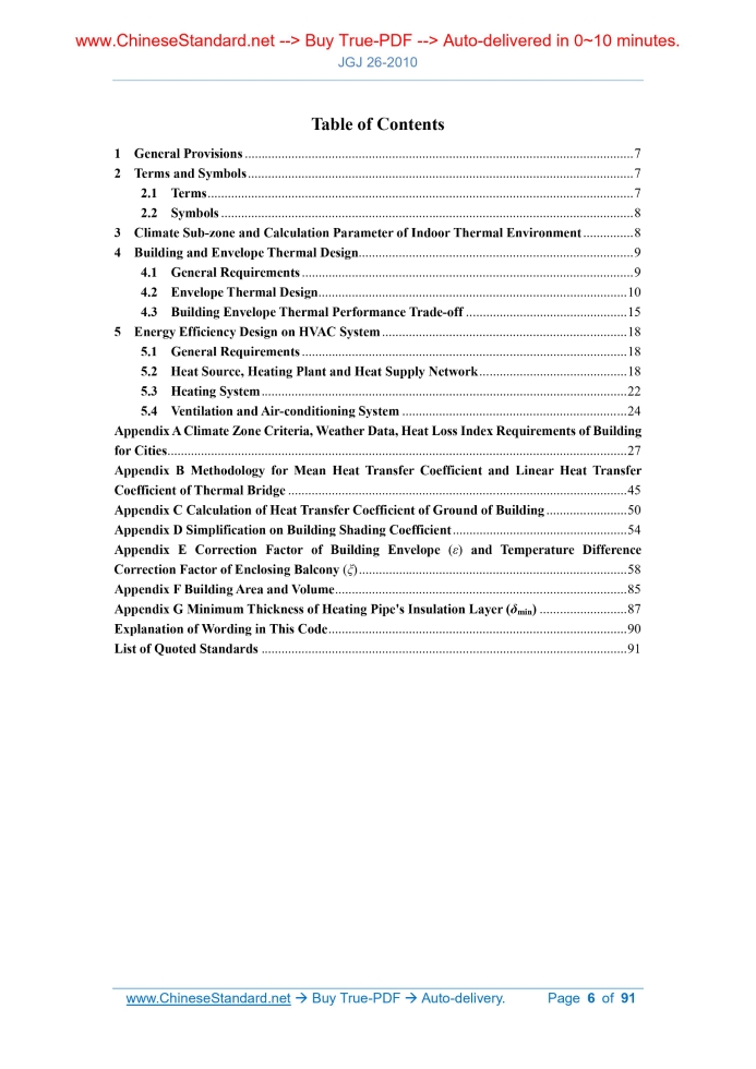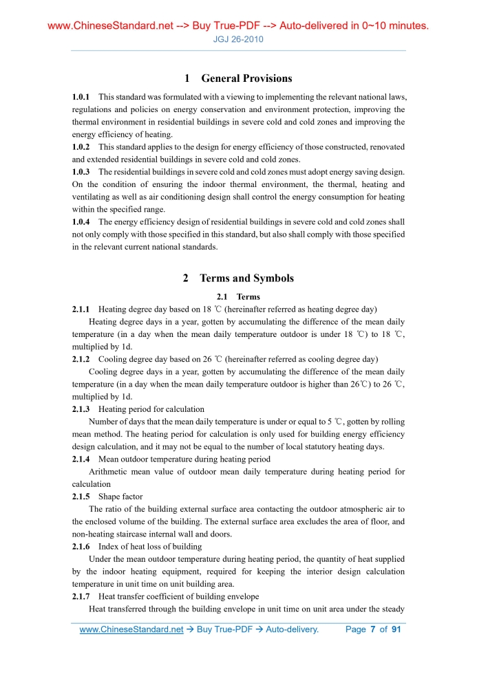 Similar standardsJGJ 26-2010: Design standard for energy efficiency of residential buildigns in severe cold and cold zones---This is an excerpt. Full copy of true-PDF in English version (including equations, symbols, images, flow-chart, tables, and figures etc.), auto-downloaded/delivered in 9 seconds, can be purchased online: https://www.ChineseStandard.net/PDF.aspx/JGJ26-2010 JGJ Industry Standard of the People's Republic of China P File No.. J 997-2010 Design Standard for Energy Efficiency of Residential Buildings in Severe Cold and Cold Zones Issued on: MARCH 18, 2010 Implemented on: AUGUST 1, 2010 Issued by. Ministry of Housing and Urban-Rural Development of the People's Republic of China Table of Contents1 General Provisions. 7 2 Terms and Symbols. 7 2.1 Terms. 7 2.2 Symbols. 8 3 Climate Sub-zone and Calculation Parameter of Indoor Thermal Environment. 8 4 Building and Envelope Thermal Design.. 9 4.1 General Requirements. 9 4.2 Envelope Thermal Design. 10 4.3 Building Envelope Thermal Performance Trade-off.. 15 5 Energy Efficiency Design on HVAC System. 18 5.1 General Requirements.. 18 5.2 Heat Source, Heating Plant and Heat Supply Network. 18 5.3 Heating System. 22 5.4 Ventilation and Air-conditioning System. 24 Appendix A Climate Zone Criteria, Weather Data, Heat Loss Index Requirements of Building for Cities.. 27 Appendix B Methodology for Mean Heat Transfer Coefficient and Linear Heat Transfer Coefficient of Thermal Bridge. 45 Appendix C Calculation of Heat Transfer Coefficient of Ground of Building. 50 Appendix D Simplification on Building Shading Coefficient. 54 Appendix E Correction Factor of Building Envelope (ε) and Temperature Difference Correction Factor of Enclosing Balcony (ξ). 58 Appendix F Building Area and Volume. 85 Appendix G Minimum Thickness of Heating Pipe's Insulation Layer (δmin). 87 Explanation of Wording in This Code. 90 List of Quoted Standards. 91 1 General Provisions 1.0.1 This standard was formulated with a viewing to implementing the relevant national laws, regulations and policies on energy conservation and environment protection, improving the thermal environment in residential buildings in severe cold and cold zones and improving the energy efficiency of heating. 1.0.2 This standard applies to the design for energy efficiency of those constructed, renovated and extended residential buildings in severe cold and cold zones. 1.0.3 The residential buildings in severe cold and cold zones must adopt energy saving design. On the condition of ensuring the indoor thermal environment, the thermal, heating and ventilating as well as air conditioning design shall control the energy consumption for heating within the specified range. 1.0.4 The energy efficiency design of residential buildings in severe cold and cold zones shall not only comply with those specified in this standard, but also shall comply with those specified in the relevant current national standards. 2 Terms and Symbols 2.1 Terms 2.1.1 Heating degree day based on 18 ℃ (hereinafter referred as heating degree day) Heating degree days in a year, gotten by accumulating the difference of the mean daily temperature (in a day when the mean daily temperature outdoor is under 18 ℃) to 18 ℃, multiplied by 1d. 2.1.2 Cooling degree day based on 26 ℃ (hereinafter referred as cooling degree day) Cooling degree days in a year, gotten by accumulating the difference of the mean daily temperature (in a day when the mean daily temperature outdoor is higher than 26℃) to 26 ℃, multiplied by 1d. 2.1.3 Heating period for calculation Number of days that the mean daily temperature is under or equal to 5 ℃, gotten by rolling mean method. The heating period for calculation is only used for building energy efficiency design calculation, and it may not be equal to the number of local statutory heating days. 2.1.4 Mean outdoor temperature during heating period Arithmetic mean value of outdoor mean daily temperature during heating period for calculation 2.1.5 Shape factor The ratio of the building external surface area contacting the outdoor atmospheric air to the enclosed volume of the building. The external surface area excludes the area of floor, and non-heating staircase internal wall and doors. 2.1.6 Index of heat loss of building Under the mean outdoor temperature during heating period, the quantity of heat supplied by the indoor heating equipment, required for keeping the interior design calculation temperature in unit time on unit building area. 2.1.7 Heat transfer coefficient of building envelope Heat transferred through the building envelope in unit time on unit area under the steady state condition that the air temperature difference on both sides of the building envelope is 1 ℃. 2.1.8 Mean heat transfer coefficient of external wall The heat transfer coefficient of external wall, in consideration of thermal bridge affect in wall. 2.1.9 Modification coefficient of building envelope Correction factor introduced in consideration of the influence of solar radiation on building envelope heat transmission. 2.1.10 Window to wall ratio The ratio of the window hole area to the room vertical plane unit area (area enclosed by building story height and bay position line). 2.1.11 Efficiency of boiler The efficiency of a boiler under actual operation condition during heating period. 2.1.12 Efficiency of network the ratio of the network output total heat to the total heat supplied into the network. 2.1.13 Ratio of electricity consumption to transferred heat quantity Under the heating calculated temperature indoor and outdoor, the ratio of the full-day theoretical pump power consumption to the full-day heating load. 2.2 Symbols 2.2.1 Weather data HDD18——Heating degree day, ℃·d; CDD26——Cooling degree day, ℃·d; Z——Heating period for calculation, d; te——Mean outdoor temperature during heating period, ℃. 2.2.2 Building S——Shape factor, 1/m; qH——Index of heat loss of building,W/m2; K