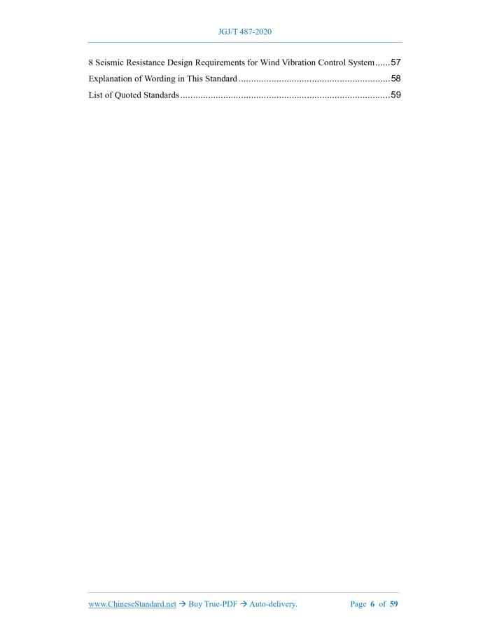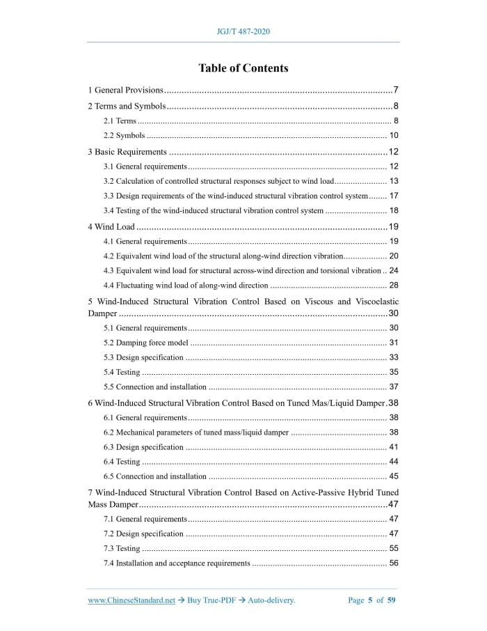 Similar standardsJGJ/T 487-2020: Technical standard for control of building vibration with wind load---This is an excerpt. Full copy of true-PDF in English version (including equations, symbols, images, flow-chart, tables, and figures etc.), auto-downloaded/delivered in 9 seconds, can be purchased online: https://www.ChineseStandard.net/PDF.aspx/JGJT487-2020UDC JGJ NATIONAL STANDARD OF THE PEOPLE’S REPUBLIC OF CHINA P JGJ/T 487-2020 Record No.. J2848-2020 Technical Standard for Control of Building Vibration with Wind Load Issued on. JUNE 29, 2020 Implemented on. NOVEMBER 01, 2020 Issued by. Ministry of Housing and Urban-Rural Development of the People’s Republic of China NATIONAL STANDARD OF THE PEOPLE’S REPUBLIC OF CHINA Technical Standard for Control of Building Vibration with Wind Load Approved by. Ministry of Housing and Urban-Rural Development of the People’s Republic of China Implemented on. NOVEMBER 01, 2020 2020 Beijing No.145 [2020] Announcement of the Ministry of Housing and Urban-Rural Development of the People’s Republic of China ForewordAccording to the requirements of the Ministry of Housing and Urban-Rural Development’s Notice on Issuing (Formulation and Revision Plan of Engineering Construction Standards and Specifications in 2013) (JB[2013]No.6), after extensive investigation and research, the standard formulation group carefully summed up practical experience, referred to relevant international standards and advanced foreign standards, and compiled this standard on the basis of extensive solicitation of opinions. The main technical contents of this Standard include. 1 General Provisions; 2 Terms and Symbols; 3 Basic Requirements; 4 Wind Load; 5 Wind-Induced Structural Vibration Control Based on Viscous and Viscoelastic Damper; 6 Wind-Induced Structural Vibration Control Based on Tuned Mass/Liquid Damper; 7 Wind-Induced Structural Vibration Control Based on Active-Passive Hybrid Tuned Mass Damper; 8 Seismic Resistance Design Requirements for Wind-Induced Structural Vibration Control System. This Standard was managed by the Ministry of Housing and Urban-Rural Development; and was interpreted technical contents by Harbin Institute of Technology. If any comments or suggestions arises during the implementation process, please send them to Harbin Institute of Technology (Address. Room 309, School of Civil Engineering, Harbin Institute of Technology, No.73 Huanghe Road, Nangang District, Harbin; Zip code. 150090) Chief drafting organization of this Standard. Harbin Institute of Technology Participating drafting organization of this Standard. Dalian University of Technology; Tongji University; Harbin Institute of Technology (Shenzhen); Guangzhou University; City University of Hong Kong; Beijing University of Technology; Beijing Institute of Architectural Design; China Academy of Building Research; China Electronics Engineering Design Institute Co., Ltd.; China Southwest Architectural Design and Research Institute Co., Ltd.; and CCDI International Design Consulting Co., Ltd. Chief drafting staffs of this Standard. Ou Jinping, Li Hui, Zhang Dongyu, Jin Xignyan, Chen Wenli, Gu Ming, Xiao Yiqing, Lou Yu, Guo Anxin, Feng Yuan, Tan Ping, Teng Jun, Yang Weibiao, Wu Bin, Fu Xueyi, Li Qiusheng, Yan Weiming, Guan Xinchun, Li Luyu, and Laima Shujin. Chief auditors of this Standard. Xu Jian, Yu Yinquan, Liang Shuguo, Xie Zhuangning, Li Shengyong, Zhang Lingxin, Xu Zhaodong, Li Shouying, and Duan Yuanfeng.Table of Contents1 General Provisions... 7 2 Terms and Symbols... 8 3 Basic Requirements... 12 4 Wind Load... 19 4.1 General requirements... 19 5 Wind-Induced Structural Vibration Control Based on Viscous and Viscoelastic Damper... 30 6 Wind-Induced Structural Vibration Control Based on Tuned Mas/Liquid Damper. 38 7 Wind-Induced Structural Vibration Control Based on Active-Passive Hybrid Tuned Mass Damper... 47 8 Seismic Resistance Design Requirements for Wind Vibration Control System... 57 Explanation of Wording in This Standard... 58 List of Quoted Standards... 591 General Provisions1.0.1 This Standard is formulated in order to reduce wind-induced vibration of building structures, improve structural safety, applicability and comfort; correctly use vibration control technology; achieve advanced technology, reasonable economy, safety and applicability, and ensure quality. 1.0.2 This Standard applies to the design, inspection and installation of wind-induced structural vibration control systems for new and existing building structures; it does not apply to long- span roof structures. 1.0.3 The combined system of controlled building structures and wind-induced structural vibration control system can also be used for structural seismic resistance control; when it is also used for structural seismic resistance control, it shall meet both the structural wind resistance and seismic resistance design requirements at the same time. 1.0.4 The design, inspection and installation of the wind-induced structural vibration control system of the building structure shall not only comply with the provisions of this Standard, but also comply with the provisions of current relevant national standards.2 Terms and Symbols2.1 Terms 2.1.1 Controlled structure The building structure installed wind-induced structural vibration control system. 2.1.2 Wind-induced structural vibration control system Components and devices that are installed on the controlled structure to provide control force for the structure, increase structural damping or change the structural stiffness to reduce the wind-induced response of the structure. 2.1.3 Combined system of controlled building structures and wind-induced vibration control system The system that is composed of controlled structure and wind-induced structural vibration control system. 2.1.4 Designed wind load The wind load that is used in the wind vibration control design and wind vibration response checking calculation of the controlled structure, including equiv