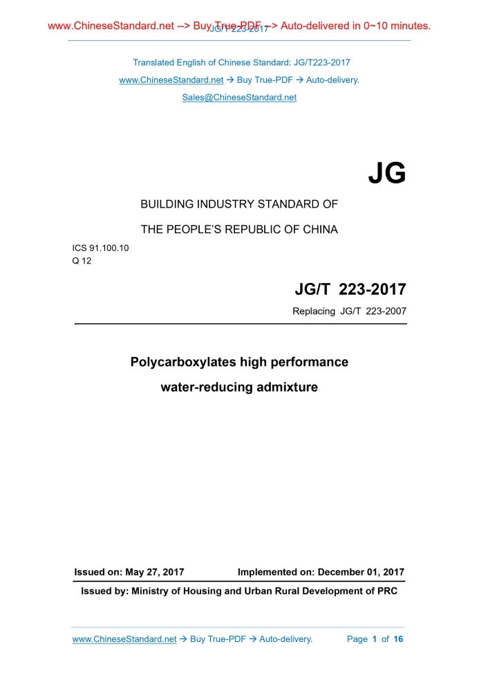 JG/T 223-2017: Polycarboxylates high performance water-reducing admixture Delivery: 9 seconds. True-PDF full-copy in English & invoice will be downloaded + auto-delivered via email. See step-by-step procedure Status: Valid JG/T 223: Historical versions