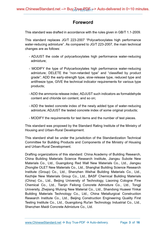 JG/T 223-2017: Polycarboxylates high performance water-reducing admixture---This is an excerpt. Full copy of true-PDF in English version (including equations, symbols, images, flow-chart, tables, and figures etc.), auto-downloaded/delivered in 9 seconds, can be purchased online: https://www.ChineseStandard.net/PDF.aspx/JGT223-2017JG BUILDING INDUSTRY STANDARD OF THE PEOPLE’S REPUBLIC OF CHINA ICS 91.100.10 Q 12 Replacing JG/T 223-2007 Polycarboxylates high performance water-reducing admixture Issued on: MAY 27, 2017 Implemented on: DECEMBER 01, 2017 Issued by. Ministry of Housing and Urban Rural Development of PRC Table of ContentsForeword ... 3 1 Scope ... 5 2 Normative references ... 5 3 Terms and definitions ... 6 4 Classification and marking ... 6 5 Requirements ... 7 6 Test methods ... 11 7 Inspection rules ... 12 8 Product specification and certificate, packaging ... 14 9 Exit-factory, transportation and storage... 15ForewordThis standard was drafted in accordance with the rules given in GB/T 1.1-2009. This standard replaces JG/T 223-2007 “Polycarboxylates high performance water-reducing admixture”. As compared to JG/T 223-2007, the main technical changes are as follows. - ADJUST the code of polycarboxylates high performance water-reducing admixture; - MODIFY the type of Polycarboxylates high performance water-reducing admixture; DELETE the “non-retarded type” and “classified by product grade”; ADD the early-strength type, slow-release type, reduced type and antifreeze type, GIVE the technical indicator requirements for various type products; - ADD the ammonia release index; ADJUST such indicators as formaldehyde content and chloride ion content, and so on; - ADD the tested concrete index of the newly added type of water-reducing admixture; ADJUST the tested concrete index of some original products; - MODIFY the requirements for test items and the number of test pieces. This standard was proposed by the Standard Rating Institute of the Ministry of Housing and Urban-Rural Development. This standard shall be under the jurisdiction of the Standardization Technical Committee for Building Products and Components of the Ministry of Housing and Urban-Rural Development. Drafting organizations of this standard. China Academy of Building Research, China Building Materials Science Research Institute, Jiangsu Subote New Materials Co., Ltd., Guangdong Red Wall New Materials Co., Ltd., Jiangsu Zhongtie OLET New Materials Co., Ltd., Shanghai Building Science Research Institute (Group) Co., Ltd., Shenzhen Weihai Building Materials Co., Ltd., Kezhijie New Materials Group Co., Ltd., BASF Chemical Building Materials (China) Co., Ltd., Beijing University of Technology, Liaoning Cologne Fine Chemical Co., Ltd., Tianjin Feilong Concrete Admixture Co., Ltd., Tongji University, Zhejiang Wulong New Material Co., Ltd., Shandong Huawei Yinkai Building Materials Technology Co., Ltd., China Metallurgical Construction Research Institute Co., Ltd., Beijing Construction Engineering Quality First Testing Institute Co., Ltd., Guangdong Rui'an Technology Industrial Co., Ltd., Shenzhen Maidi Concrete Admixture Co., Ltd. Polycarboxylates high performance water-reducing admixture1 ScopeThis standard specifies the terms and definitions, classification and marking, requirements, test methods, inspection rules, product specifications and certificates, packaging, exit-factory, transportation and storage of polycarboxylates high performance water-reducing admixture which is used in concrete. This standard applies to polycarboxylates high performance water-reducing admixture for cement concrete.2 Normative referencesThe following documents are essential to the application of this document. For the dated documents, only the versions with the dates indicated are applicable to this document; for the undated documents, only the latest version (including all the amendments) are applicable to this standard. GB 8076 Concrete admixture GB/T 8077 Methods for testing uniformity of concrete admixture GB 18588 Limit of ammonia emitted from the concrete admixtures GB 31040 Limit of residual formaldehyde from the concrete admixtures GB/T 50080 Standard for test method of performance on ordinary fresh concrete JGJ 52 Standard for gravel and stone quality and test methods for ordinary concrete JGJ 55 Test method for the crawler crane structures JG/T 377 Anti-freezing and pumping admixtures for concrete3 Terms and definitionsThe following terms and definitions apply to this document. 3.1 Polycarboxylates high performance water-reducing admixture The water-reducing admixture which uses the polymer, that is synthesized from a carboxyl-unsaturated monomer and other monomers, as a parent. 3.2 Reference concrete Concrete which is prepared without adding water-reducing agent and subjected to standard curing. 3.3 Tested concrete Concrete which is added with polycarboxylates high performance water- reducing admixture and is cured under specified temperature and humidity conditions. 3.4 Tested concrete curing in standard condition Concrete which is prepared as specified, added with polycarboxylates high performance water-reducing admixture, cured under specified temperature conditions. 3.5 Tested concrete curing at negative temperature Concrete which is prepared as specified, added with the tested antifreeze polycarboxylates high performance water-reducing admixture, cured under specified temperature conditions.4 Classification and marking4.1 Classification 4.1.1 The classification by product type is as shown in Table 1. reducing admixture to be tested. 5.1.2 Mix ratio In accordance with JGJ 55, perform the mix ratio design for the reference concrete. The ratio of cement, gravel, and aggregate for the tested concrete and the reference concrete is same. The design of mix ratio shall comply with the following provisions. - Cement consumption. 360 kg/m3; - Gravel ratio. 43% ~ 47%; - Dosage of polycarboxylates high performance water-reducin