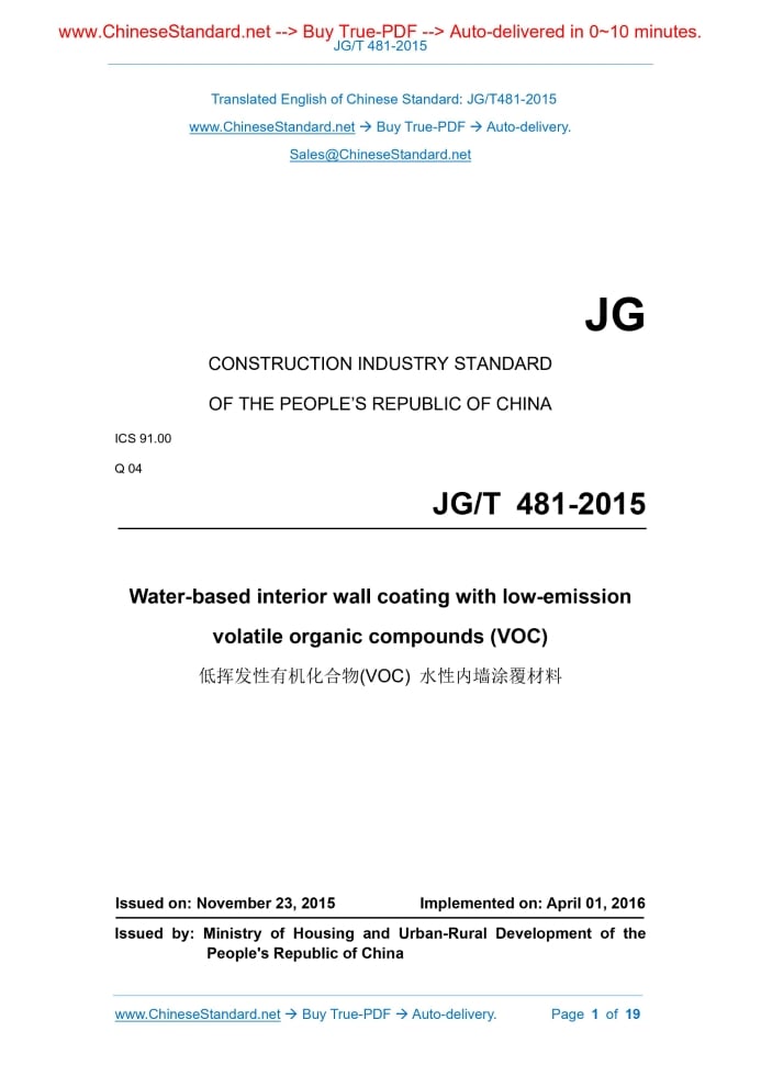 JG/T 481-2015: Water-based interior wall coating with low-emission volatile organic compounds (VOC) Delivery: 9 seconds. True-PDF full-copy in English & invoice will be downloaded + auto-delivered via email. See step-by-step procedure Status: Valid