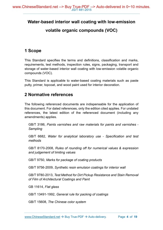 Similar standardsJG/T 481-2015: Water-based interior wall coating with low-emission volatile organic compounds (VOC)---This is an excerpt. Full copy of true-PDF in English version (including equations, symbols, images, flow-chart, tables, and figures etc.), auto-downloaded/delivered in 9 seconds, can be purchased online: https://www.ChineseStandard.net/PDF.aspx/JGT481-2015 CONSTRUCTION INDUSTRY STANDARD ICS 91.00 Q 04 Water-based interior wall coating with low-emission volatile organic compounds (VOC) Issued on. NOVEMBER 23, 2015 Implemented on. APRIL 01, 2016 Issued by. Ministry of Housing and Urban-Rural Development of the People's Republic of China Table of ContentsForeword... 3 1 Scope... 4 2 Normative references... 4 3 Terms and definitions... 5 4 Classification and marks... 5 5 General requirements... 6 6 Limits of hazardous substances and requirements for physical properties... 6 7 Test methods... 8 8 Inspection rules... 10 9 Signs, packaging, transport and storage... 11 Annex A (informative) Substances that shall not be contained in the product 12 Annex B (normative) Test of total volatile organic compounds (TVOC) emission level... 13ForewordThis Standard was drafted in accordance with the rules given in GB/T 1.1-2009. This Standard was proposed by Institute of Standard Quotas, Ministry of Housing and Urban-Rural Development. This Standard shall be under the jurisdiction of Technical Committee for Standardization of Building Products and Components of the Ministry of Housing and Urban-Rural Development. Main drafting organizations of this Standard. Shanghai Building Research Institute (Group) Co., Ltd. The drafting organizations of this Standard. Shanghai Jianke Inspection Co., Ltd., Dow Chemical (China) Investment Co., Ltd., Xiamen Engineering Testing Center Co., Ltd., Nippon Paint (China) Co., Ltd., Sichuan Academy of Building Materials Industry Science, Shanxi Jiayufeng Chemical Technology Co., Ltd., Celanese (China) Investment Co., Ltd., Eastman (Shanghai) Chemical Business Co., Ltd., Shanghai Yanyi Wall Material Technology Co., Ltd., AkzoNobel Swire Paints (Shanghai) Co., Ltd., Sichuan Jiabaoli Coating Co., Ltd., National Chemical Building Materials Testing Center, Wacker Chemical (China) Co., Ltd., Shanghai Bao Li Jia Chemical Co., Ltd., BASF (China) Co., Ltd., Shunde District of Foshan City, Bud Fu Industrial Co., Ltd., Shanghai Qiaomao Building Waterproof Material Co., Ltd., Tsinghua University, Xuanwei (Shanghai) Coating Co., Ltd., Crocodile Paint (Shanghai) Co., Ltd., Shanghai Jiabaoli Coating Co., Ltd. Main drafters of this Standard. Hu Xiaozhen, Ren Binbin, Qiu Cong, Zhao Min, Huang Xinhui, Jing Weijie, Xu Yanhua, Tang Lei, Lyu Ping, Qiu Xinghua, Shi Yifang, Li Jingguang, Zhang Yinping, Zeng Changying, Wang Zhenhua, Yang Weijiang, Wang Yan, Zhu Liguang. Water-based interior wall coating with low-emission volatile organic compounds (VOC)1 ScopeThis Standard specifies the terms and definitions, classification and marks, requirements, test methods, inspection rules, signs, packaging, transport and storage of water-based interior wall coating with low-emission volatile organic compounds (VOC). This Standard is applicable to water-based coating materials such as paste putty, primer, topcoat, and wood paint used for interior decoration.2 Normative referencesThe following referenced documents are indispensable for the application of this document. For dated references, only the edition cited applies. For undated references, the latest edition of the referenced document (including any amendments) applies. GB/T 3186, Paints varnishes and raw materials for paints and varnishes - Sampling GB/T 6682, Water for analytical laboratory use - Specification and test methods GB/T 8170-2008, Rules of rounding off for numerical values & expression and judgement of limiting values GB/T 9750, Marks for package of coating products GB/T 9756-2009, Synthetic resin emulsion coatings for interior wall GB/T 9780-2013, Test Method for Dirt Pickup Resistance and Stain Removal of Film of Architectural Coatings and Paint GB 11614, Flat glass GB/T 13491-1992, General rule for packing of coatings GB/T 15608, The Chinese color system GB/T 18204.2-2014, Examination methods for public places - Part 2. Chemical pollutants3 Terms and definitionsFor the purposes of this document, the following terms and definitions apply. 3.1 water-based interior wall coating with low-emission volatile organic compounds (VOC) The interior wall coating material that has low volatile organic compound (VOC) content and low total volatile organic compound (TVOC) emission level under conditions that meet basic physical properties.4 Classification and marks4.1 Classification The water-based interior wall coating with low-emission volatile organic compounds (VOC) is classified according to the following rules.5 General requirementsThe product shall not contain harmful substances. See Annex A.6 Limits of hazardous substances and requirements forphysical properties 6.1 Limits of hazardous substances The limits of hazardous substances in the product shall meet the requirements of Table 1. 6.3.3 The physical properties of interior wall paint shall meet the requirements of Table 5. 6.3.4 The physical properties of wood paint shall meet the requirements of Class C decoration paints in GB/T 23999-2009.7 Test methods7.1 General provisions 7.1.1 The products shall be sampled according to GB/T 3186.The sampling size shall be determined according to inspection needs. 7.1.2 Laboratory standard test conditions. temperature of 23°C±2°C, relative humidity of 50%±5%. 7.2 Hazardous substance limits The hazardous substance limits in paste putty, interior wall primer and interior wall paint shall be in accordance with GB 18582.The hazardous substance limits in wood paint shall be in accordance with GB 24410.Hexavalent chromium is carried out in accordance with Annex F in GB 24408-2009. 7.3 Hazardous substance emission level 7.3.1 Total volatile o