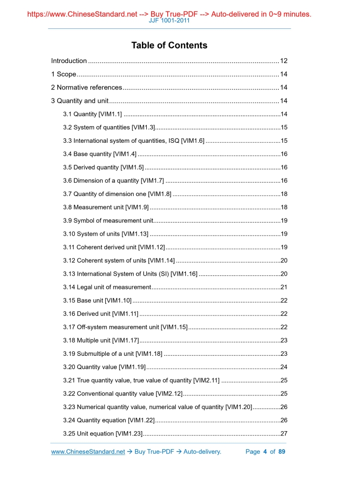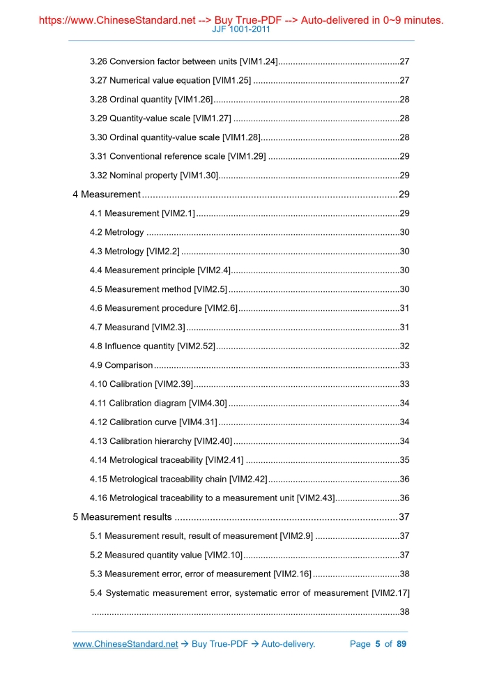Similar standardsJJF 1001-2011: General Terms in Metrology and Their Definitions---This is an excerpt. Full copy of true-PDF in English version (including equations, symbols, images, flow-chart, tables, and figures etc.), auto-downloaded/delivered in 9 seconds, can be purchased online: https://www.ChineseStandard.net/PDF.aspx/JJF1001-2011JJF METEROLOGICAL TECHNICAL SPECIFICATION General terms in metrology and their definitions Issued on. NOVEMBER 30, 2011 Implemented on. MARCH 01, 2012 Issued by. General Administration of Quality Supervision, Inspection and Quarantine of PRC General terms in metrology and their definitions Under the jurisdiction of. National Technical Committee for Legal Metrology Management Drafting organization. Department of Metrology, General Administration of Quality Supervision, Inspection and Quarantine For this specification, the National Legal Metrology Management Metrology Technical Committee is entrusted to be responsible for the interpretation. Replacing JJF 1001-1998 Main drafters of this specification. Ye Depei Shi Changyan Jin Huazhang Dai Runsheng Xuan Xiang Chen Hong (Department of Metrology, General Administration of Quality Supervision, Inspection and Quarantine) Participated drafters. Han Jianping (International Cooperation Department, General Administration of Quality Supervision, Inspection and Quarantine) Luo Xinyuan (China Metrology Association) Table of ContentsIntroduction... 12 1 Scope... 14 2 Normative references... 14 3 Quantity and unit... 14 4 Measurement... 29 5 Measurement results... 37 6 Measuring instruments... 50 7 Property of measuring instruments... 55 8 Measurement standards... 64 9 Legal metrology and metrological management... 73 Index in English... 841 ScopeThis specification specifies the commonly used terms and their definitions in metrology. This specification applies to all tasks in the field of metrology. The related fields can also refer to it.2 Normative referencesThis specification refers to the following documents. ISO/IEC 98-3 Uncertainty of measurement - Part 3.Guide to the expression of uncertainty in measurement ISO/IEC GUIDE 99.2007 International vocabulary of metrology -Basic and general concepts and associated terms (VIM)) ISO/IEC 80000.2006 Quantity and units For dated reference documents, only the dated version applies to this specification; for undated reference documents, the latest version (including all amendments) applies to this specification.3 Quantity and unit3.1 Quantity [VIM1.1] The property of a phenomenon, object or substance, the size of which can be represented by a number and a reference object. 3.6 Dimension of a quantity [VIM1.7] A compliance relationship between a given quantity and each base quantity in the system of quantities, which is expressed by the product of the power of the factor corresponding to the base quantity after removing all digital factors. 3.13 International System of Units (SI) [VIM1.16] The unit system based on the international system of quantities approved by the International Conference on Metrology (CGPM), including unit names and symbols, prefix names and symbols and their usage rules.4 Measurement4.1 Measurement [VIM2.1] The process of obtaining one or more values of a certain quantity by experiment. Note. 4.5 Measurement method [VIM2.5] A general description of the logical arrangement of operations used in the measurement process. 4.6 Measurement procedure [VIM2.6] According to one or more measurement principles and given measurement methods, a detailed description of the measurement based on the measurement model and the calculations needed to obtain the measurement results. 4.7 Measurand [VIM2.3] The quantity to be measured. 4.8 Influence quantity [VIM2.52] In direct measurement, the quantity which does not affect the actual measured, but will affect the relationship between the displayed value and the measurement result. 4.10 Calibration [VIM2.39] For a set of operations under specified conditions, the first step is to determine the relationship between the quantity value provided by the measurement standard and the corresponding display value; the second step is to use this information to determine the relationship between the measurement result obtained from the display value. Both the quantity value provided by the measurement standard and the corresponding indication have measurement uncertainty.5 Measurement results5.1 Measurement result, result of measurement [VIM2.9] A set of measured quantity values which, together with other useful relevant information, are assigned to the measured. Note. 5.2 Measured quantity value [VIM2.10] Also known as measured value of a quantity, referred to as measured value Quantity which represents the measurement result. 5.3 Measurement error, error of measurement [VIM2.16] 5.4 Systematic measurement error, systematic error of measurement [VIM2.17] 5.16 Measurement reproducibility [VIM2.25] Referred to as reproducibility Measurement precision under reproducible measurement conditions. 5.17 Experimental standard deviation Referred to as experimental standard deviation When performing n measurements on the same measured, the quantity which characterizes the dispersion of measurement results. It is represented by the symbol s.6 Measuring instruments6.1 Measuring instrument [VIM3.1] Measuring instrument 6.2 Measuring system [VIM3.2] A set of one or more measuring instruments that are assembled and suitable for a specific quantity to give measured value information within a specified interval, usually including other devices, such as reagents and power supplies. 6.3 Indicating measuring instrument [VIM3.3] A measuring instrument that provides an output signal with information about the measured quantity value. 6.11 Displayer The part of the measuring instrument that shows the value. 6.12 Recorder The measuring instrument's components for recording of indicated value. 6.13 Index The fixed or movable part of the display unit that can 