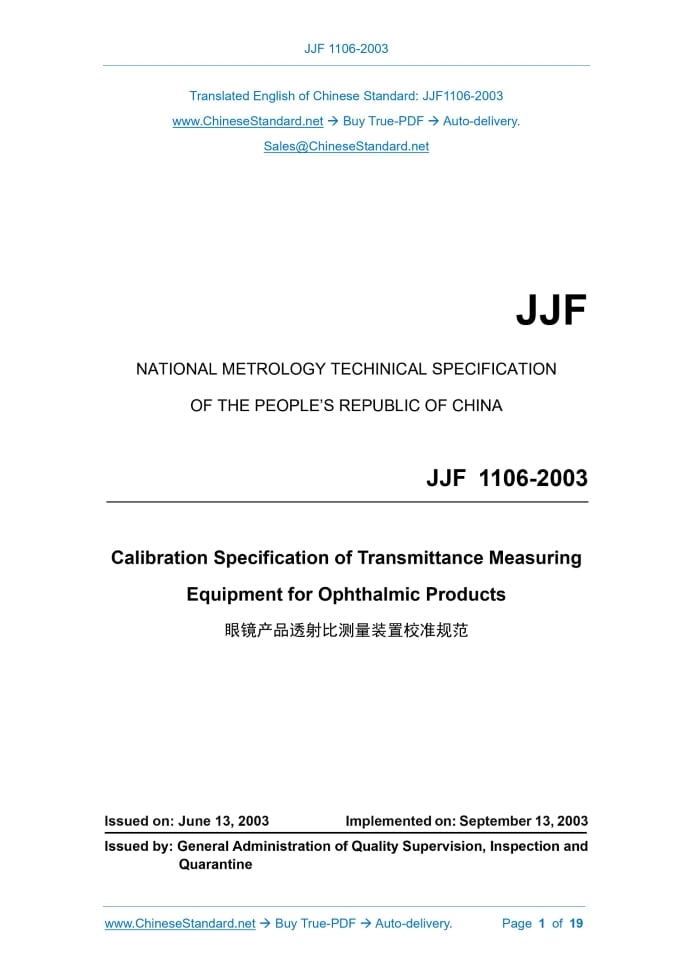 JJF 1106-2003: Calibration Specification of Transmittance Measuring Equipment for Ophthalmic Products Delivery: 9 seconds. True-PDF full-copy in English & invoice will be downloaded + auto-delivered via email. See step-by-step procedure Status: Valid