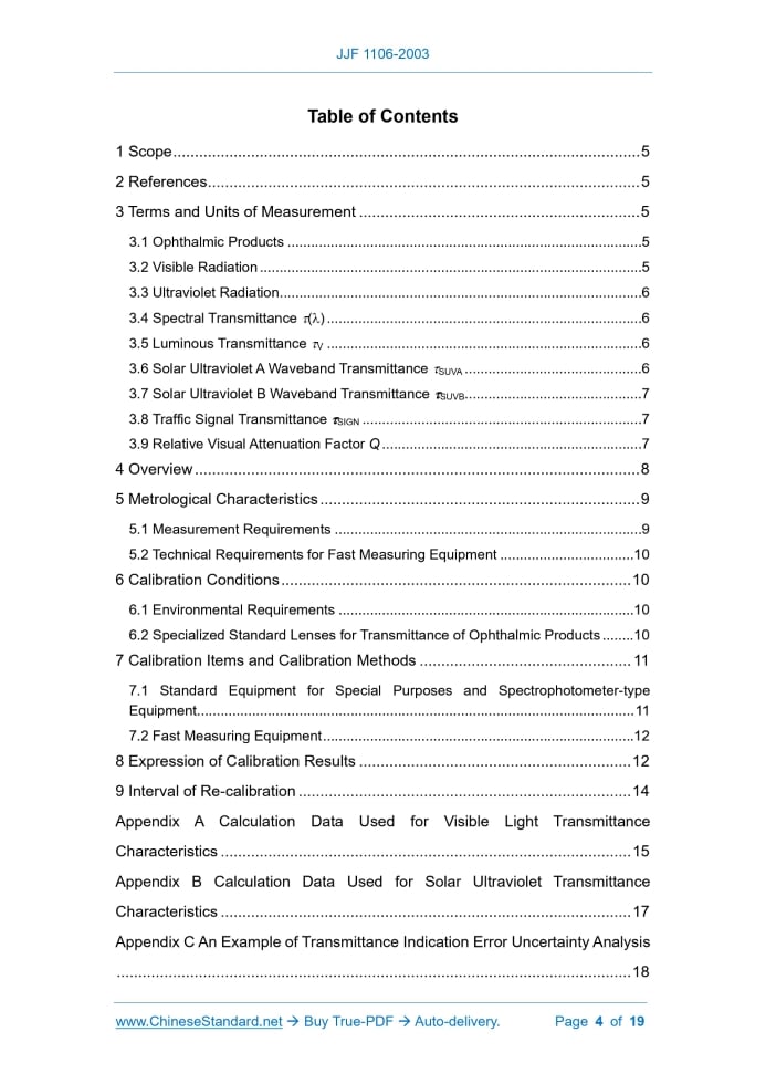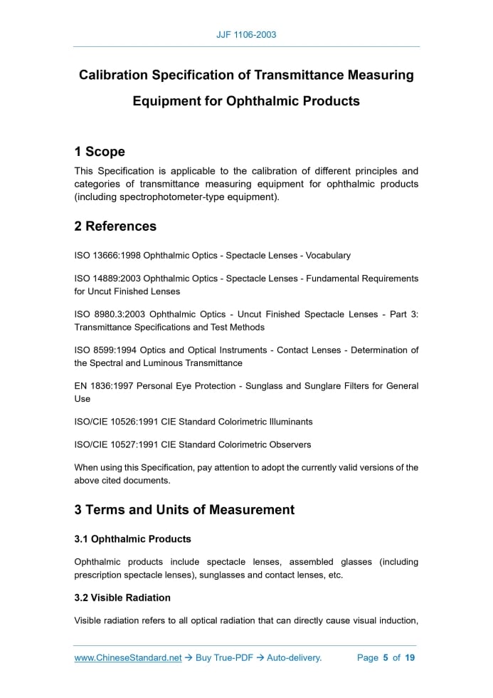 JJF 1106-2003: Calibration Specification of Transmittance Measuring Equipment for Ophthalmic Products---This is an excerpt. Full copy of true-PDF in English version (including equations, symbols, images, flow-chart, tables, and figures etc.), auto-downloaded/delivered in 9 seconds, can be purchased online: https://www.ChineseStandard.net/PDF.aspx/JJF1106-2003 JJF NATIONAL METROLOGY TECHINICAL SPECIFICATION OF THE PEOPLE’S REPUBLIC OF CHINA Calibration Specification of Transmittance Measuring Equipment for Ophthalmic Products ISSUED ON: JUNE 13, 2003 IMPLEMENTED ON: SEPTEMBER 13, 2003 Issued by: General Administration of Quality Supervision, Inspection and Quarantine Table of Contents1 Scope ... 5 2 References ... 5 3 Terms and Units of Measurement ... 5 3.1 Ophthalmic Products ... 5 3.2 Visible Radiation ... 5 3.3 Ultraviolet Radiation ... 6 3.4 Spectral Transmittance () ... 6 3.5 Luminous Transmittance V ... 6 3.6 Solar Ultraviolet A Waveband Transmittance SUVA ... 6 3.7 Solar Ultraviolet B Waveband Transmittance SUVB... 7 3.8 Traffic Signal Transmittance SIGN ... 7 3.9 Relative Visual Attenuation Factor Q ... 7 4 Overview ... 8 5 Metrological Characteristics ... 9 5.1 Measurement Requirements ... 9 5.2 Technical Requirements for Fast Measuring Equipment ... 10 6 Calibration Conditions ... 10 6.1 Environmental Requirements ... 10 6.2 Specialized Standard Lenses for Transmittance of Ophthalmic Products ... 10 7 Calibration Items and Calibration Methods ... 11 7.1 Standard Equipment for Special Purposes and Spectrophotometer-type Equipment ... 11 7.2 Fast Measuring Equipment ... 12 8 Expression of Calibration Results ... 12 9 Interval of Re-calibration ... 14 Appendix A Calculation Data Used for Visible Light Transmittance Characteristics ... 15 Appendix B Calculation Data Used for Solar Ultraviolet Transmittance Characteristics ... 17 Appendix C An Example of Transmittance Indication Error Uncertainty Analysis ... 18 Calibration Specification of Transmittance Measuring Equipment for Ophthalmic Products1 ScopeThis Specification is applicable to the calibration of different principles and categories of transmittance measuring equipment for ophthalmic products (including spectrophotometer-type equipment).2 ReferencesISO 13666:1998 Ophthalmic Optics - Spectacle Lenses - Vocabulary ISO 14889:2003 Ophthalmic Optics - Spectacle Lenses - Fundamental Requirements for Uncut Finished Lenses ISO 8980.3:2003 Ophthalmic Optics - Uncut Finished Spectacle Lenses - Part 3: Transmittance Specifications and Test Methods ISO 8599:1994 Optics and Optical Instruments - Contact Lenses - Determination of the Spectral and Luminous Transmittance EN 1836:1997 Personal Eye Protection - Sunglass and Sunglare Filters for General Use ISO/CIE 10526:1991 CIE Standard Colorimetric Illuminants ISO/CIE 10527:1991 CIE Standard Colorimetric Observers When using this Specification, pay attention to adopt the currently valid versions of the above cited documents.3 Terms and Units of Measurement3.1 Ophthalmic Products Ophthalmic products include spectacle lenses, assembled glasses (including prescription spectacle lenses), sunglasses and contact lenses, etc. 3.2 Visible Radiation Visible radiation refers to all optical radiation that can directly cause visual induction, Type 3 (hereinafter referred to as fast measuring equipment) uses specific light sources and filters to obtain a measurement beam in the ultraviolet waveband of (280 ~ 380) nm. After irradiating the sample being tested, it directly measure the energy level of the transmitted beam and can quickly determine whether the transmittance of the sample in this waveband is zero.5 Metrological Characteristics5.1 Measurement Requirements Measurement requirements are applicable to the standard equipment for special purposes and the spectrophotometer-type equipment. 5.1.1 Wavelength range At least shall include (280 ~ 780) nm, and shall be divided in accordance with the following wavebands: UV-B: (280 ~ 315) nm medium-wave ultraviolet; UV-A: (315 ~ 380) nm long-wave ultraviolet; V: (380 ~ 780) nm visible light, 5.1.2 Transmittance measurement repeatability The transmittance measurement repeatability of measuring equipment used to issue fair data (such as: product measurement and quality inspection) to the public shall be not greater than 1.5%. The transmittance measurement repeatability of measuring equipment used for commercial purposes shall be not greater than 2%. 5.1.3 Transmittance indication error The absolute value of the transmittance indication error of measuring equipment used to issue fair data (such as: product measurement and quality inspection) to the public shall be not greater than 2%. The absolute value of the transmittance indication error of measuring equipment used for commercial purposes shall be not greater than 3%. 5.1.4 Indication error of relative visual attenuation factor Q The absolute value of the indication error of relative visual attenuation factor Q of measuring equipment used to issue fair data (such as: product measurement and quality inspection) to the public shall be not greater than 0.02. lenses. Each of the two colorless lenses has three standard values of transmittance (V, SUVA and SUVB); each of the two colored lenses has four standard values of relative visual attenuation factor (QR, QY, QG and QB). 6.2.3 Standard lenses for fast measuring equipment Standard lenses for fast measuring equipment are only applicable to the calibration of the fast measuring equipment. Standard lenses for fast measuring equipment are composed of two colorless lenses whose diopter is (0 ± 2) m-1. The transmittance in the UV-B waveband is smaller than 1%; the transmittance in the UV-A waveband is respectively 4% and smaller than 1%.7 Calibration Items and Calibration Methods7.1 Standard Equipment for Special Purposes and Spectrophotometer- type Equipment 7.1.1 Wavelength range In accordance with the requirements of 5.1.1, operate the calibrated equipment 