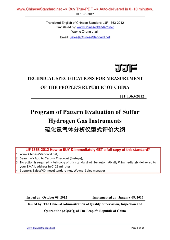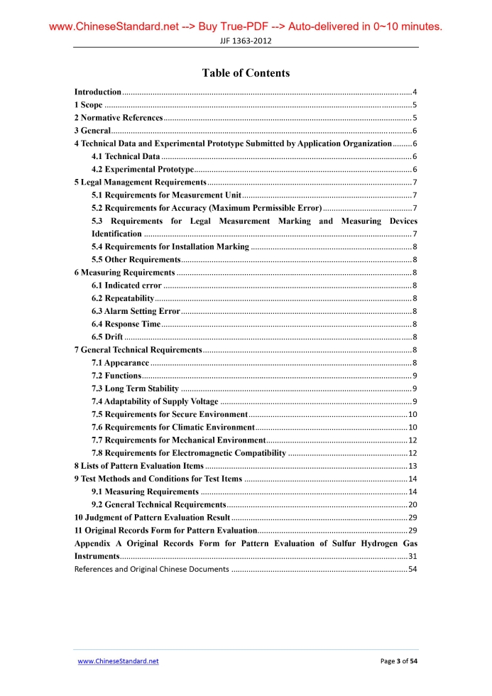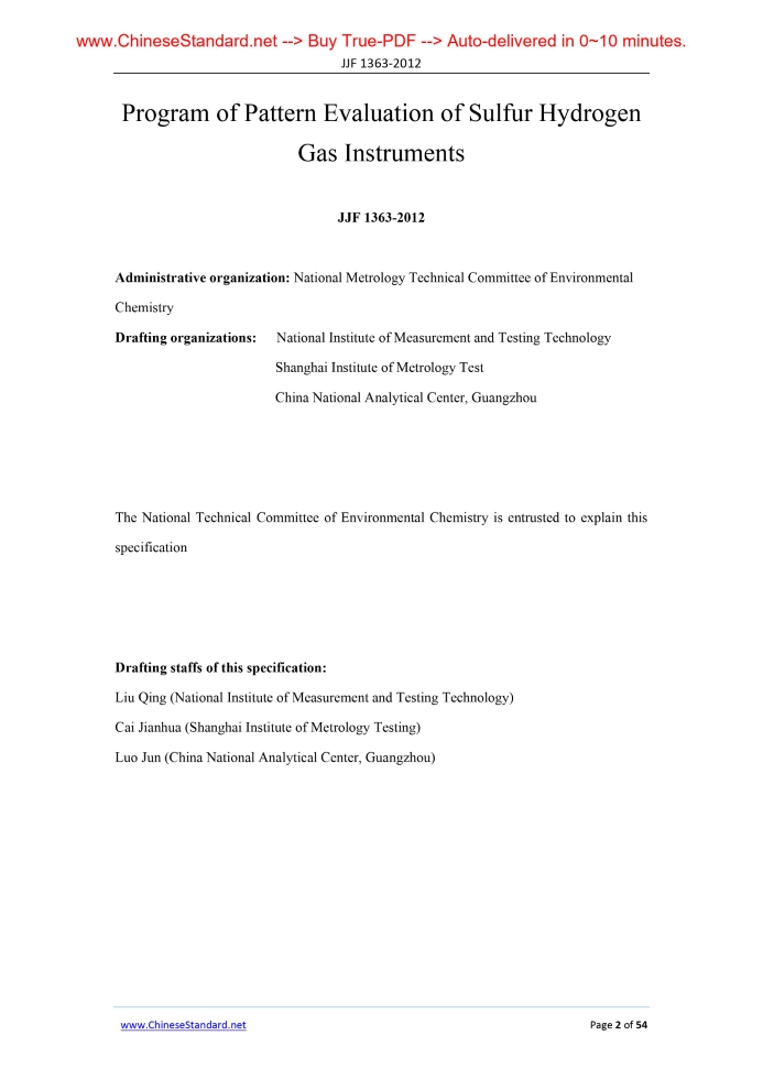 JJF 1363-2012: Program of Pattern Evaluation of Sulfur Hydrogen Gas Analyzers---This is an excerpt. Full copy of true-PDF in English version (including equations, symbols, images, flow-chart, tables, and figures etc.), auto-downloaded/delivered in 9 seconds, can be purchased online: https://www.ChineseStandard.net/PDF.aspx/JJF1363-2012TECHNICAL SPECIFICATIONS FOR MEASUREMENT OF THE PEOPLE'S REPUBLIC OF CHINA Program of Pattern Evaluation of Sulfur Hydrogen Gas Instruments Issued on: OCTOBER 08, 2012 Implemented on: JANUARY 08, 2013 Issued by. The General Administration of Quality Supervision, Inspection and Quarantine (AQSIQ) of The People's Republic of China Program of Pattern Evaluation of Sulfur Hydrogen Gas Instruments Administrative organization. National Metrology Technical Committee of Environmental Chemistry Drafting organizations. National Institute of Measurement and Testing Technology Shanghai Institute of Metrology Test China National Analytical Center, Guangzhou The National Technical Committee of Environmental Chemistry is entrusted to explain this specification Drafting staffs of this specification. Liu Qing (National Institute of Measurement and Testing Technology) Cai Jianhua (Shanghai Institute of Metrology Testing) Luo Jun (China National Analytical Center, Guangzhou) Table of ContentsIntroduction... 4 1 Scope... 5 2 Normative References... 5 3 General... 6 4 Technical Data and Experimental Prototype Submitted by Application Organization... 6 4.1 Technical Data... 6 4.2 Experimental Prototype... 6 5 Legal Management Requirements... 7 5.1 Requirements for Measurement Unit... 7 5.2 Requirements for Accuracy (Maximum Permissible Error)... 7 5.3 Requirements for Legal Measurement Marking and Measuring Devices Identification... 7 5.4 Requirements for Installation Marking... 8 5.5 Other Requirements... 8 6 Measuring Requirements... 8 6.1 Indicated error... 8 6.2 Repeatability... 8 6.3 Alarm Setting Error... 8 6.4 Response Time... 8 6.5 Drift... 8 7 General Technical Requirements... 8 7.1 Appearance... 8 7.2 Functions... 9 7.3 Long Term Stability... 9 7.4 Adaptability of Supply Voltage... 9 7.5 Requirements for Secure Environment... 10 7.6 Requirements for Climatic Environment... 10 7.7 Requirements for Mechanical Environment... 12 7.8 Requirements for Electromagnetic Compatibility... 12 8 Lists of Pattern Evaluation Items... 13 9 Test Methods and Conditions for Test Items... 14 9.1 Measuring Requirements... 14 9.2 General Technical Requirements... 20 10 Judgment of Pattern Evaluation Result... 29 11 Original Records Form for Pattern Evaluation... 29 Appendix A Original Records Form for Pattern Evaluation of Sulfur Hydrogen Gas Instruments... 31 References and Original Chinese Documents... 54IntroductionThis program of pattern evaluation is prepared according to JJF 1016 "The Rules for Drafting Program of Pattern Evaluation of Measuring Instruments", JJF 1015 "General Norm for Pattern Evaluation and Pattern Approval of Measuring Instruments" and JJF 1001 "General Terms in Metrology and Their Definitions". Technical regulations such as JJG 695-2003 "Verification Regulation of Sulfur Hydrogen Gas Detectors", GB 12358-2006 "Gas Monitors and Alarms for Workplace-General Technical Requirements" and GB/T 11606-2007 "Methods of Environmental Test for Analytical Instruments" are referenced by the technical index of this program of pattern evaluation. This program of pattern evaluation is issued for the first time. TECHNICAL SPECIFICATIONS FOR MEASUREMENT OF THE PEOPLE'S REPUBLIC OF CHINA Program of Pattern Evaluation of Sulfur Hydrogen Gas Instruments1 ScopeThis program of pattern evaluation is applicable to the pattern evaluation of sulfur hydrogen gas instruments (which consists of sulfur hydrogen gas detection alarm instrument and sulfur hydrogen gas detector, hereinafter referred to as "instrument").2 Normative ReferencesJJG 695-2003 “Verification Regulation of Sulfur Hydrogen Gas Detectors" GB/T 11606-2007 “Methods of Environmental Test for Analytical Instruments" GB 12358-2006 “Gas Monitors and Alarms for Workplace-General Technical Requirements" GB/T 17626.2-2006 “Electromagnetic Compatibility - Testing and Measurement Techniques-Electrostatic Discharge Immunity Test" GB/T 17626.3-2006 “Electromagnetic Compatibility - Testing and Measurement Techniques-Radiated Radio-frequency Electromagnetic Field Immunity Test" GB/T 17626.4-2008 “Electromagnetic Compatibility - Testing and Measurement Techniques-Electrical Fast Transient/Burst Immunity Test" The provisions of above normative documents, through reference in this program, constitute provisions of this program. For dated references, subsequent amendments to (excluding any correction) or revisions are not applicable to this program. However, parties who mutually agree to this program are encouraged to investigate the possibility of applying the most recent editions of the normative documents indicated below. For undated references, the latest edition of the respective normative document is applicable to this program.3 GeneralTesting principle of instrument mainly consists of electrochemical profile and optical profile. The instrument mainly consists of transducer, amplifying circuit and display unit. It may be classified into non-continuous measuring instrument and continuous measuring instrument according to operating conditions; classified into diffusion type and inhalation type according to sampling type; or classified into portable type and fixed type according to the usage mode.4 Technical Data and Experimental Prototype Submitted byApplication Organization 4.1 Technical Data a) Prototype photo; b) Product standard (including inspection method); c) General assembly drawing, circuit diagram and drawing of key parts; d) Instruction for use; e) Test report by manufacturer or technical organization; f) Explosion proof certificate shall be provided where the products are indicated with function of explosion proof. 4.