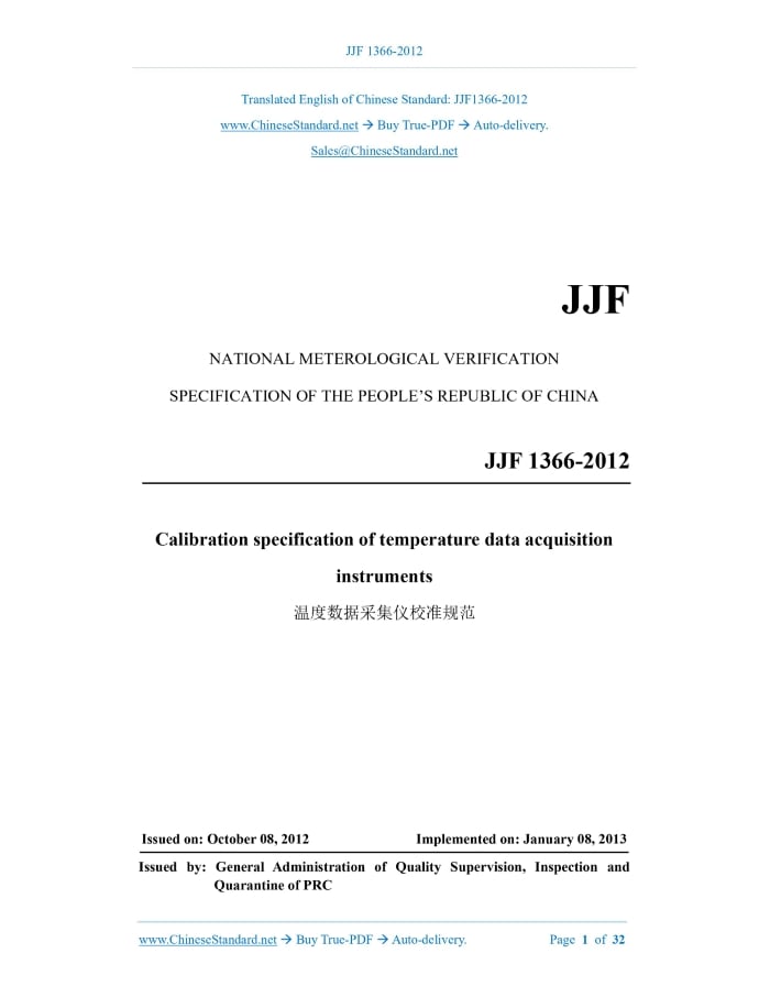 JJF 1366-2012: Calibration Specification of Temperature Data Acquisition Instruments Delivery: 9 seconds. True-PDF full-copy in English & invoice will be downloaded + auto-delivered via email. See step-by-step procedure Status: Valid JJF 1366: Historical versions
