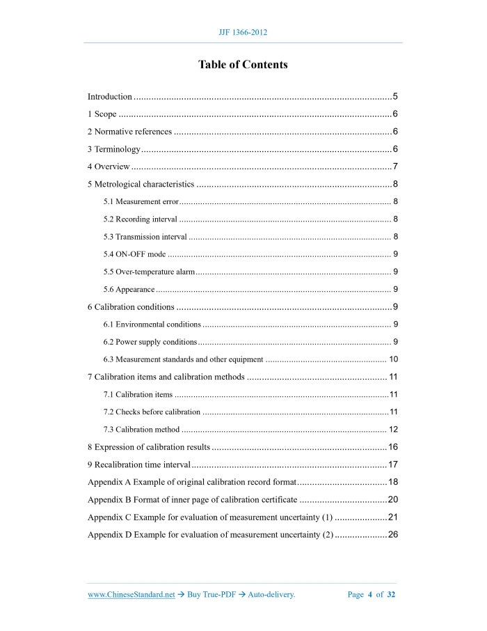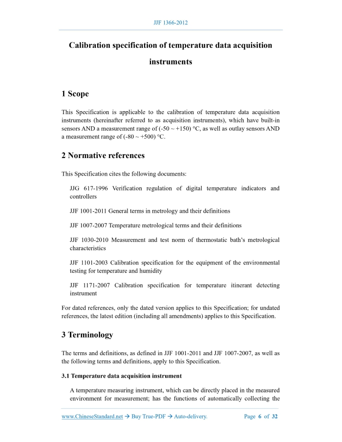 JJF 1366-2012: Calibration Specification of Temperature Data Acquisition Instruments---This is an excerpt. Full copy of true-PDF in English version (including equations, symbols, images, flow-chart, tables, and figures etc.), auto-downloaded/delivered in 9 seconds, can be purchased online: https://www.ChineseStandard.net/PDF.aspx/JJF1366-2012JJF NATIONAL METEROLOGICAL VERIFICATION SPECIFICATION OF THE PEOPLE’S REPUBLIC OF CHINA Calibration specification of temperature data acquisition instruments ISSUED ON: OCTOBER 08, 2012 IMPLEMENTED ON: JANUARY 08, 2013 Issued by: General Administration of Quality Supervision, Inspection and Quarantine of PRC Table of ContentsIntroduction ... 5 1 Scope ... 6 2 Normative references ... 6 3 Terminology ... 6 4 Overview ... 7 5 Metrological characteristics ... 8 5.1 Measurement error ... 8 5.2 Recording interval ... 8 5.3 Transmission interval ... 8 5.4 ON-OFF mode ... 9 5.5 Over-temperature alarm ... 9 5.6 Appearance ... 9 6 Calibration conditions ... 9 6.1 Environmental conditions ... 9 6.2 Power supply conditions ... 9 6.3 Measurement standards and other equipment ... 10 7 Calibration items and calibration methods ... 11 7.1 Calibration items ... 11 7.2 Checks before calibration ... 11 7.3 Calibration method ... 12 8 Expression of calibration results ... 16 9 Recalibration time interval ... 17 Appendix A Example of original calibration record format ... 18 Appendix B Format of inner page of calibration certificate ... 20 Appendix C Example for evaluation of measurement uncertainty (1) ... 21 Appendix D Example for evaluation of measurement uncertainty (2) ... 26 Calibration specification of temperature data acquisition instruments1 ScopeThis Specification is applicable to the calibration of temperature data acquisition instruments (hereinafter referred to as acquisition instruments), which have built-in sensors AND a measurement range of (-50 ~ +150) °C, as well as outlay sensors AND a measurement range of (-80 ~ +500) °C.2 Normative referencesThis Specification cites the following documents: JJG 617-1996 Verification regulation of digital temperature indicators and controllers JJF 1001-2011 General terms in metrology and their definitions JJF 1007-2007 Temperature metrological terms and their definitions JJF 1030-2010 Measurement and test norm of thermostatic bath’s metrological characteristics JJF 1101-2003 Calibration specification for the equipment of the environmental testing for temperature and humidity JJF 1171-2007 Calibration specification for temperature itinerant detecting instrument For dated references, only the dated version applies to this Specification; for undated references, the latest edition (including all amendments) applies to this Specification.3 TerminologyThe terms and definitions, as defined in JJF 1001-2011 and JJF 1007-2007, as well as the following terms and definitions, apply to this Specification. 3.1 Temperature data acquisition instrument A temperature measuring instrument, which can be directly placed in the measured environment for measurement; has the functions of automatically collecting the 5.4 ON-OFF mode The acquisition instrument shall be able to set how it turns on and off. The turn-on mode is fixed OR optional, such as immediate turn-on, time-fixed turn-on, time-delayed turn- on, manual start, etc. The turn-off mode is fixed OR optional, such as turn-off are full storage, first-in first-out, turn-off by numbers, manual turn-off, etc. 5.5 Over-temperature alarm For an acquisition instrument, which has an over-temperature alarm function, the over- temperature alarm shall be normal. 5.6 Appearance 5.6.1 For the acquisition instrument with local indication, its digital indication shall be clear; there shall be no digital flickering, overlapping characters, garbled characters, missing strokes; the indication of decimal point shall be correct. 5.6.2 The acquisition instrument, which can be used by putting into liquid, shall be sealed without damage. Note: All the above technical indicators are not applicable to eligibility judgment, only for reference.6 Calibration conditions6.1 Environmental conditions a) Ambient temperature: (20 ± 5) °C; b) Relative humidity: Not more than 85%; c) When the electrical measuring instrument has other requirements for environmental conditions, it shall meet its specified requirements. Note: If the above conditions cannot be met, the resulting uncertainty shall be considered. 6.2 Power supply conditions The power supply shall meet the normal working requirements of the acquisition instrument, measurement standard, constant temperature equipment under verification. sensitive element immersed in the uniform temperature zone of the constant temperature bath, meanwhile the influence of the ambient temperature is negligible, it shall follow the requirements in 6.6.5 of JJF 1171-2007, to place the temperature sensor in the constant temperature bath; the data acquisition part is placed outside the constant temperature bath; b) If the temperature sensor of the acquisition instrument is outlay type AND the length of the sensor cable or the insertion rod is not enough to make the temperature sensitive element immersed in the uniform temperature zone of the constant temperature bath; OR although it can be submerged enough, the ambient temperature cannot be ignored, due to the excellent thermal conductivity of the immersion rod; OR when the temperature sensor is built-in and the data acquisition part is not sealed, THEN, it shall be placed in the uniform temperature area of the incubator, as a whole; Note: In this case, the calibration temperature range of the outlay sensor acquisition instrument is the same as that of the built-in sensor acquisition instrument. c) For an integrally sealed acquisition instrument, the whole can be put into a metal mesh bag AND immersed in a uniform temperature zone below 200 mm, from the liquid medium level of the thermostat; OR the whole can be placed in 