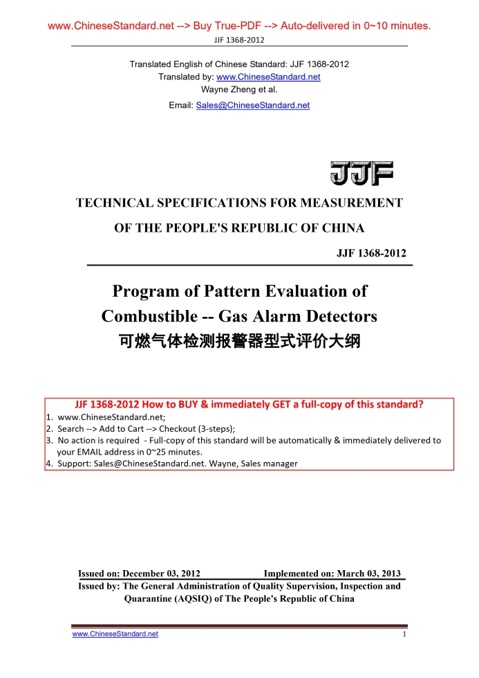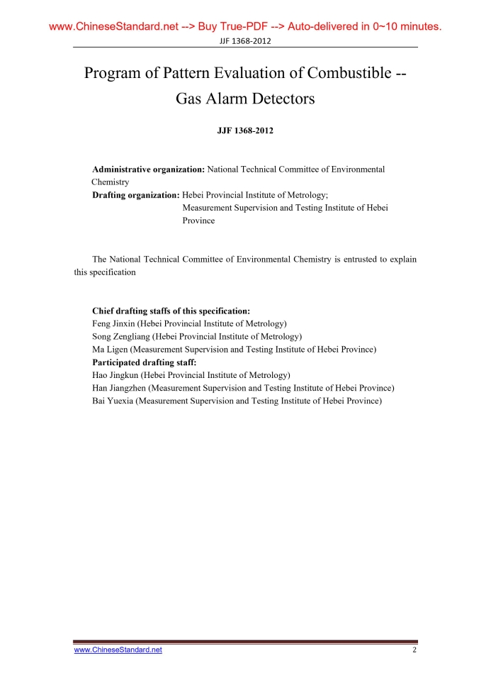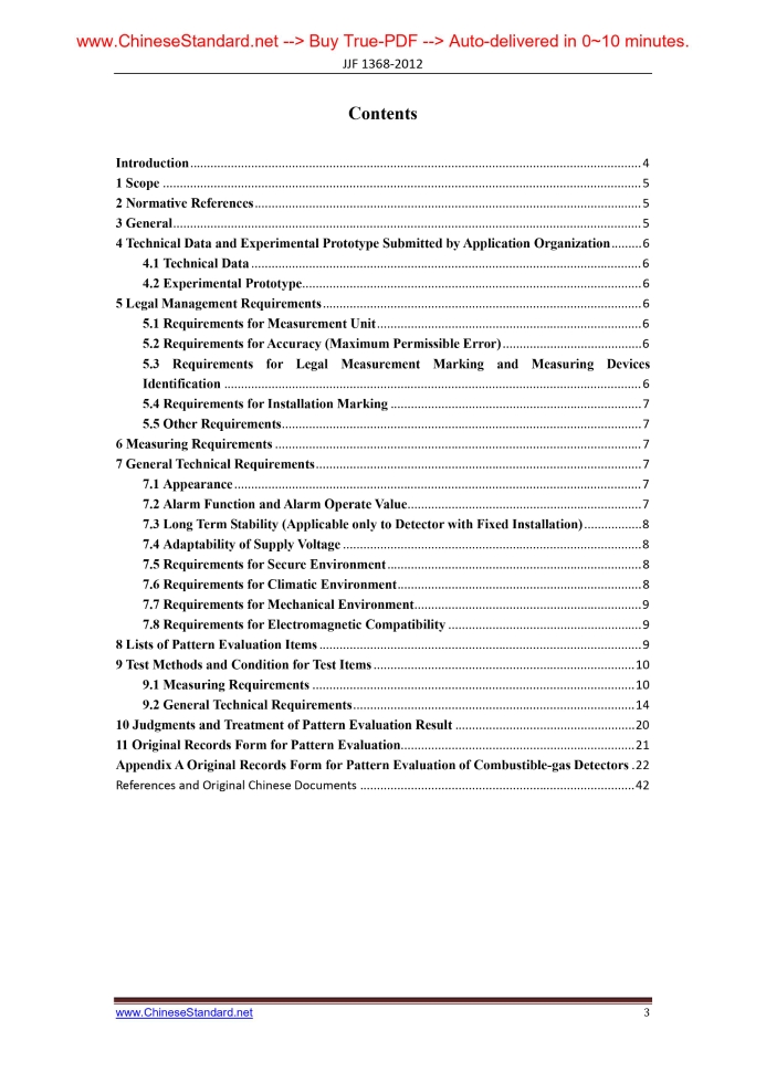 Similar standardsJJF 1368-2012: Program of Pattern Evaluation of Combustible - Gas Alarm Detectors---This is an excerpt. Full copy of true-PDF in English version (including equations, symbols, images, flow-chart, tables, and figures etc.), auto-downloaded/delivered in 9 seconds, can be purchased online: https://www.ChineseStandard.net/PDF.aspx/JJF1368-2012TECHNICAL SPECIFICATIONS FOR MEASUREMENT OF THE PEOPLE'S REPUBLIC OF CHINA Program of Pattern Evaluation of Combustible -- Gas Alarm Detectors Issued on. DECEMBER 03, 2012 Implemented on. MARCH 03, 2013 Issued by. The General Administration of Quality Supervision, Inspection and Quarantine (AQSIQ) of The People's Republic of China Program of Pattern Evaluation of Combustible -- Gas Alarm Detectors Administrative organization. National Technical Committee of Environmental Chemistry Drafting organization. Hebei Provincial Institute of Metrology; Measurement Supervision and Testing Institute of Hebei Province The National Technical Committee of Environmental Chemistry is entrusted to explain this specification Chief drafting staffs of this specification. Feng Jinxin (Hebei Provincial Institute of Metrology) Song Zengliang (Hebei Provincial Institute of Metrology) Ma Ligen (Measurement Supervision and Testing Institute of Hebei Province) Participated drafting staff. Hao Jingkun (Hebei Provincial Institute of Metrology) Han Jiangzhen (Measurement Supervision and Testing Institute of Hebei Province) Bai Yuexia (Measurement Supervision and Testing Institute of Hebei Province) Table of ContentsIntroduction... 4 1 Scope... 5 2 Normative References... 5 3 General... 5 4 Technical Data and Experimental Prototype Submitted by Application Organization... 6 4.1 Technical Data... 6 4.2 Experimental Prototype... 6 5 Legal Management Requirements... 6 5.1 Requirements for Measurement Unit... 6 5.2 Requirements for Accuracy (Maximum Permissible Error)... 6 5.3 Requirements for Legal Measurement Marking and Measuring Devices Identification... 6 5.4 Requirements for Installation Marking... 7 5.5 Other Requirements... 7 6 Measuring Requirements... 7 7 General Technical Requirements... 7 7.1 Appearance... 7 7.2 Alarm Function and Alarm Operate Value... 7 7.3 Long Term Stability (Applicable only to Detector with Fixed Installation)... 8 7.4 Adaptability of Supply Voltage... 8 7.5 Requirements for Secure Environment... 8 7.6 Requirements for Climatic Environment... 8 7.7 Requirements for Mechanical Environment... 9 7.8 Requirements for Electromagnetic Compatibility... 9 8 Lists of Pattern Evaluation Items... 9 9 Test Methods and Condition for Test Items... 10 9.1 Measuring Requirements... 10 9.2 General Technical Requirements... 14 10 Judgments and Treatment of Pattern Evaluation Result... 20 11 Original Records Form for Pattern Evaluation... 21 Appendix A Original Records Form for Pattern Evaluation of Combustible-gas Detectors. 22 References and Original Chinese Documents... 42IntroductionThis program of pattern evaluation is prepared according to JJF 1015 "General Norm for Pattern Evaluation and Pattern Approval of Measuring Instruments", JJF 1016 "The Rules for Drafting Program of Pattern Evaluation of Measuring Instruments" and JJF 1001 "General Terms in Metrology and Their Definitions". Technical regulations such as JJG 693-2011 "Alarm Detectors of Combustible Gas", GB 12358-2006 "Gas Monitors and Alarms for Workplace General Technical Requirements", GB 15322-2003 "Combustible Gas Detector" and GB 16808-2008 "Combustible Gas Alarm Control Units" are referenced by technical index of this program of pattern evaluation. This program of pattern evaluation is issued for the first time. TECHNICAL SPECIFICATIONS FOR MEASUREMENT OF THE PEOPLE'S REPUBLIC OF CHINA Program of Pattern Evaluation of Combustible -- Gas Alarm Detectors1 ScopeThis program of pattern evaluation applies to the combustible-gas alarm detectors (including combustible gas detector, hereinafter referred to as "detector") used in non-shaft operating environment and civil place.2 Normative ReferencesJJG 693-2011 “Alarm Detectors of Combustible Gas" GB 12358-2006 “Gas Monitors and Alarms for Workplace-General Technical Requirements" GB 15322-2003 “Combustible Gas Detector" GB 16808-2008 “Combustible Gas Alarm Control Units" GB/T 17626.2-2006 “Electromagnetic Compatibility (EMC) -- Testing and Measurement Techniques -- Electrostatic Discharge Immunity Test" GB/T 17626.3-2006 “Electromagnetic Compatibility-Testing and Measurement Techniques-Radiated Radio-frequency Electromagnetic Field Immunity Test"3 GeneralThe detector is divided into catalytic combustion type, thermal conductivity type, semiconductor type and infrared absorption type - according to the test principle; divided into diffusion type and inhalation type - according to sampling type; divided into portable type and fixed type - according to usage mode. The detector mainly consists of detecting element, amplifying circuit, alarm system and displayer. It is used to monitor the concentration of combustible gas exist in the environment.4 Technical Data and Experimental Prototype Submitted byApplication Organization 4.1 Technical Data 4.2 Experimental Prototype The application organization shall provide the prototypes it produced and file an application for a single product or series products. In case of application for a single product, three prototypes shall be provided for non-fixed-type equipment; six prototypes, of which three prototypes shall be used for the long-term stability test, shall be provided for fixed-type equipment.5 Legal Management Requirements5.1 Requirements for Measurement Unit The detector shall adopt the legal measurement units. 5.2 Requirements for Accuracy (Maximum Permissible Error) The maximum permissible error of the detector shall comply with JJG 693-2011 "Alarm Detectors of Combustible Gas". 5.3 Requirements for Legal Measurement Marking and Measuring Devices Identification The legal measurement m