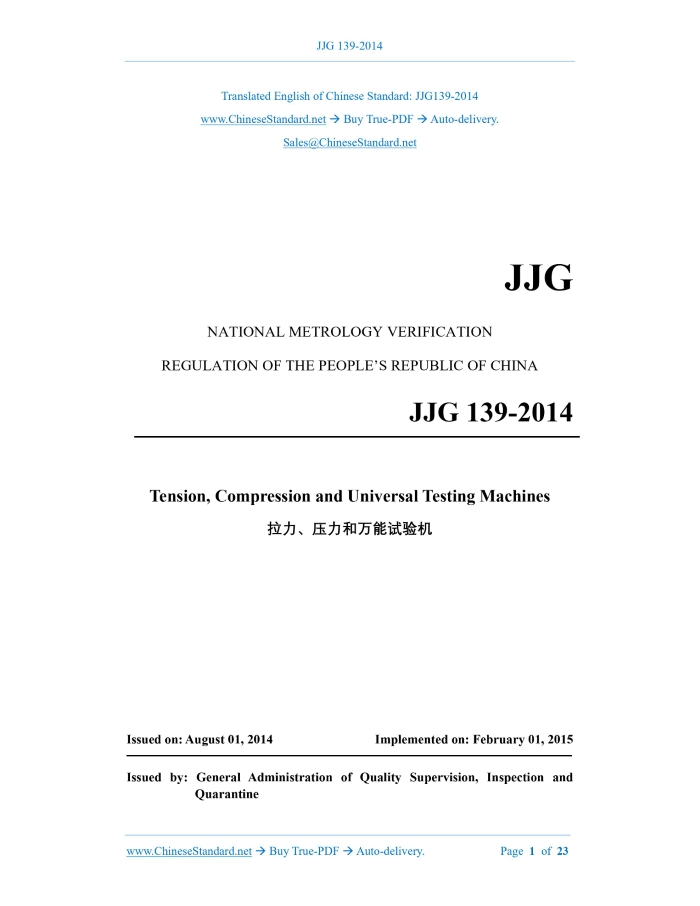 JJG 139-2014: Verification regulation of Tension, Compression and Universal Testing Machines Delivery: 9 seconds. True-PDF full-copy in English & invoice will be downloaded + auto-delivered via email. See step-by-step procedure Status: Valid JJG 139: Historical versions