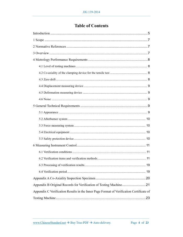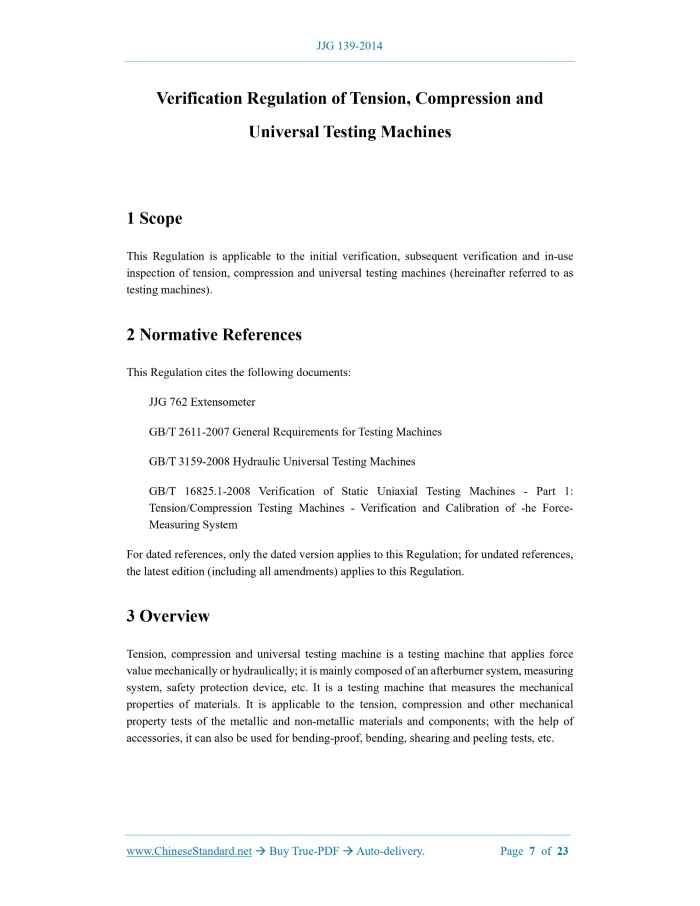 Similar standardsJJG 139-2014: Verification regulation of Tension, Compression and Universal Testing Machines---This is an excerpt. Full copy of true-PDF in English version (including equations, symbols, images, flow-chart, tables, and figures etc.), auto-downloaded/delivered in 9 seconds, can be purchased online: https://www.ChineseStandard.net/PDF.aspx/JJG139-2014JJG NATIONAL METROLOGY VERIFICATION REGULATION OF THE PEOPLE’S REPUBLIC OF CHINA Tension, Compression and Universal Testing Machines ISSUED ON: AUGUST 01, 2014 IMPLEMENTED ON: FEBRUARY 01, 2015 Issued by: General Administration of Quality Supervision, Inspection and Quarantine Table of ContentsIntroduction ... 5 1 Scope ... 7 2 Normative References ... 7 3 Overview ... 7 4 Metrology Performance Requirements ... 8 4.1 Level of testing machines ... 8 4.2 Co-axiality of the clamping device for the tensile test ... 8 4.3 Zero drift ... 8 4.4 Displacement measuring device ... 9 4.5 Deformation measuring device ... 9 4.6 Noise ... 9 5 General Technical Requirements ... 9 5.1 Appearance ... 9 5.2 Afterburner system ... 10 5.3 Force measuring system ... 10 5.4 Electrical equipment ... 10 5.5 Safety protection device ... 10 6 Measuring Instrument Control ... 11 6.1 Verification conditions ... 11 6.2 Verification items and verification methods ... 11 6.3 Processing of verification results ... 19 6.4 Verification period ... 19 Appendix A Co-Axiality Inspection Specimen ... 20 Appendix B Original Records for Verification of Testing Machine ... 21 Appendix C Verification Results in the Inner Page Format of Verification Certificate of Testing Machine ... 23 Verification Regulation of Tension, Compression and Universal Testing Machines1 ScopeThis Regulation is applicable to the initial verification, subsequent verification and in-use inspection of tension, compression and universal testing machines (hereinafter referred to as testing machines).2 Normative ReferencesThis Regulation cites the following documents: JJG 762 Extensometer GB/T 2611-2007 General Requirements for Testing Machines GB/T 3159-2008 Hydraulic Universal Testing Machines GB/T 16825.1-2008 Verification of Static Uniaxial Testing Machines - Part 1: Tension/Compression Testing Machines - Verification and Calibration of -he Force- Measuring System For dated references, only the dated version applies to this Regulation; for undated references, the latest edition (including all amendments) applies to this Regulation.3 OverviewTension, compression and universal testing machine is a testing machine that applies force value mechanically or hydraulically; it is mainly composed of an afterburner system, measuring system, safety protection device, etc. It is a testing machine that measures the mechanical properties of materials. It is applicable to the tension, compression and other mechanical property tests of the metallic and non-metallic materials and components; with the help of accessories, it can also be used for bending-proof, bending, shearing and peeling tests, etc. 5.2 Afterburner system 5.2.1 The rack of the testing machine shall have enough test space to facilitate the loading and unloading of specimens, specimen fixtures, standard force gauges and other auxiliary devices. 5.2.2 The test force applied and removed by the testing machine shall be stable, without shock and vibration. The friction force between the oil cylinder and piston of the hydraulic testing machine, under no-load conditions, when the working piston runs within the effective stroke, the change of the indication value of the test force shall be less than 1/2 of the absolute value of the allowable error of the lower measurement limit. 5.2.3 The holding time of the test force shall be no less than 30s. During this period, the variation range of the force indication shall not exceed 0.2% of the maximum force value of the testing machine. 5.3 Force measuring system 5.3.1 The resolution r of the analog indicating device shall be the ratio of the width of the pointer to the distance between the centers of two adjacent scale lines (scale interval). 5.3.2 Resolution of digital indicating device: start the testing machine; under zero load condition, if the change of the indication value is no more than one increment, the resolution r shall be considered as an increment; if the change of the indication value is greater than one increment, the resolution r is half of the range plus an increment. 5.3.3 The computer display or digital indicating device shall directly display the force value in the unit of force; and shall be able to display the zero point and maximum value of each indication range and the direction of the force (for example: "+" or "-"). 5.4 Electrical equipment The electrical equipment of the testing machine is safe and reliable, and there is no leakage phenomenon. The insulation resistance between the power cord and the chassis shall be greater than 1MΩ. 5.5 Safety protection device 5.5.1 When the applied test force exceeds 2% to 5% of the maximum test force of the testing machine, the safety device shall act immediately to stop the testing machine from adding force. 5.5.2 When the moving chuck of the testing machine runs to the limit position of its working range, the limit device shall act immediately to stop the movement. corresponding accuracy) for verification. During verification, firstly clamp the test specimen on the chuck and apply an initial force of about 1% of the maximum test force of the testing machine; adjust the zero point of the co-axiality tester; and then apply the test force to 4% of the maximum test force. Note that the maximum force used in the inspection shall not cause plastic deformation of the inspection specimen; and measure the elastic deformation of the opposite sides of the specimen, which shall be measured for three times each in the direction perpendicular to each other. The co-axiality is calculated according to Formula (1). The results of each verification shall m