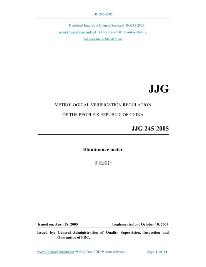 JJG 245-2005: Verification Regulation of Illuminance Meter Delivery: 9 seconds. True-PDF full-copy in English & invoice will be downloaded + auto-delivered via email. See step-by-step procedure Status: Valid JJG 245: Historical versions