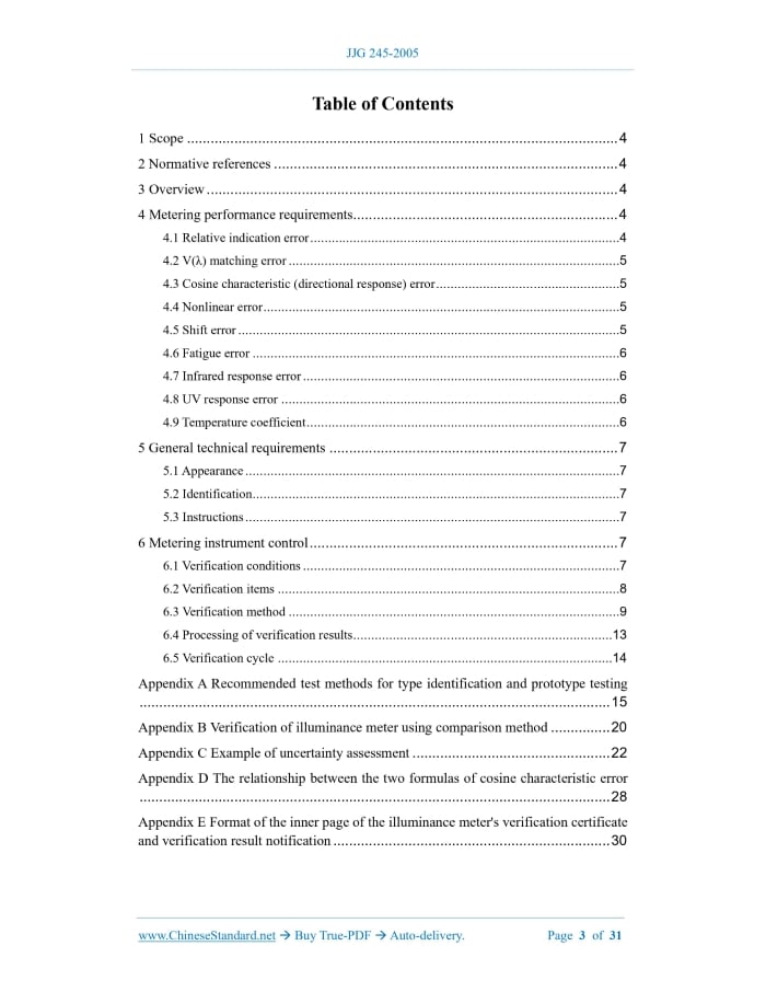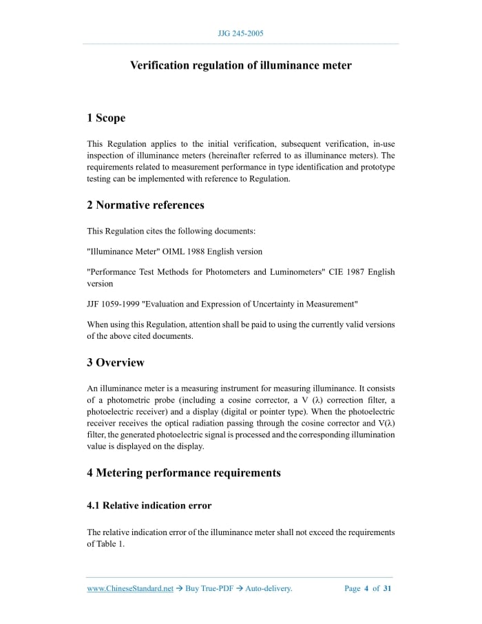 JJG 245-2005: Verification Regulation of Illuminance Meter---This is an excerpt. Full copy of true-PDF in English version (including equations, symbols, images, flow-chart, tables, and figures etc.), auto-downloaded/delivered in 9 seconds, can be purchased online: https://www.ChineseStandard.net/PDF.aspx/JJG245-2005JJG METROLOGICAL VERIFICATION REGULATION Illuminance meter Issued on. APRIL 28, 2005 Implemented on. OCTOBER 10, 2005 Issued by. General Administration of Quality Supervision, Inspection and Quarantine of PRC. Verification regulation of illuminance meter This Regulation was approved by the General Administration of Quality Supervision, Inspection and Quarantine of PRC on April 28, 2005.It was implemented from October 28, 2005. Under the jurisdiction of. National Optical Metrology Technical Committee Drafting organization. China Institute of Metrology National Optical Metrology Technical Committee is responsible for the interpretation of this Regulation. Drafters of this Regulation. Jiang Xiaomei (Chinese Institute of Metrology) Gao Zhizhong (China Institute of Metrology) Replacing JJG 245-1991 Table of Contents1 Scope... 4 2 Normative references... 4 3 Overview... 4 4 Metering performance requirements... 4 4.1 Relative indication error... 4 4.2 V(λ) matching error... 5 4.3 Cosine characteristic (directional response) error... 5 4.4 Nonlinear error... 5 4.5 Shift error... 5 4.6 Fatigue error... 6 4.7 Infrared response error... 6 4.8 UV response error... 6 4.9 Temperature coefficient... 6 5 General technical requirements... 7 5.1 Appearance... 7 5.2 Identification... 7 5.3 Instructions... 7 6 Metering instrument control... 7 6.1 Verification conditions... 7 6.2 Verification items... 8 6.3 Verification method... 9 6.4 Processing of verification results... 13 6.5 Verification cycle... 14 Appendix A Recommended test methods for type identification and prototype testing ... 15 Appendix B Verification of illuminance meter using comparison method... 20 Appendix C Example of uncertainty assessment... 22 Appendix D The relationship between the two formulas of cosine characteristic error ... 28 Appendix E Format of the inner page of the illuminance meter's verification certificate and verification result notification... 30 Verification regulation of illuminance meter1 ScopeThis Regulation applies to the initial verification, subsequent verification, in-use inspection of illuminance meters (hereinafter referred to as illuminance meters). The requirements related to measurement performance in type identification and prototype testing can be implemented with reference to Regulation.2 Normative referencesThis Regulation cites the following documents. "Illuminance Meter" OIML 1988 English version "Performance Test Methods for Photometers and Luminometers" CIE 1987 English version JJF 1059-1999 "Evaluation and Expression of Uncertainty in Measurement" When using this Regulation, attention shall be paid to using the currently valid versions of the above cited documents.3 OverviewAn illuminance meter is a measuring instrument for measuring illuminance. It consists of a photometric probe (including a cosine corrector, a V (λ) correction filter, a photoelectric receiver) and a display (digital or pointer type).4 Metering performance requirements4.1 Relative indication error The relative indication error of the illuminance meter shall not exceed the requirements of Table 1. 4.2 V(λ) matching error The V(λ) matching error of the illuminance meter shall not exceed the requirements of 4.3 Cosine characteristic (directional response) error The cosine characteristic (directional response) error of the illuminance meter shall not exceed the requirements of Table 3. 4.8 UV response error The UV response error of the illuminance meter shall not exceed the requirements in Table 8. 4.9 Temperature coefficient The temperature coefficient of the illuminance meter shall not exceed the requirements of Table 9.5 General technical requirements5.1 Appearance The connection lines of the illuminance meter shall be in good contact; the outer surface of the cosine corrector of the photometer probe shall be clean and undamaged, with no spots or other marks. The digital display of the digital illuminance meter shall be clear, with no broken strokes, etc. 5.2 Identification The instrument shall be identified as follows. Name, model, product number, manufacturer, relevant mandatory and descriptive marks.6 Metering instrument controlMetering instrument control includes. initial verification, subsequent verification, in- use inspection. 6.1 Verification conditions 6.1.1 Verification equipment 6.1.1.3 Luminous intensity standard lamp set The luminous intensity standard lamp used to calibrate the illuminance meter shall not be lower than the requirements in Table 11. 6.1.2 Environmental conditions The room where the photometry system is located shall be a dark room; the temperature shall be maintained at (20 ± 5) °C. If the electrical measurement system uses supporting equipment such as a potentiometer and standard batteries, the temperature of the room where it is located shall be maintained at (20 ± 2) °C, the humidity shall be less than 85%RH. 6.2 Verification items The verification items are as shown in Table 12. The recommended test items for type identification and prototype testing include all the contents in Chapter 4.Among them, please refer to Appendix A for the test methods of V (λ) matching error, fatigue error, infrared response error, ultraviolet response error, temperature coefficient. 6.3 Verification method 6.3.3.3 The photometric probe shall cause the response of the light projected onto it to comply with the cosine law. Calculate the error f2(ε, ϕ) caused by the direction of the projected light according to formula (3). 6.3.4 Nonlinear error 6.3.5 Shift error 6.3.5.1 On the photometric measuring device, install the standard lamp and the photometric probe of the illuminance meter in accordance with