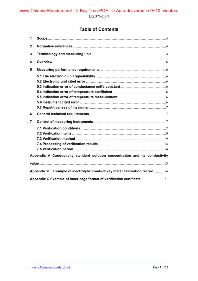 JJG 376-2007: Verification Regulation of Electrolytic Conductivity Meters---This is an excerpt. Full copy of true-PDF in English version (including equations, symbols, images, flow-chart, tables, and figures etc.), auto-downloaded/delivered in 9 seconds, can be purchased online: https://www.ChineseStandard.net/PDF.aspx/JJG376-2007JJG National Metrological Verification Procedures of the People's Republic of China Electrolytic Conductivity Meters Issued on. NOVEMBER 21, 2007 Implemented on. MAY 21, 2008 Issued by. State Administration of Quality Supervision, Inspection and Quarantine Verification Regulation of Electrolytic Conductivity Meters This regulation was approved by the State Administration of Quality Supervision, Inspection and Quarantine on November 21, 2007, and was put into effect on May 21, 2008. Administrative organization. National Physical and Chemical Metrology Technical Committee Drafting organization. China Institute of Metrology This regulation entrusts the National Physical and Chemical Metrology Technical Committee for interpretation Main drafter of this regulation. Xiaoping Song (China Institute of Metrology) Participating drafters. Kan Ying (China Institute of Metrology) Wang Hai (China Institute of Metrology) JJG 376-2007 Corrigendum Page 3 Row 8, Column 6 in Table 1.The value “±0.2” shall be “±2.0”. Page 4 Penultimate line 4.The value “0.25” shall be “0.25%”. Replacing JJG 376-1985 Table of Contents1 Scope... 4 2 Normative references... 4 3 Terminology and measuring unit... 4 4 Overview... 6 5 Measuring performance requirements... 6 5.1 The electronic unit repeatability... 6 5.2 Electronic unit cited error... 6 5.3 Indication error of conductance cell’s constant... 6 5.4 Indication error of temperature coefficient... 6 5.5 Indication error of temperature measurement... 6 5.6 Instrument cited error... 6 5.7 Repetitiveness of Instrument... 7 6 General technical requirements... 7 7 Control of measuring instruments... 7 7.1 Verification conditions... 7 7.2 Verification items... 9 7.3 Verification method... 9 7.4 Processing of verification results... 14 7.5 Verification period... 14 Appendix A Conductivity standard solution concentration and its conductivity value... 15 Appendix B Example of electrolytic conductivity meter calibration record... 16 Appendix C Example of inner page format of verification certificate... 21 Verification Regulation of Electrolytic Conductivity Meters1 ScopeThis regulation applies to the first-time verification, subsequent verification, and in-use inspection of electrolytic conductivity meters. Calibration of resistivity meter, salinity meter based on the electrical conductivity measurement principle, and TDS measurement instrument can reference to this regulation.2 Normative referencesOIML R68 Edition 1985 Calibration method for conductivity cell BS EN 60746-3.2002 Expression of performance of electrochemical analyzers - Part 3.3 Terminology and measuring unit3.1 Electrolytic conductance The ratio of current and electric potential difference when ionic charge of conductivity cell moves in the electrolyte solution. 3.3 Cell constant Conductance cell constant is calculated by the formula (3). 3.4 Temperature coefficient The relative change of the conductivity of the electrolyte solution that is caused by temperature change of 1 °C. For strong electrolyte whose electrical conductivity is greater than 1 x 10-4 S·m-1, the temperature coefficient α can be approximately expressed by Formula (5).4 OverviewConductivity meter is used to measure the electrolyte solution conductivity. The measuring principle of conductivity meter is based on the relationship [formula (4)] of conductivity, electric conductance, and conductance cell’s constant. Apply alternating electrical signals between electrodes of conductance cell to measure the solution conductivity; obtain the conductivity according to the imputed conductance cell’s constant.5 Measuring performance requirements5.1 The electronic unit repeatability Verification results shall comply with the provisions of Table 1. 5.2 Electronic unit cited error Verification results shall comply with the provisions of Table 1. 5.3 Indication error of conductance cell’s constant Verification results shall comply with the provisions of Table 1.6 General technical requirementsInstrument appearance shall be bright, clean and flat. Instrument function keys shall be able to work properly. All fasteners shall not be loose. The indication of instrument panel shall be clear and intact. Digital display instrument shall be clear and complete.7 Control of measuring instrumentsControl of measuring instruments includes first-time verification, subsequent verification and in-use inspection. 7.1 Verification conditions 7.1.1 Environmental conditions Verification results shall comply with the provisions of Table 2. 7.1.2 Solution conductance simulator It is the standard device for verifying electronic unit’s metrological performance. It is consisted of a set of non-inductive a.c. (alternate current) resistance. Setting of resistance value shall be able to meet the requirements of "verification method". 7.1.3 Conductivity standard solution The relative uncertainty of reference value of standard solution used in verification shall be less than or equal to 0.25 0.25% (k = 2). Potassium chloride solution conductivity standard material may be used. It may also use KCl conductivity solid standard material prepared according to the provisions of the appendix. 7.3.8 Instrument repeatability Repeatedly measure standard solution 1 or standard solution 2 for 6 times. Calculate the ratio of single-measurement standard deviation AND full-range according to Formula (6). It represents the repeatability of instrument measurement results. 7.4 Processing of verification results After verification, the instrument complying with this regulation is deemed as qualified instrument. A verification certificate shall be issued.