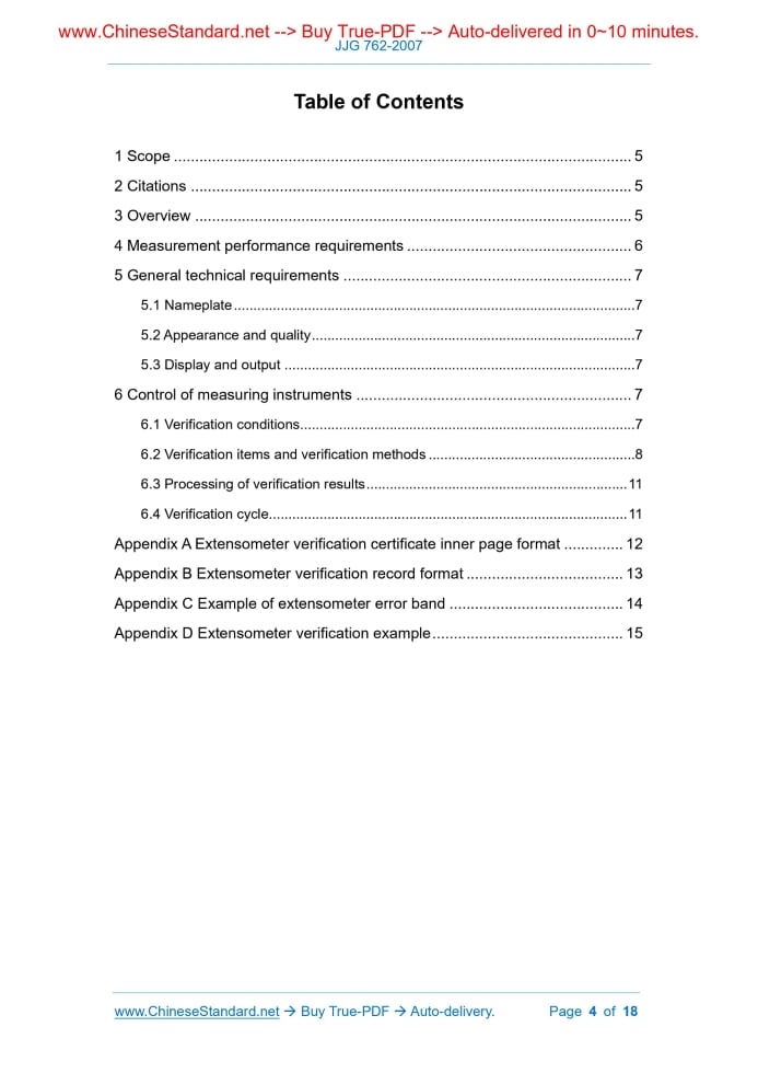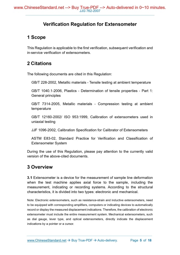 Similar standardsJJG 762-2007: Extensometer---This is an excerpt. Full copy of true-PDF in English version (including equations, symbols, images, flow-chart, tables, and figures etc.), auto-downloaded/delivered in 9 seconds, can be purchased online: https://www.ChineseStandard.net/PDF.aspx/JJG762-2007NATIONAL METROLOGICAL VERIFICATION REGULATION OF THE PEOPLE’S REPUBLIC OF CHINA Extensometer 引伸计 ISSUED ON: AUGUST 21, 2007 IMPLEMENTED ON: FEBRUARY 21, 2008 Issued by: General Administration of Quality Supervision, Inspection and Quarantine of the People's Republic of China Table of Contents1 Scope ... 5 2 Citations ... 5 3 Overview ... 5 4 Measurement performance requirements ... 6 5 General technical requirements ... 7 5.1 Nameplate ... 7 5.2 Appearance and quality ... 7 5.3 Display and output ... 7 6 Control of measuring instruments ... 7 6.1 Verification conditions ... 7 6.2 Verification items and verification methods ... 8 6.3 Processing of verification results ... 11 6.4 Verification cycle ... 11 Appendix A Extensometer verification certificate inner page format ... 12 Appendix B Extensometer verification record format ... 13 Appendix C Example of extensometer error band ... 14 Appendix D Extensometer verification example ... 15 Verification Regulation for Extensometer1 ScopeThis Regulation is applicable to the first verification, subsequent verification and in-service verification of extensometers. 2 Citations The following documents are cited in this Regulation: GB/T 228-2002, Metallic materials - Tensile testing at ambient temperature GB/T 1040.1-2006, Plastics - Determination of tensile properties - Part 1: General principles GB/T 7314-2005, Metallic materials - Compression testing at ambient temperature GB/T 12160-2002/ ISO 953:1999, Calibration of extensometers used in uniaxial testing JJF 1096-2002, Calibration Specification for Calibrator of Extensometers ASTM E83-02, Standard Practice for Verification and Classification of Extensometer System During the use of this Regulation, please pay attention to the currently valid version of the above-cited documents.3 Overview3.1 Extensometer is a device for the measurement of sample line deformation when the test machine applies axial force to the sample, including the measurement, indicating or recording systems. According to the structural characteristics, it is divided into two types: electronic and mechanical. Note: Electronic extensometers, such as resistance-strain and inductive extensometers, need to be equipped with corresponding amplifiers, computers or indicating devices to automatically record or display the measured displacement indications. Therefore, the calibration of electronic extensometer must include the entire measurement system. Mechanical extensometers, such as dial gauge, lever type, and optical extensometers, directly indicate the displacement indications by a pointer or a cursor. 5 General technical requirements 5.1 Nameplate The nameplate of the extensometer and its supporting instruments shall be marked with the instrument name, model, manufacturer name, product number and date of manufacture. 5.2 Appearance and quality The extensometer and its accessories shall not have obvious mechanical damage; the blade, shaft tip and other structures that set the gauge length shall not have obvious wear; the indicating device and measuring mechanism shall not have defects that affect the measurement results. 5.3 Display and output The display of the electronic extensometer shall be clear, complete and stable; the printed results or drawn curves shall be consistent with the indicated values.6 Control of measuring instrumentsControl of measuring instruments includes: first verification, subsequent verification and in-service verification. 6.1 Verification conditions 6.1.1 Environmental conditions The verification temperature range shall be 23°C ± 5°C; the temperature during the verification shall be stable; the temperature change shall not exceed 2°C; the air convection that affects the verification result of the extensometer is not allowed during the verification. For the test extensometer in the temperature range of 10°C ~ 35°C, if necessary, the test can also be carried out at or near the test temperature. The extensometer and the calibrator shall be placed at the same room temperature for not less than 30 minutes; the verification shall be performed after the temperature is equilibrated. 6.1.2 Standard equipment for verification 6.1.2.1 The extensometer calibrator shall meet the requirements of JJF 1096- 2002; its allowable error shall conform to the requirements of Table 2. The relative error of the extensometer gauge length is calculated according to Formula (1). Where: qLe -- relative error of the extensometer gauge length, %; L’e -- measurement value of the extensometer gauge length, mm; Le -- standard value of the extensometer gauge length, mm. When the extensometer has multiple gauge lengths, each gauge length shall be measured separately. For extensometers that use the sample to determine the gauge length (for example, use the sample diameter or width to determine the extensometer gauge length; for samples with lugs, use the centerline distance of the two lugs to determine the extensometer gauge length), the relative error of the tested sample gauge length shall be consistent with the allowable error of the corresponding level of the to-be-used extensometer. 6.2.4 Verification of resolution Absolute resolution r is the minimum magnitude that can be read from the indicator of the extensometer. Relative resolution is the ratio of the minimum magnitude r that can be read from the instrument to the displacement li that is indicated by the extensometer. Visually inspect and calculate the resolution of the extensometer. The results shall meet the requirements of Table 1. 6.2.5 Verification of indication error 6.2.5.1 When the temperature is stabilized, use a calibrator to pre-add at least two displace