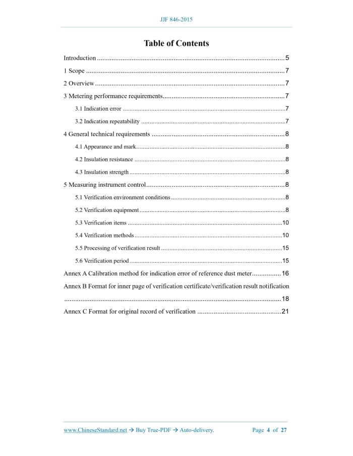 JJG 846-2015: Dust Concentration Measuring Instruments---This is an excerpt. Full copy of true-PDF in English version (including equations, symbols, images, flow-chart, tables, and figures etc.), auto-downloaded/delivered in 9 seconds, can be purchased online: https://www.ChineseStandard.net/PDF.aspx/JJG846-2015JJF NATIONAL METROLOGICAL VERIFICATION REGULATIONS OF THE PEOPLE’S REPUBLIC OF CHINA JJG 846-2015 Dust Concentration Measuring Instruments ISSUED ON: JUNE 15, 2015 IMPLEMENTED ON: DECEMBER 15, 2015 Issued by: General Administration of Quality Supervision, Inspection and Quarantine of the People's Republic of China Table of ContentsIntroduction ... 5 1 Scope ... 7 2 Overview ... 7 3 Metering performance requirements ... 7 3.1 Indication error ... 7 3.2 Indication repeatability ... 7 4 General technical requirements ... 8 4.1 Appearance and mark ... 8 4.2 Insulation resistance ... 8 4.3 Insulation strength ... 8 5 Measuring instrument control ... 8 5.1 Verification environment conditions ... 8 5.2 Verification equipment ... 8 5.3 Verification items ... 10 5.4 Verification methods ... 10 5.5 Processing of verification result ... 15 5.6 Verification period ... 15 Annex A Calibration method for indication error of reference dust meter ... 16 Annex B Format for inner page of verification certificate/verification result notification ... 18 Annex C Format for original record of verification ... 21 Verification Regulation of Dust Concentration Measuring Instrument1 ScopeThis Regulation applies to the first verification, follow-up verification and in-use inspection of dust concentration measuring instruments (hereinafter referred to as dust meters).2 OverviewA dust meter is an instrument used to measure the mass concentration of particulate matter suspended in the air. It can display concentration value or output concentration signal. The principle of the dust meter is mainly to convert the dust concentration signal into an electrical signal by light scattering method, β-ray method and light transmission method, and then display it through the secondary instrument. A dust meter is generally composed of a dust concentration conversion component, a sampling head (including a cutter or separator), an air pump, a power supply, and a circuit. Some dust meters also have structures or functions such as flow meters, sampling time display or setting, sampling volume display or setting, and signal output. According to the measurement range, the dust meter is divided into high concentration dust meter (the measurement range is generally 10mg/m3~1000mg/m3) and low concentration dust meter (the measurement range is generally 0.1mg/m3~10mg/m3).3 Metering performance requirements3.1 Indication error Indication error shall not exceed ±20%. 3.2 Indication repeatability Indication repeatability shall not exceed 10%. For dust meters based on the optical principle, if a standard light-transmitting film plate is used for testing, the repeatability of the indication value shall not be greater than 2%.4 General technical requirements4.1 Appearance and mark 4.1.1 The nameplate of the dust meter shall have the product name, model, exit-factory serial number, date of manufacture, and name of the manufacturer. The domestic dust meter shall have the mark and number of the manufacturing measuring instrument license. Explosion-proof dust meters shall have explosion-proof signs and numbers. 4.1.2 The surface of the dust meter and the sampling head (including the cutter or separator) and other components must not have obvious dents, cracks, deformations and other defects that affect normal operation. 4.1.3 The connection of dust meter is reliable. All knobs and buttons shall be able to operate and control normally. After power on, the display part shall be clear and complete. 4.2 Insulation resistance For dust meters using AC power, the insulation resistance shall not be less than 20MΩ. 4.3 Insulation strength For the dust meter using AC power supply, it shall be able to withstand the voltage with AC effective value of 1500V and frequency of 50Hz. Leakage current is not greater than 5mA. The duration is 1min. There is no flashover or breakdown phenomenon.5 Measuring instrument controlMeasuring instrument control includes initial verification, follow-up verification and inspection in use. 5.1 Verification environment conditions The temperature is (15~30)℃. The relative humidity is not more than 85%. The dust meter shall be stabilized under this condition before it can be verified. 5.2 Verification equipment 5.2.1 High-concentration dust meter verification equipment 5.2.1.1 High-concentration dust generating device When the measurement upper limit of the dust meter under verification is greater than 10mg/m3, a high-concentration dust generating device shall be used. The concentration range is (10~1000) mg/m3. The dust used is dry coal dust, talcum powder or other suitable dust particles. In the test section, the deviation of the average value of three identical measurements at the sampling port of the standard sampling device and the sampling port of the dust meter under verification shall not be greater than 5%. The experimental standard deviation of central point stability (6 consecutive same measurements) shall not be greater than 5%. 5.2.1.2 Standard sampling device The technical requirements are as follows: A pump with less pulsation such as a vane type shall be used as the air source. The flow rate of the air source shall not be less than twice the flow rate of the dust meter. There is a flow buffer device in the gas path. Its buffer volume is not less than the rated sampling volume in 10s of the dust meter. The flowmeter accuracy level is 1.0. 5.2.1.3 Barometer: the measuring range (86~105) kPa; the allowable error limit is ±200Pa. 5.2.1.4 Stopwatch: the division value is 0.01s. 5.2.1.5 Thermometer: the measuring range is (0~50)℃; the division value is 0.1℃. 5.2.1.6 Balance: the division value is 0.1mg. 5
