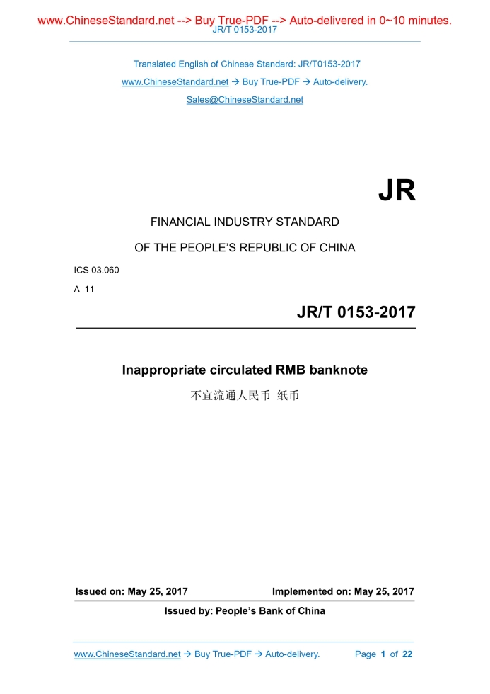 JR/T 0153-2017: Inappropriate circulated RMB banknote Delivery: 9 seconds. True-PDF full-copy in English & invoice will be downloaded + auto-delivered via email. See step-by-step procedure Status: Obsolete JR/T 0153: Historical versions