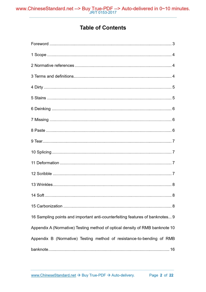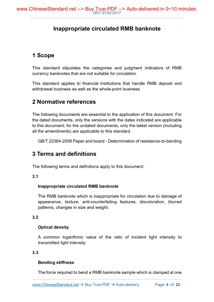 Similar standardsJR/T 0153-2017: Inappropriate circulated RMB banknote---This is an excerpt. Full copy of true-PDF in English version (including equations, symbols, images, flow-chart, tables, and figures etc.), auto-downloaded/delivered in 9 seconds, can be purchased online: https://www.ChineseStandard.net/PDF.aspx/JRT0153-2017FINANCIAL INDUSTRY STANDARD ICS 03.060 A 11 Inappropriate circulated RMB banknote Issued on: MAY 25, 2017 Implemented on: MAY 25, 2017 Issued by. People’s Bank of China Table of ContentsForeword... 3 1 Scope... 4 2 Normative references... 4 3 Terms and definitions... 4 4 Dirty... 5 5 Stains... 5 6 Deinking... 6 7 Missing... 6 8 Paste... 6 9 Tear... 7 10 Splicing... 7 11 Deformation... 7 12 Scribble... 7 13 Wrinkles... 8 14 Soft... 8 15 Carbonization... 8 16 Sampling points and important anti-counterfeiting features of banknotes... 9 Appendix A (Normative) Testing method of optical density of RMB banknote 10 Appendix B (Normative) Testing method of resistance-to-bending of RMB banknote... 16 Inappropriate circulated RMB banknote1 ScopeThis standard stipulates the categories and judgment indicators of RMB currency banknotes that are not suitable for circulation. This standard applies to financial institutions that handle RMB deposit and withdrawal business as well as the whole-point business.2 Normative referencesThe following documents are essential to the application of this document. For the dated documents, only the versions with the dates indicated are applicable to this document; for the undated documents, only the latest version (including all the amendments) are applicable to this standard. GB/T 22364-2008 Paper and board - Determination of resistance-to-bending3 Terms and definitionsThe following terms and definitions apply to this document. 3.1 Inappropriate circulated RMB banknote The RMB banknote which is inappropriate for circulation due to damage of appearance, texture, anti-counterfeiting features, discoloration, blurred patterns, changes in size and weight. 3.2 Optical density A common logarithmic value of the ratio of incident light intensity to transmitted light intensity. 3.3 Bending stiffness The force required to bend a RMB banknote sample which is clamped at one6 DeinkingThe RMB banknotes which have partial or complete fading of the surface are inappropriate circulated RMB banknotes under one of the following conditions. - A deinking occurs on the surface of the banknote; the deinking area is more than 100 mm2; - There are many deinking places on the surface of the banknote; the accumulated deinking area is more than 80 mm2; - Although the deinking area on the surface of banknote does not exceed the above criteria, one of the important anti-counterfeiting features is severely deinked, which affects the anti-counterfeiting function.7 MissingThe RMB banknote which has surface missing is inappropriate circulated RMB banknote under one of the following conditions. - The banknote surface (excluding 4 corners and security line) is missing, the missing area at one place is more than 10 mm2; or otherwise there is multiple missing places on the surface of banknote, the cumulative missing area is more than 12 mm2 (it is included in the accumulative amount when the missing area is more than 2 mm2); - The banknote has a single missing-corner, the area of missing-corner is more than 20 mm2; or otherwise the banknote has multiple missing-corners, the accumulative area of missing-corners is more than 30 mm2; - The missing security line of banknote is more than 10 mm, or otherwise one of the important anti-counterfeiting features is missing, which affect the anti- counterfeiting function.8 PasteThe RMB banknotes which are affixed with tape, paper, other substances, that cannot be removed without damaging the surface of banknote, are inappropriate circulated RMB banknotes under one of the following conditions. - A paste appears on the surface of banknote; the area of paste is more than 100 mm2; - There are multiple pastes on the surface of banknote; the cumulative area of paste is more than 60 mm2; - Although the area of the paste does not exceed the prescribed criteria, it covers one of the important anti-counterfeiting features, which affect the anti-counterfeiting function.9 TearThe RMB banknotes which are torn in the surface are inappropriate circulated RMB banknotes under one of the following conditions. - There is a tear in the surface of the banknote; the tear length is more than 10 mm; - There are multiple tears on the surface of banknote, the shortest tear length is more than 3 mm, the cumulative tear length is more than 9 mm.10 SplicingA RMB banknote which has more than 2 (inclusive) damages, is connected as before through pasting, is inappropriate circulated RMB banknote.11 DeformationA RMB banknote which has change in shape and size, a deviation between the long side of banknote and the standard specification of more than 2%, or a deviation between the wide side of the banknote and the standard specification of more than 4%, is inappropriate circulated RMB banknote.12 ScribbleThe RMB banknotes which have artificial text, pictures, symbols, or other marks are inappropriate circulated RMB banknotes under one of the following conditions. - There is one place of scribble; the scribble area is more than 200 mm2; - There are many places of scribbles; the cumulative scribble area is more than 100 mm2; - Although the scribble area of the banknote surface does not exceed the prescribed criteria, it covers one of the important anti-counterfeiting features, which affects the anti-counterfeiting function. The scribble area in this standard is calculated according to the area of the banknote as enclosed by the connection of the edges of the artificial text,Appendix B(Normative) Testing method of resistance-to-bending of RMB banknote B.1 Testing equipment Instruments. PTI resistance-to-bending tester, L&W resistance-to-bending tester. Standard. Refer to the tes